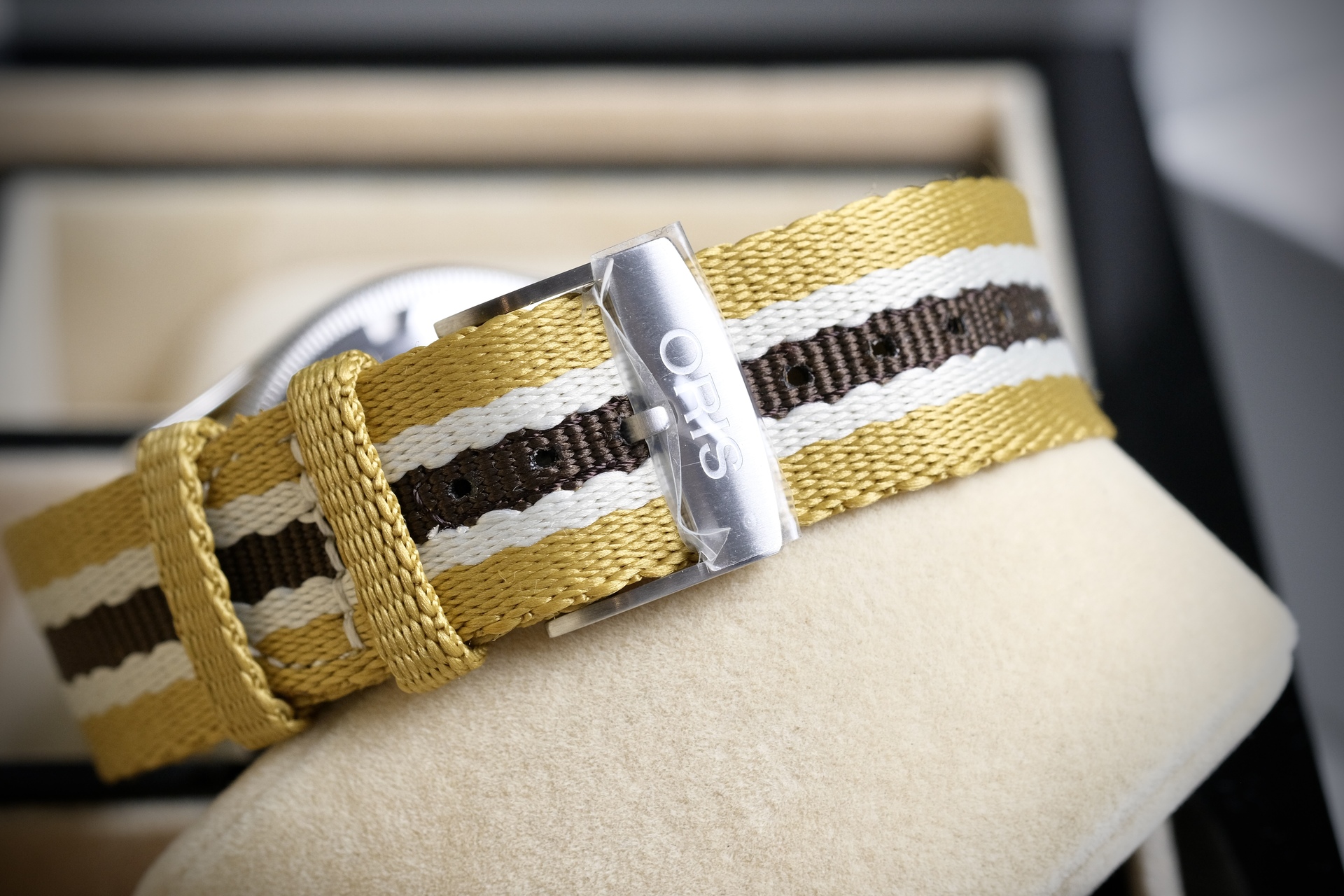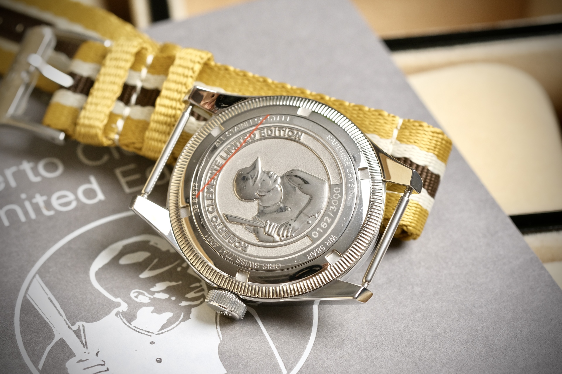 มาในหน้าปัด ขาวครีมเลขอารบิกสีทองและฟังก์ชัน pointer date ส่วนสาย NATO โทนขาว–ทอง–น้ำตาล ได้แรงบันดาลใจจากชุดแข่งของ Clemente เอง ให้กลิ่นอายย้อนยุคแต่ร่วมสมัยในคราวเดียวกัน กลไกระบบ Automatic