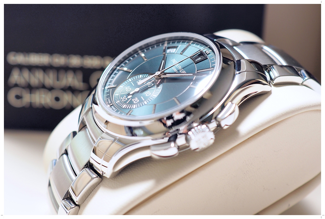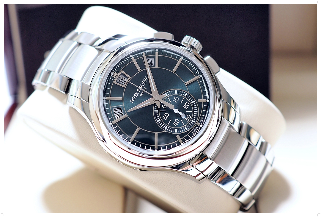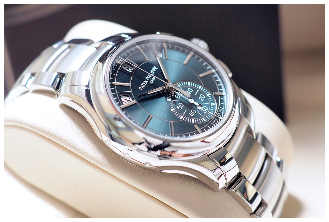 ขนาดนาฬิกา 42mm ใส่เต็มข้อสวยขั้นสุด ตัวเรือนและสาย Stainless Steel ดู Sporty มากๆ หน้าปัดสี Olive Green Sunburst เล่นแสงสวยอลังการ มาพร้อม Function ทั้ง Annual Calendar + Chronograph Flyback + Day/Night Indicator ที่อัดแน่นลงไปบนหน้าปัดได้อย่างสวยงามลงตัว กระจก Sapphire แบบ Double Anti-Reflection Coating ทั้งหน้าหลัง หลังเครื่องโชว์ Rotor ทองคำ 21k อย่างสวยงาม ราคา Price List วันนี้ 2.37 ล้านบาท EMITTIME เสนอราคาของใหม่ Brand New เรือนนี้ต่ำป้ายเกินล้านบาทครับ!