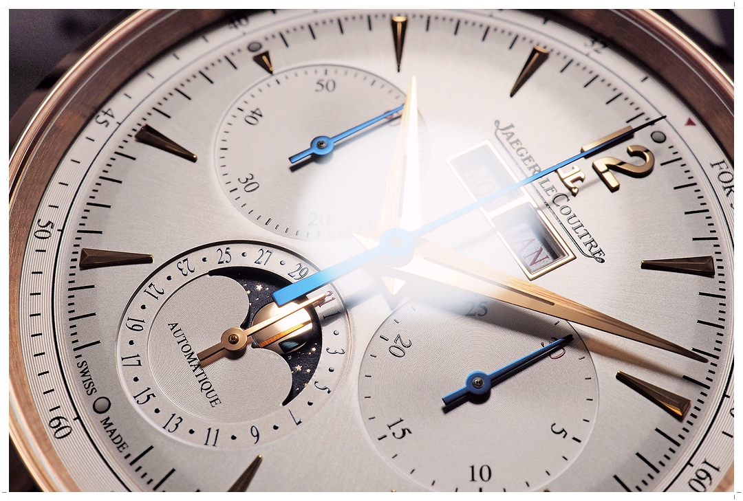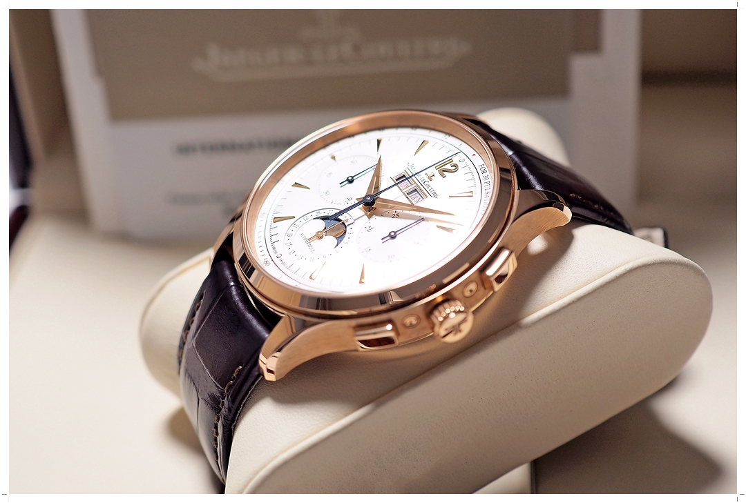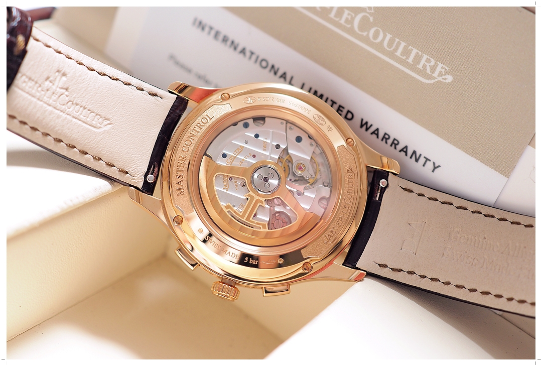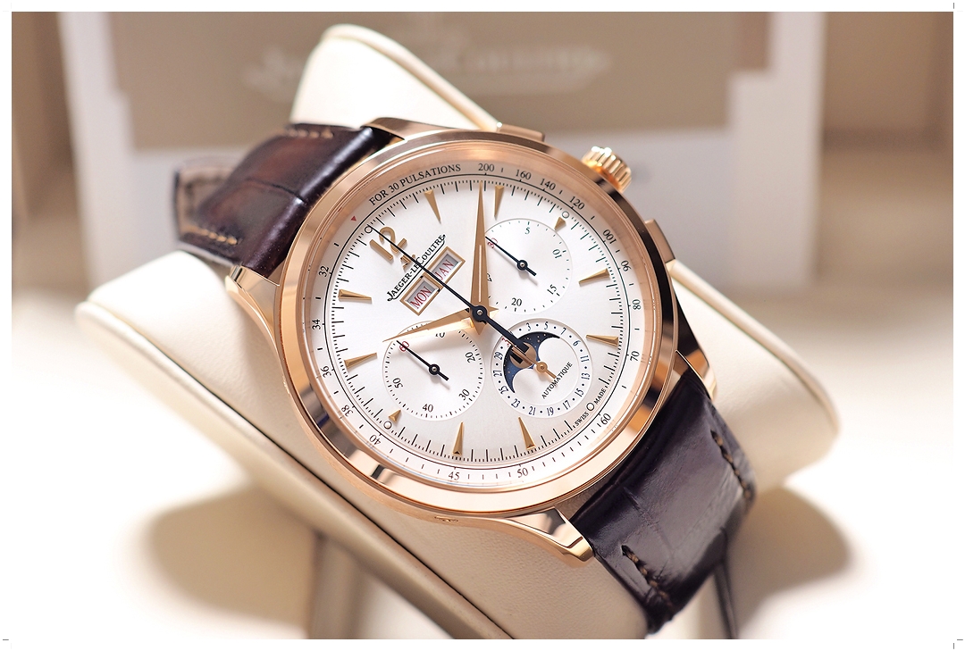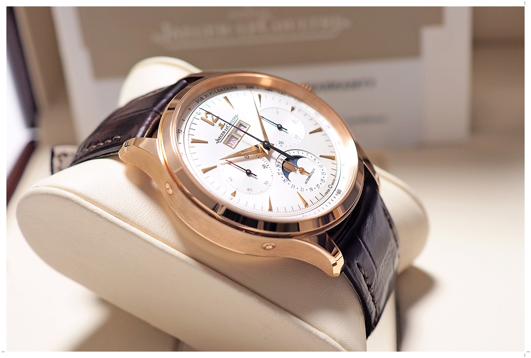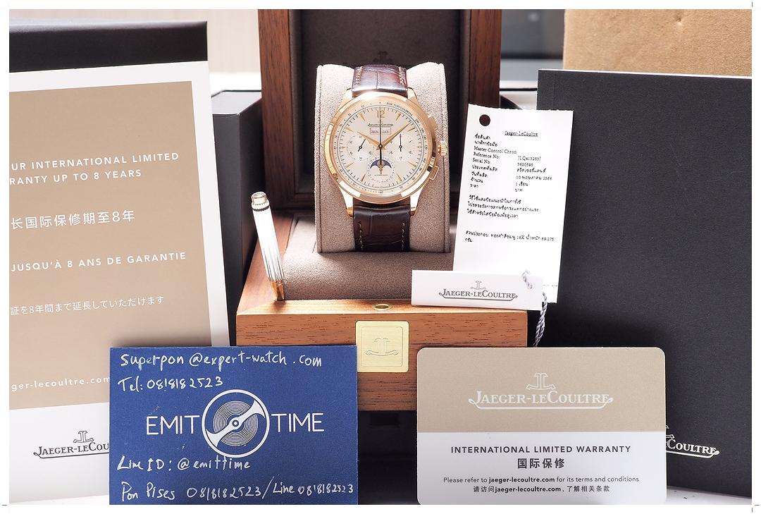 JLC Master Control Chronograph Complete Calendar Pink Gold 18k โฉมนี้เป็น Boutique Edition ที่หาได้ยากมากๆในท้องตลาด ถือเป็นรุ่น Top-Class ที่สุดของ Master Control Collection สีหน้าต่างของวันและเดือนเป็นสีแดงตัดกับ Pink Gold อย่างลงตัว Moonphase มีการออกแบบใหม่ทั้งหมดให้ส่วนของท้องฟ้าดูหรูหราขึ้น พระจันทร์วัสดุเป็น Pink Gold 18k รวมถึง Badge โลโก้ที่จากเดิมเป็น Screen เปลี่ยนเป็นโลโก้ JL ตัวนูน ขนาดตัวเรือน 40mm ขึ้นข้อสวยทุกคน หน้าปัดขาว Off-White ตัดกับตัวเรือน Pink Gold 18k และสาย Alligator สีน้ำตาลไหม้ได้อย่างสมบูรณ์แบบ เข็มเวลาทองคำ Pink Gold 18k ตัดกับเข็ม Chronograph Blue Steel อย่างหรูหรา ใส่สวยหรูทุกการแต่งตัว EMITTIME เสนอราคาหั่นจากป้ายเกือบ 50%