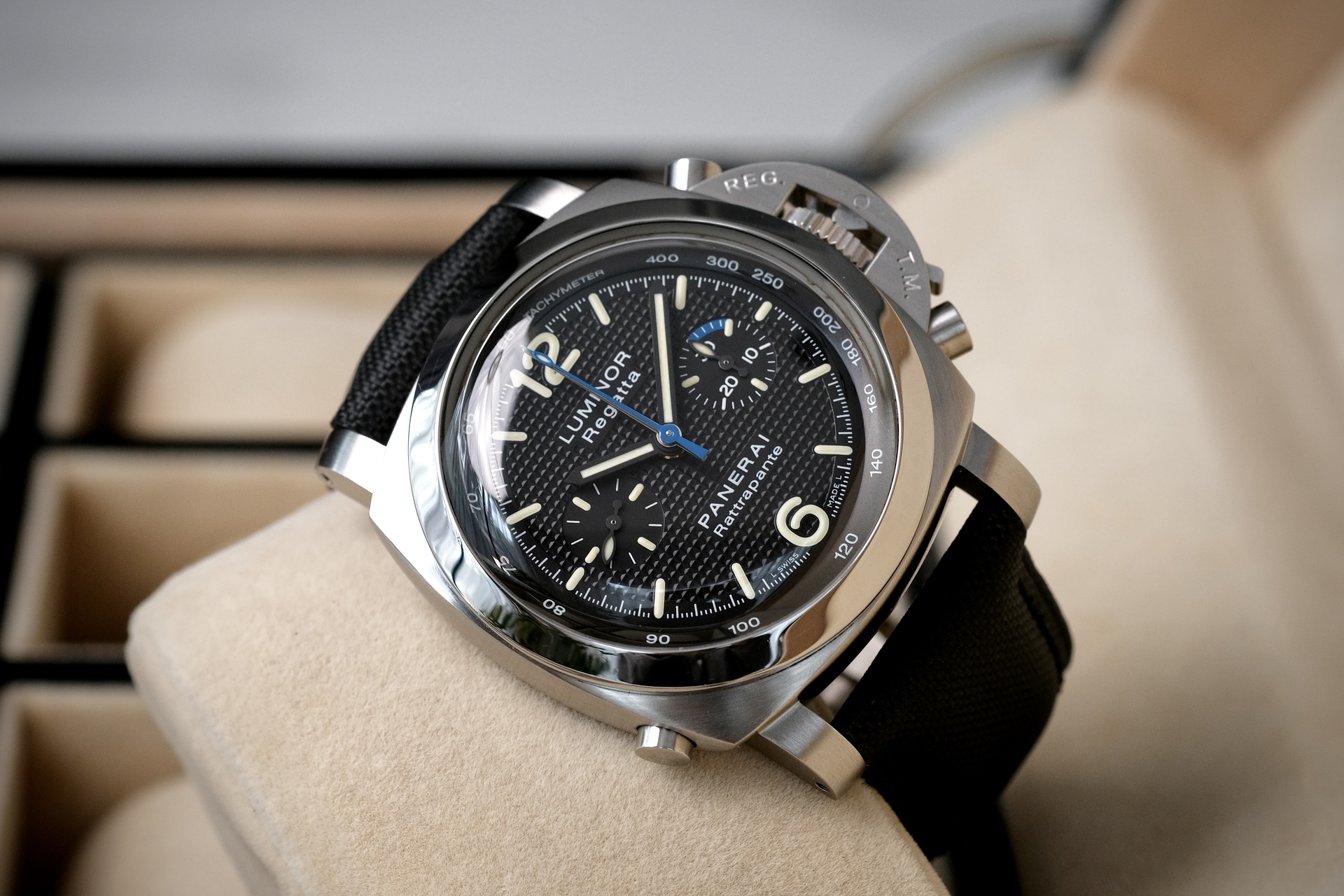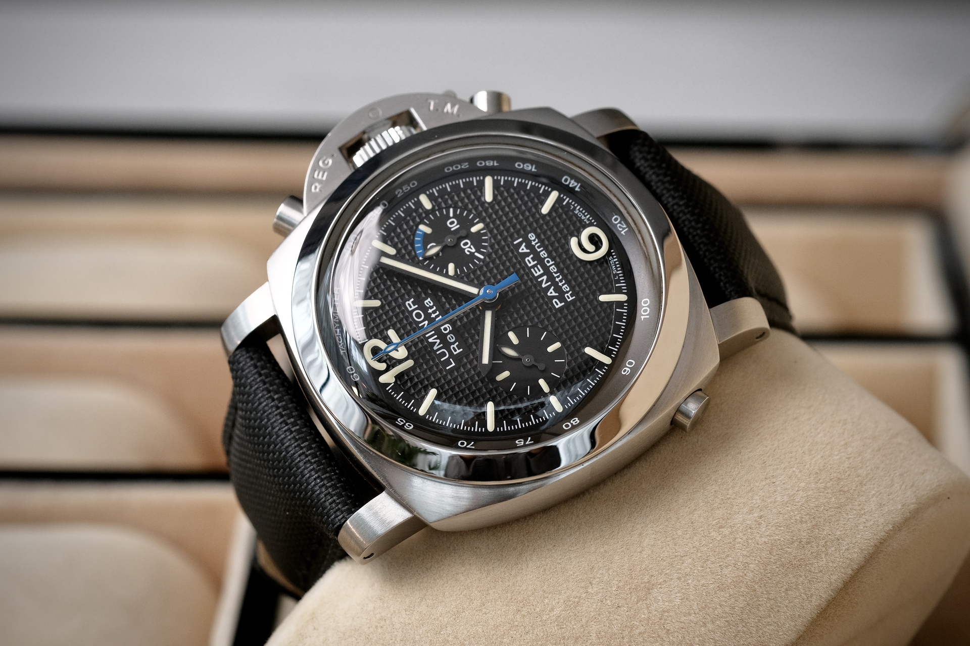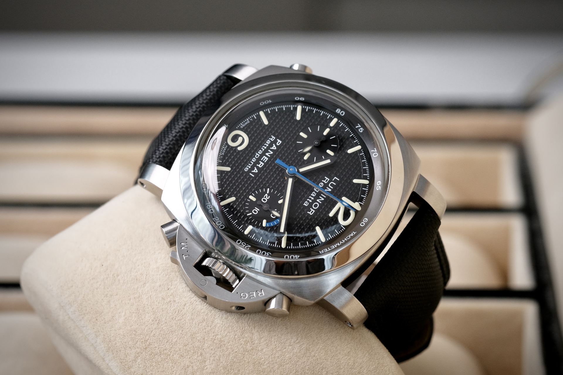 ขนาด 44mm รุ่นพิเศษผลิตปีเดียว จัดเป็น “Collector’s Piece” และสะท้อนกลิ่นอายความสปอร์ตของการแล่นเรือใบอย่างแท้จริง พร้อมกลไกที่ “ซับซ้อน” ที่สุดอย่างหนึ่งในตระกูล Luminor คือ Split-Seconds ช่วยให้จับเวลาสองเหตุการณ์ที่เริ่มพร้อมกันได้ หน้าปัดดำ Clous de Paris ตัดกับเข็มวินาทีน้ำเงินลงตัวสุดๆ กลไกระบบ Automatic หลังเปลือย ผลิตเพียง 500 เรือนเท่านั้น