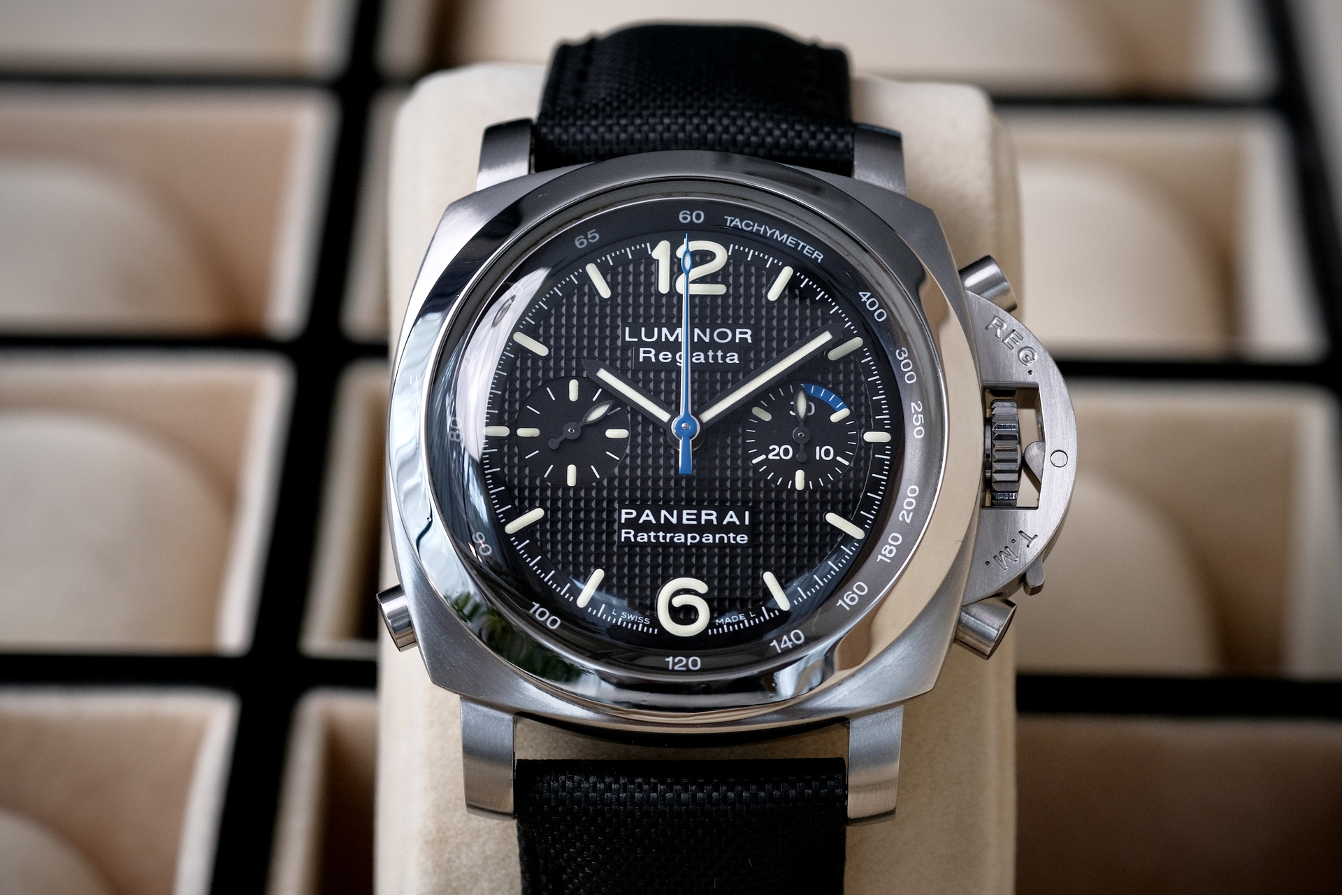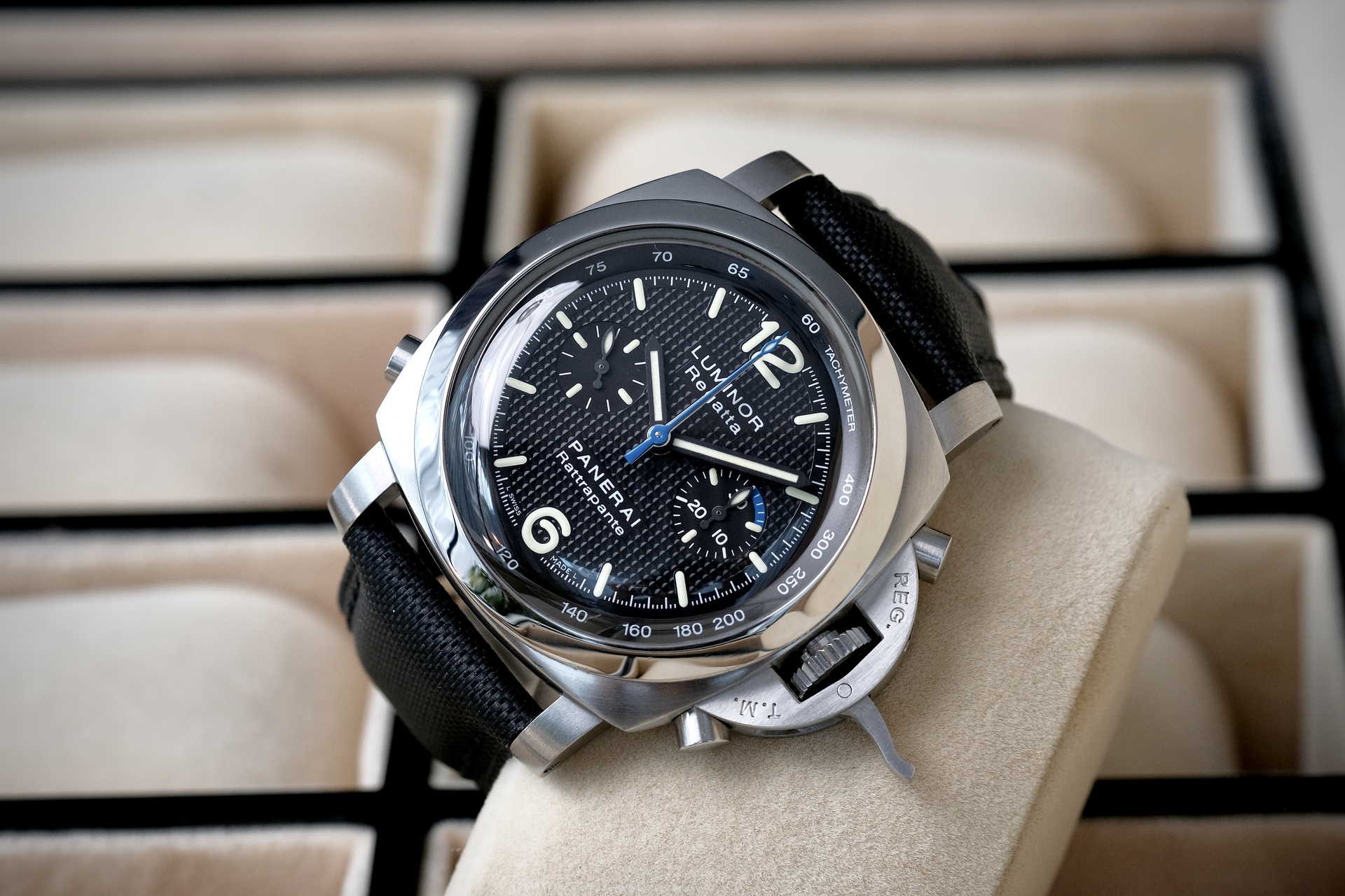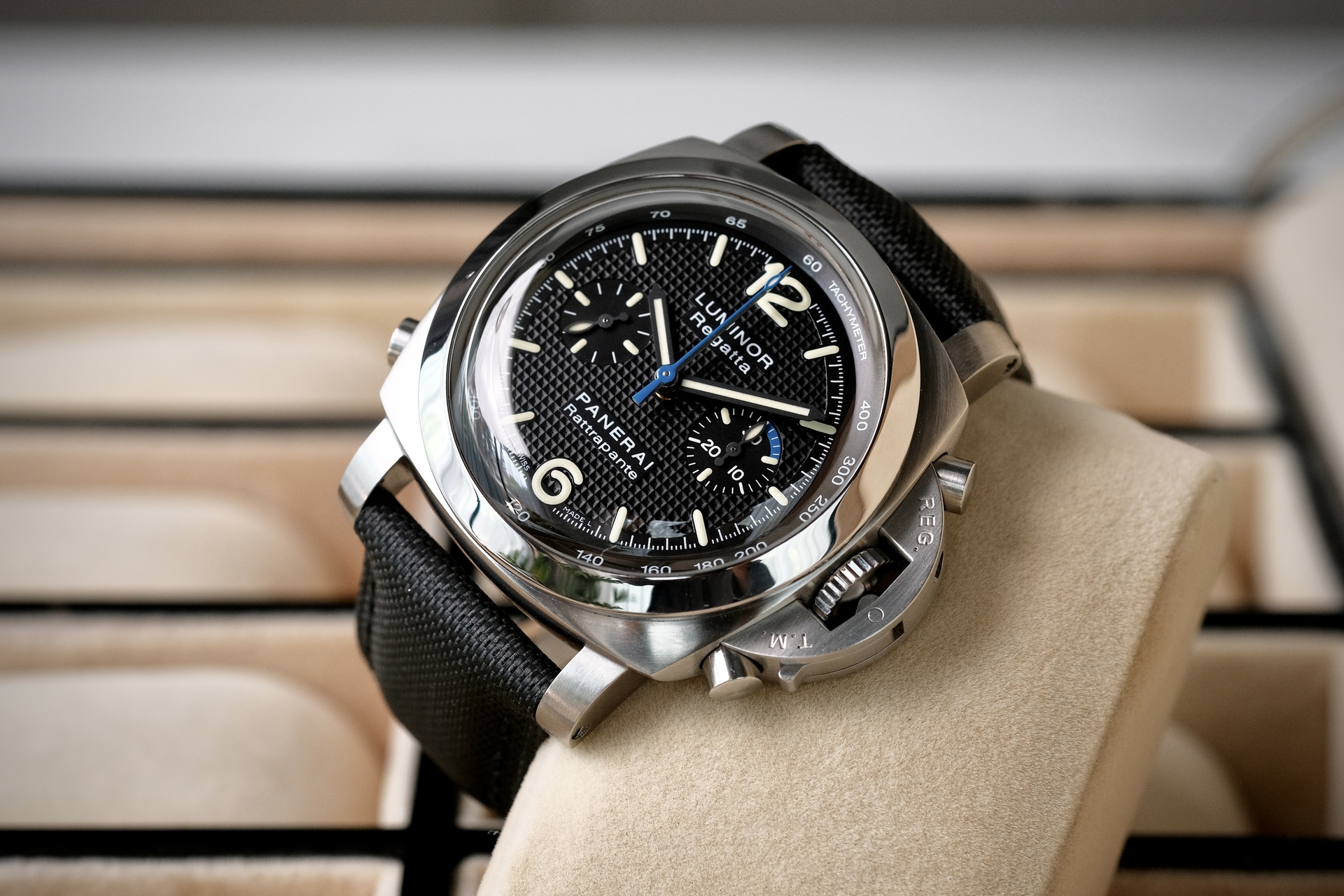 ขนาด 44mm รุ่นพิเศษผลิตปีเดียว จัดเป็น “Collector’s Piece” และสะท้อนกลิ่นอายความสปอร์ตของการแล่นเรือใบอย่างแท้จริง พร้อมกลไกที่ “ซับซ้อน” ที่สุดอย่างหนึ่งในตระกูล Luminor คือ Split-Seconds ช่วยให้จับเวลาสองเหตุการณ์ที่เริ่มพร้อมกันได้ หน้าปัดดำ Clous de Paris ตัดกับเข็มวินาทีน้ำเงินลงตัวสุดๆ กลไกระบบ Automatic หลังเปลือย ผลิตเพียง 500 เรือนเท่านั้น