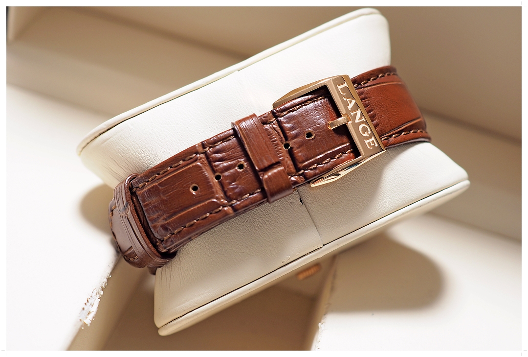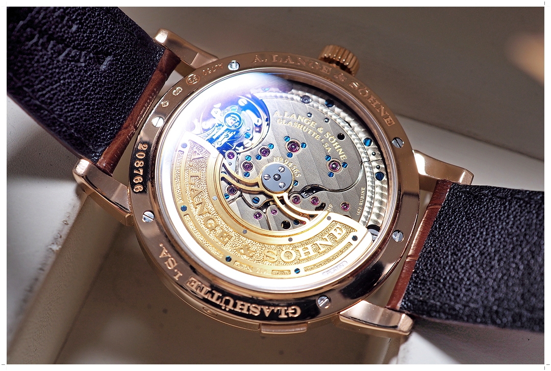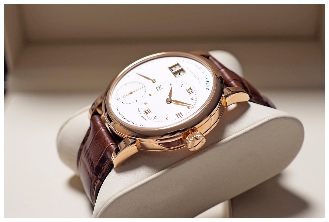 ทางเลือกเพียงหนึ่งเดียวสำหรับคนที่ต้องการสะสม Lange 1 Collection และไม่ต้องการระบบไขลาน ต้องโมเดลนี้ครับ มาด้วยกลไก Automatic พร้อมฟังค์ชั่นหน้าต่างบอก “Day” ของสัปดาห์ที่ด้านซ้าย วันที่ Big Date เข็มวินาที และเข็มหลัก วาง Layout แบบ Off-Center ตามแบบฉบับของ Lange 1 ที่ Mirror สลับข้าง ซ้าย/ขวา จากโมเดลไขลานทั่วไป แสดงความเป็นเอกลักษณ์ของ “Daymatic” อย่างโดดเด่น ตัวเรือน Pink Gold 18k ขนาด 39.5mm ใส่เต็มข้อสวยพอดีมากๆ ไม่เล็กไป ไม่ล้นกาง ดูสง่างามหรูหราทุกมุมมอง สายหนัง Alligator A. Lange Original สีน้ำตาลเข้ากับตัวเรือน Pink Gold อย่างลงตัว หลังเครื่องโชว์งานแกะสลักระดับ World-Class สวยหาที่ติไม่ได้ ราคา Price List สุดท้ายก่อน Discon สูงถึง 1.75 ล้านบาท EMITTIME เสนอราคาเรือนนี้ต่ำป้ายเกินครึ่งราคาครับ!