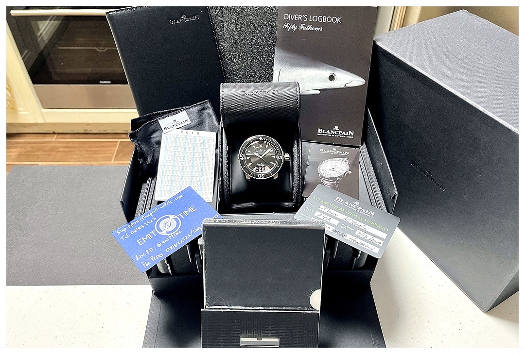 อุปกรณ์ Full-Set ไม่ต่างกับออกจากช็อปด้วยตนเอง กล่องชั้นนอก กล่องชั้นใน คู่มือ x 3 ผ้าเช็ดนาฬิกาจาก Blancpain ที่ไม่เคยผ่านการใช้งาน International Warranty Card ลง Jul-2019 ครบยันปฏิทินและกระดาษปิดฝากล่อง