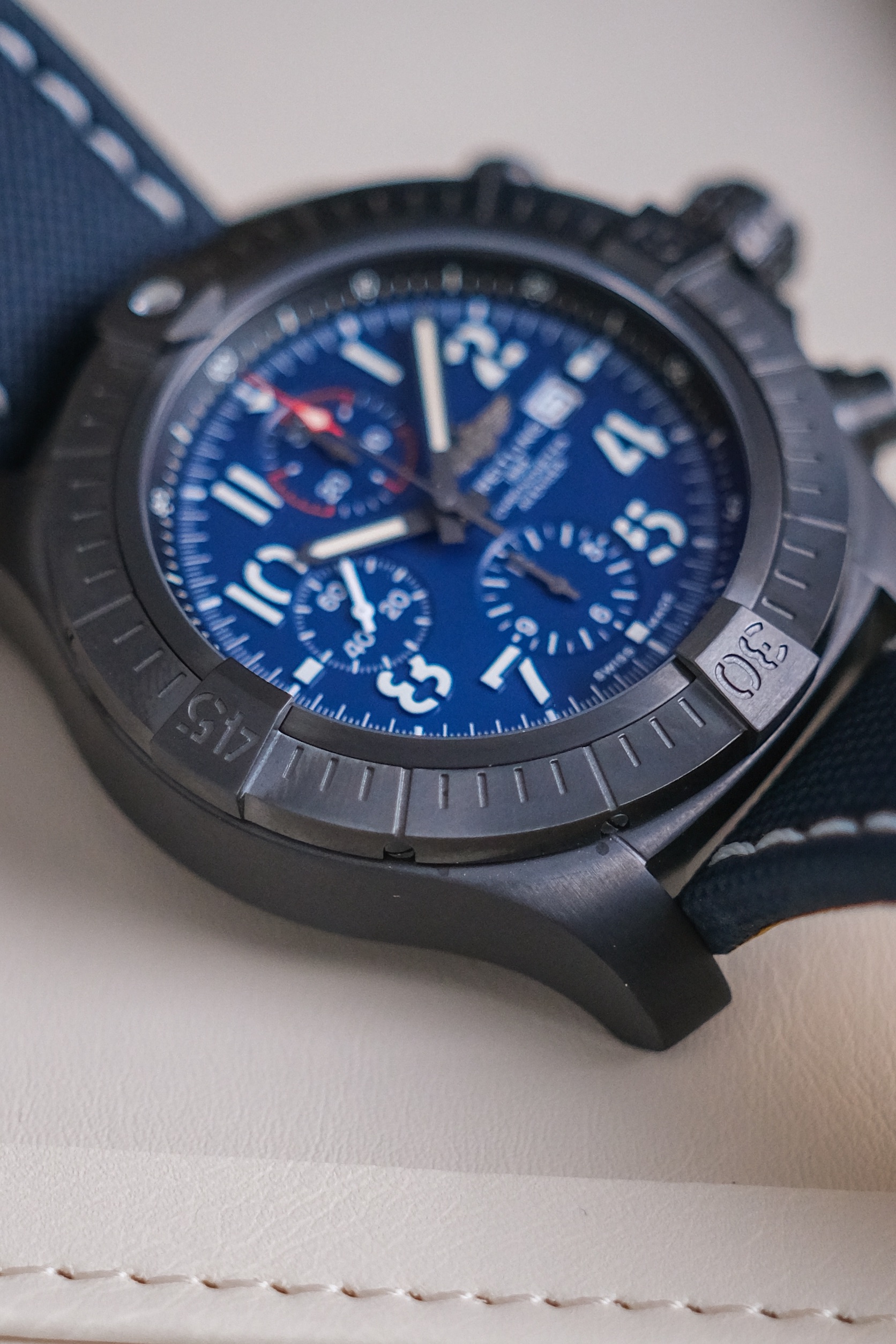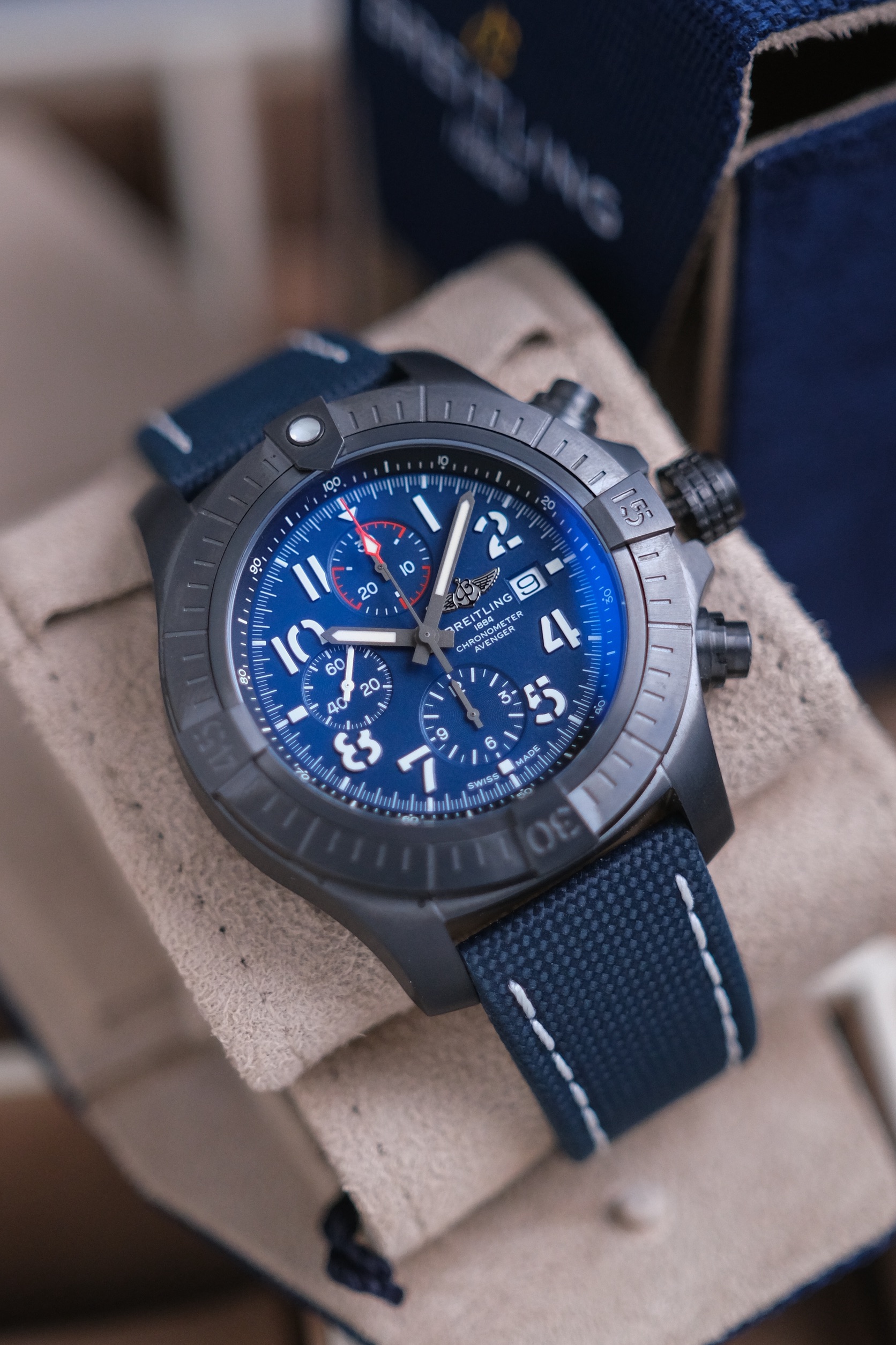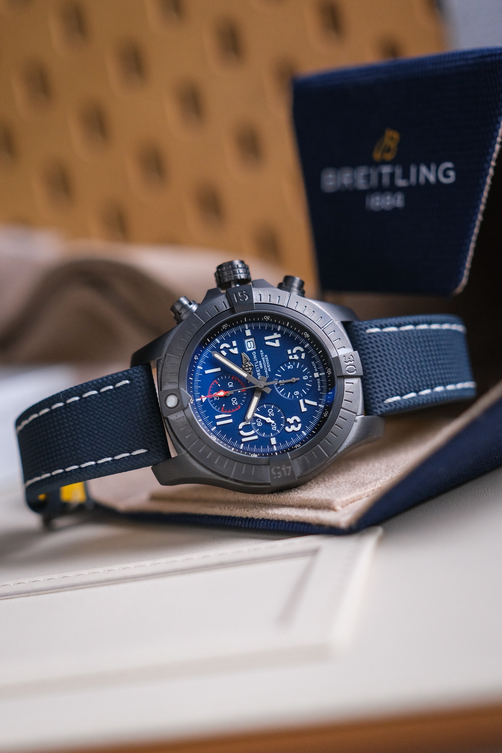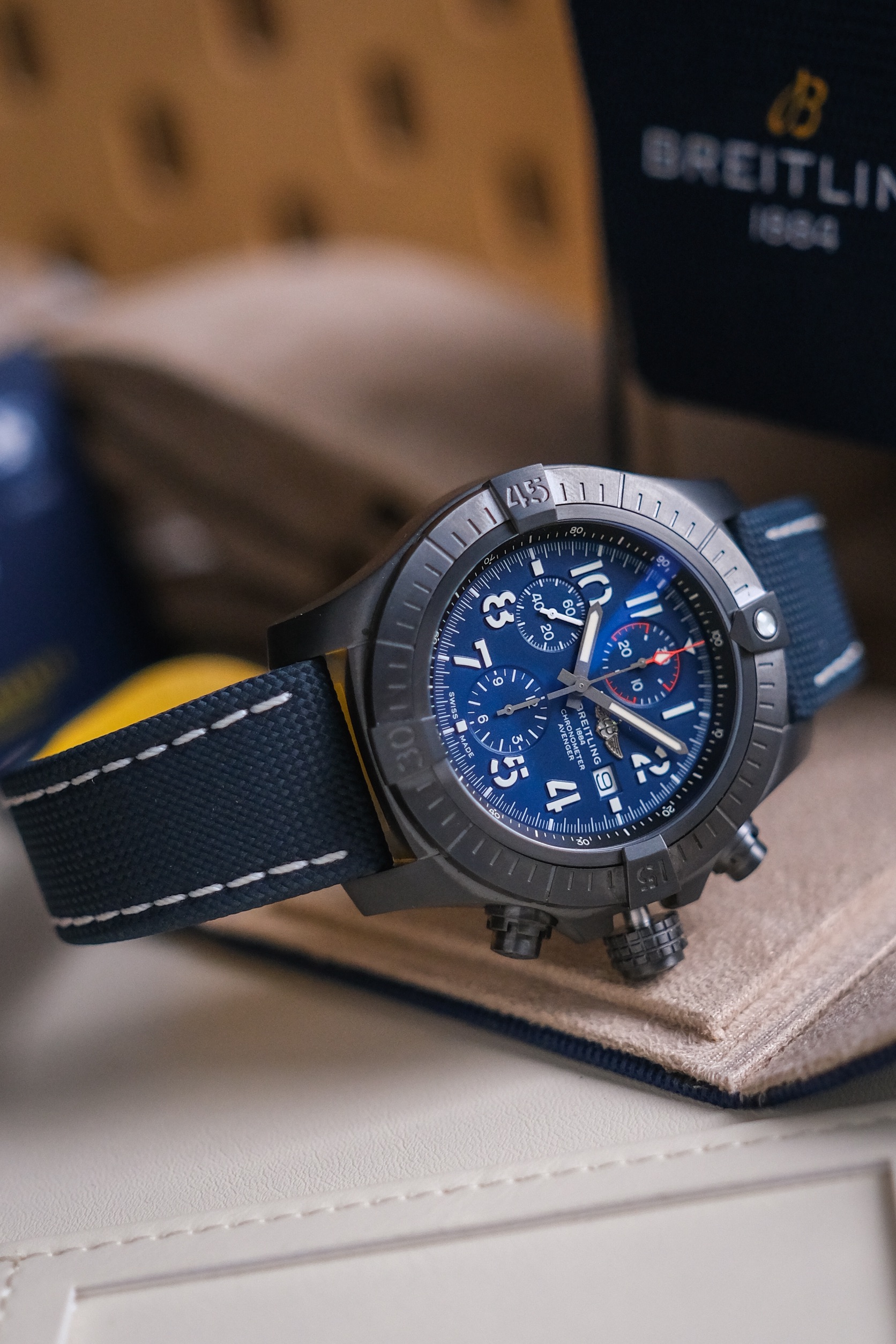 ✨ ขนาด 48 mm. ตัวเรือน Titanium ดมดำ DLC หน้าปัด Blue Dial ตัวเลขอารบิกเรืองแสงขนาดใหญ่ กระจกแซฟไฟร์ กันน้ำ 300 เมตร กลไก Automatic Breitling Calibre 13 (COSC) ฟังก์ชัน Chronograph + Date ใส่กับสายหนังบุผ้า บอกเลยอย่างเท่