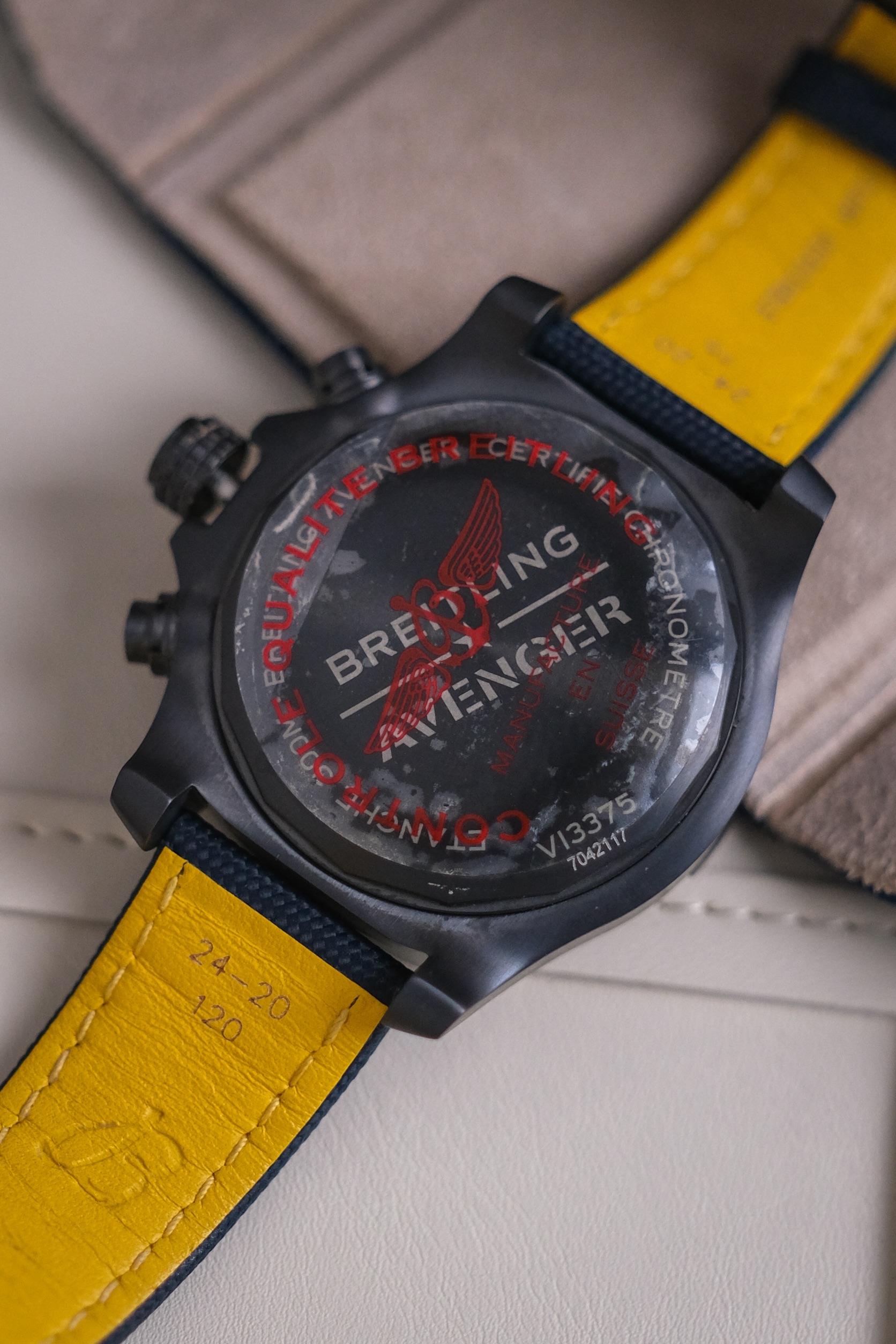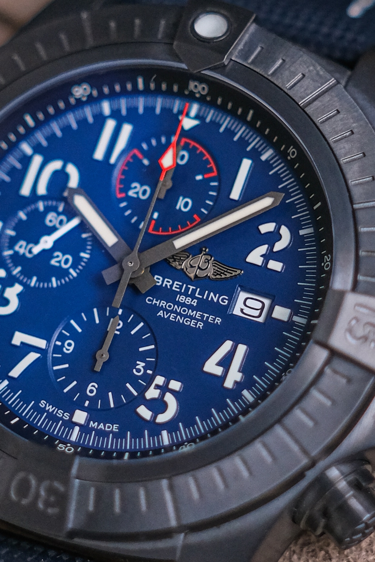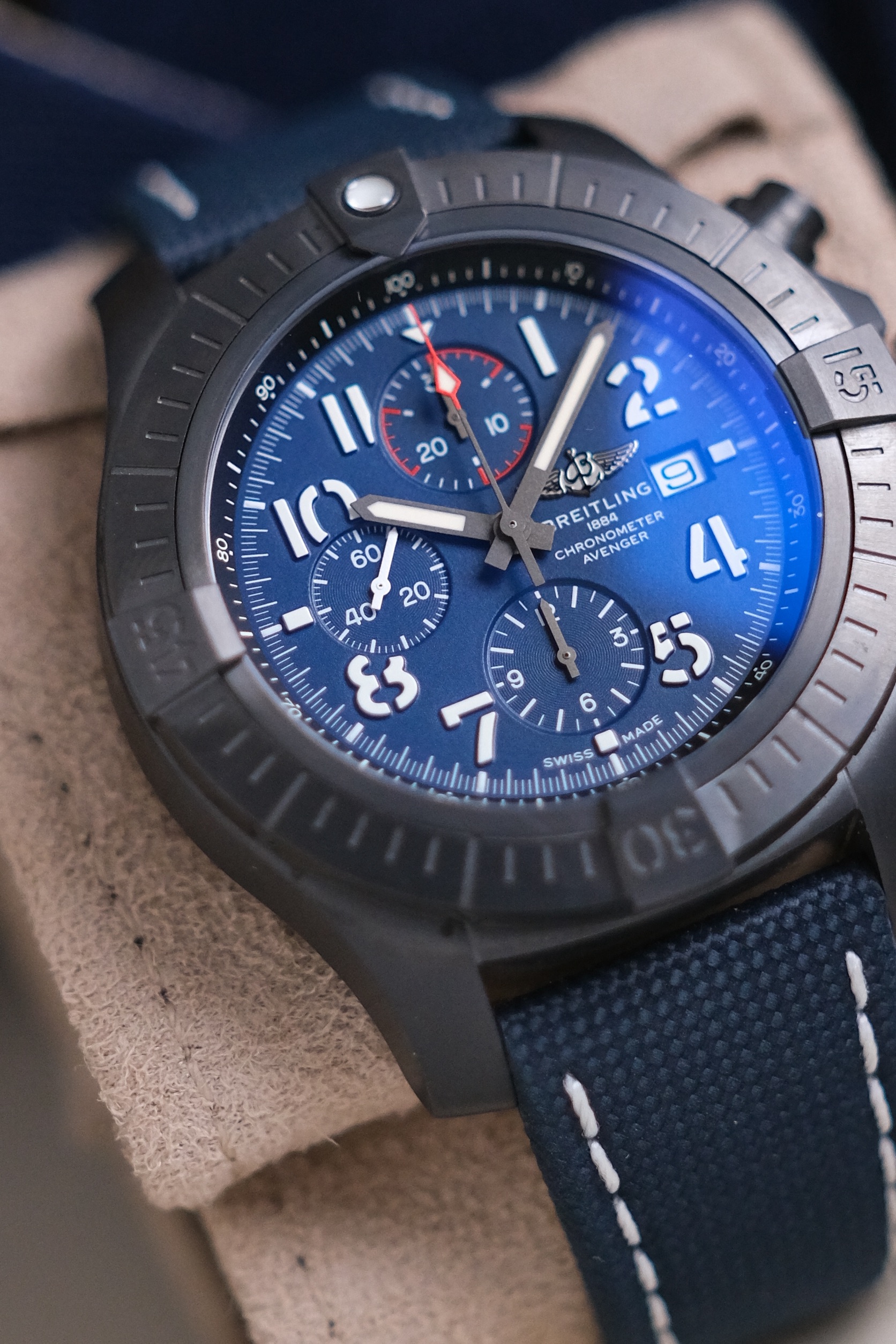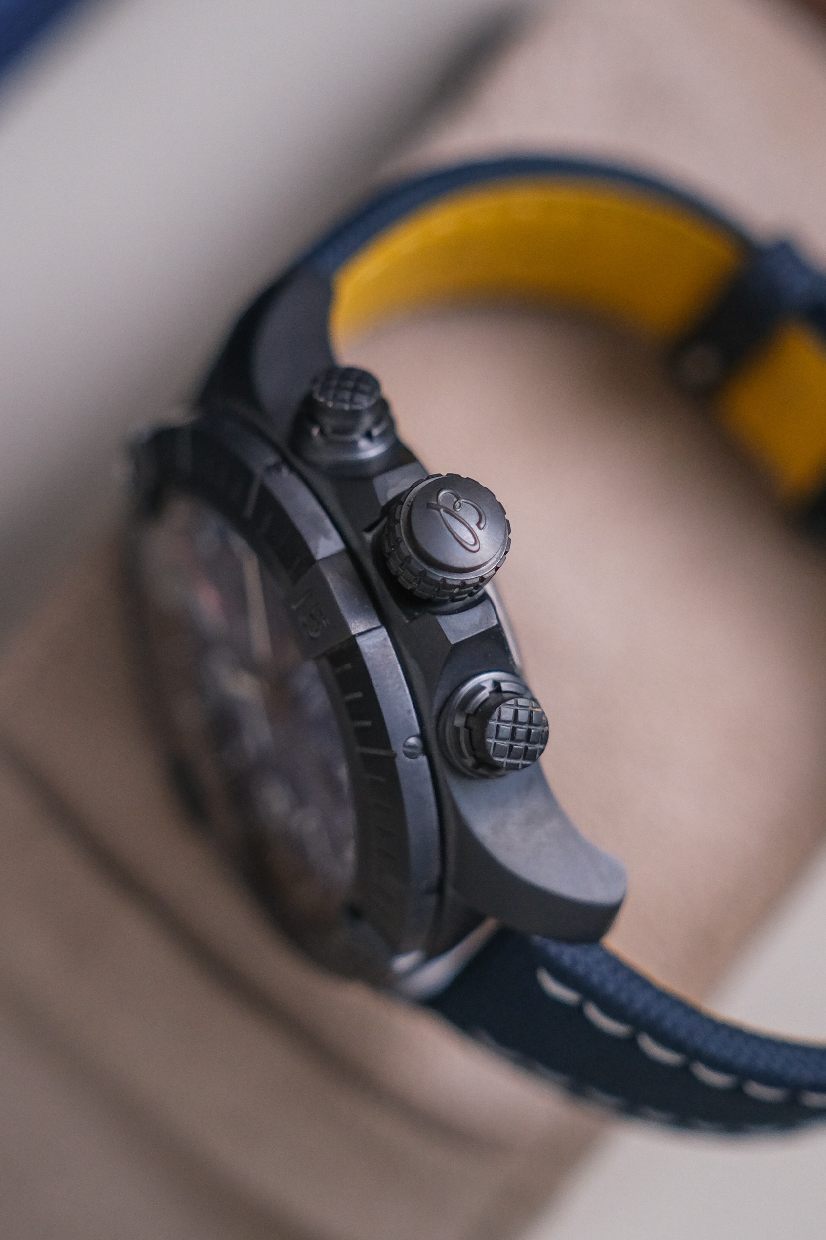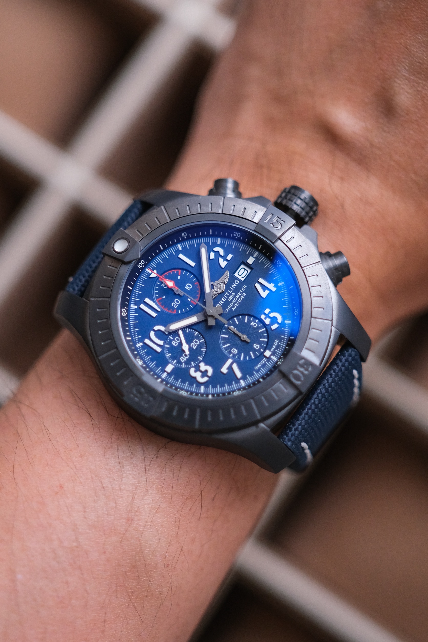 ✨ ขนาด 48 mm. ตัวเรือน Titanium ดมดำ DLC หน้าปัด Blue Dial ตัวเลขอารบิกเรืองแสงขนาดใหญ่ กระจกแซฟไฟร์ กันน้ำ 300 เมตร กลไก Automatic Breitling Calibre 13 (COSC) ฟังก์ชัน Chronograph + Date ใส่กับสายหนังบุผ้า บอกเลยอย่างเท่
