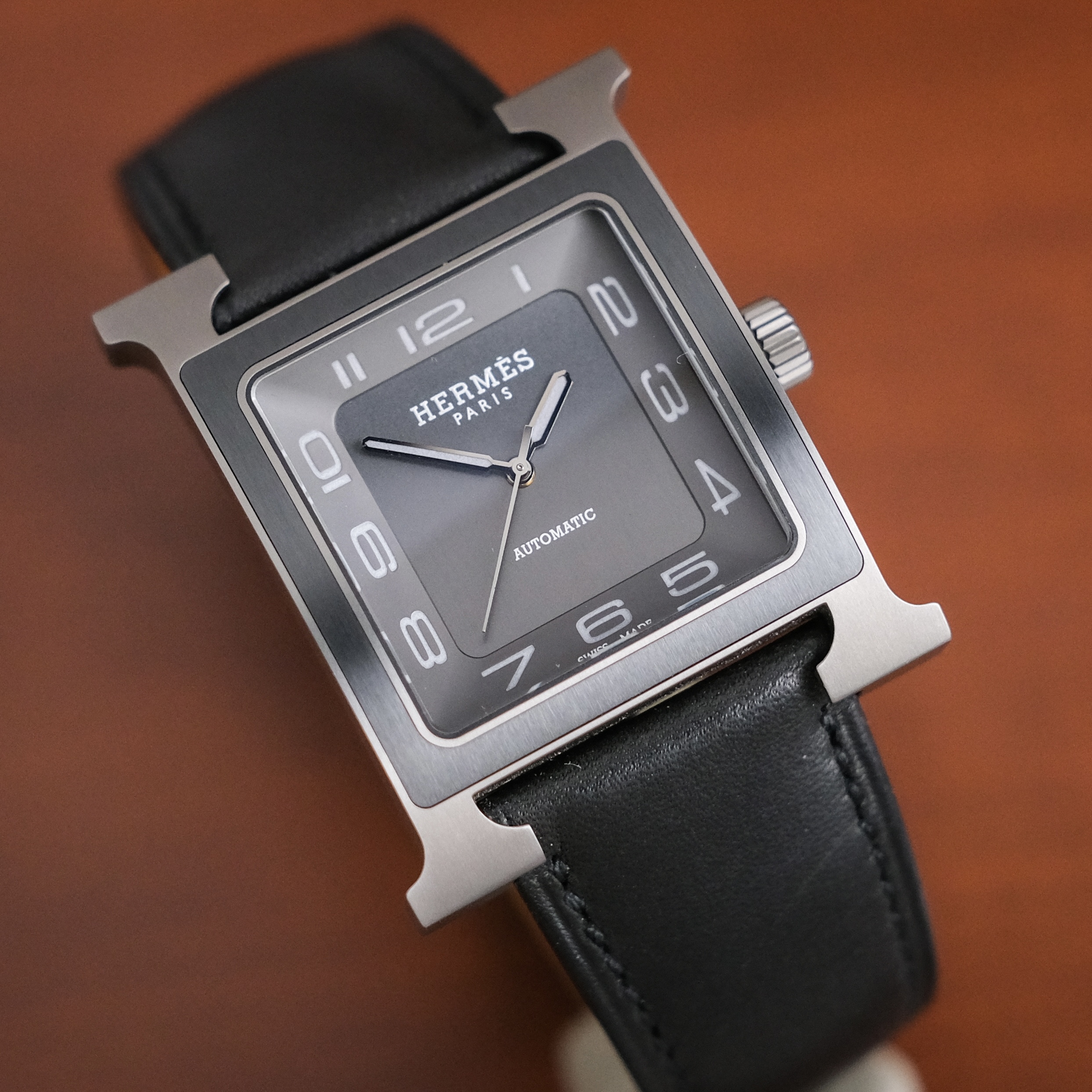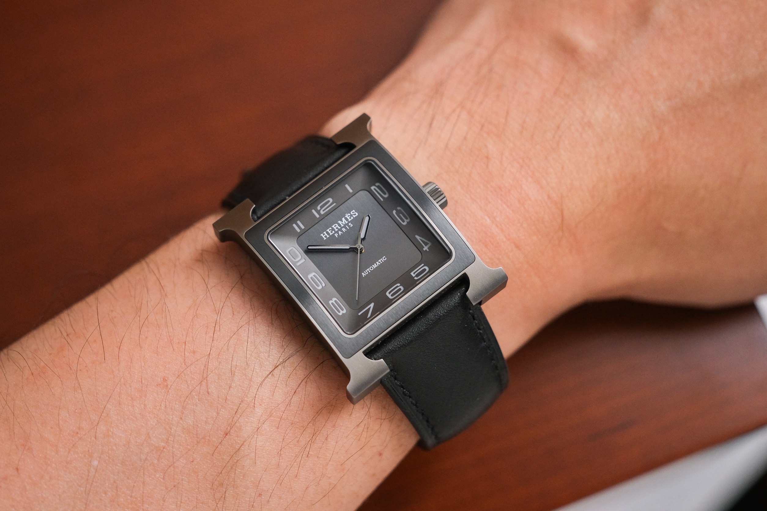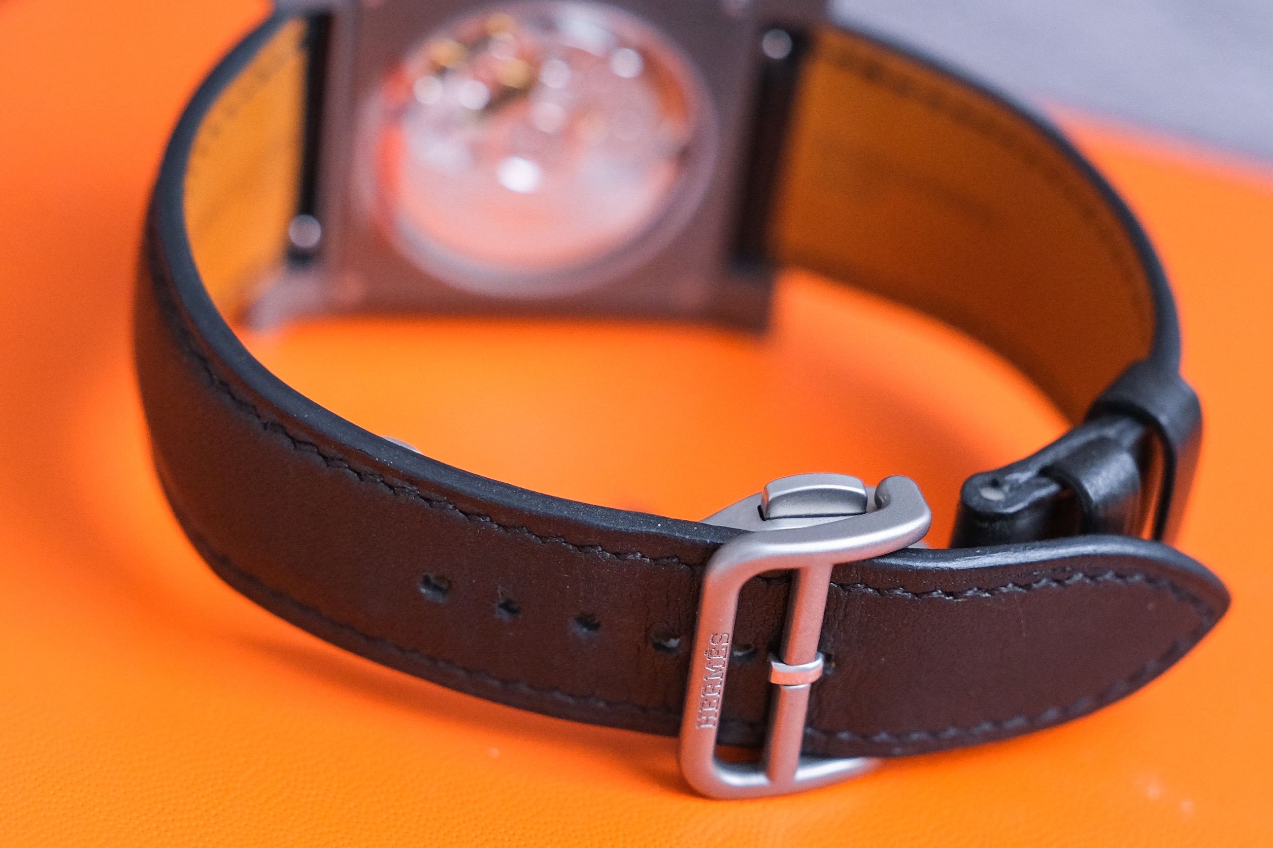 🐎 ขนาด 41 x 34 mm ตัวเรือน Titanium ดีไซน์ตัว “H” ไอคอนของแบรนด์ Hermes โดดเด่นด้วยงานปัดซาตินทั้งเรือนตัดกับขอบสีดำ หน้าปัดดำเล่นมิติด้วยการไล่พื้นผิวทั้งเงาและด้าน ให้ลุคเรียบ เท่ แต่มีรายละเอียด หลังเปลือยเห็นเครื่องอัตโนมัติ Cal. H1912 สำรองพลังงานประมาณ 45 ชั่วโมง ฟังก์ชัน 3 เข็ม ใช้งานง่าย ใส่ได้ทุกวัน
