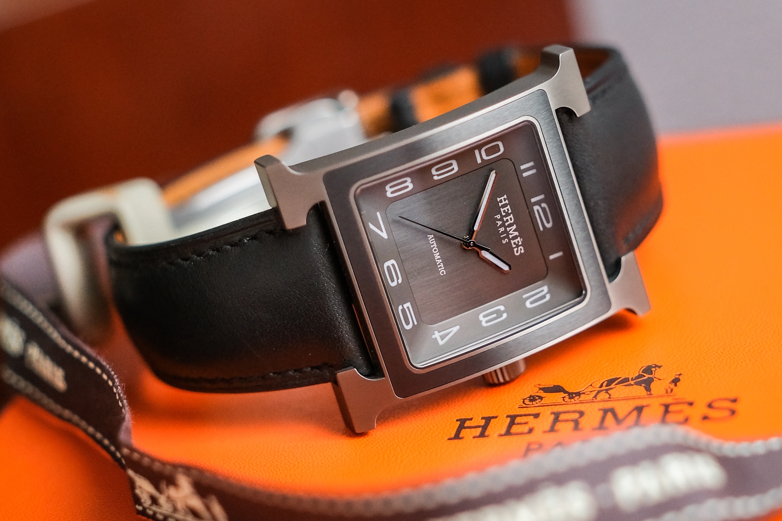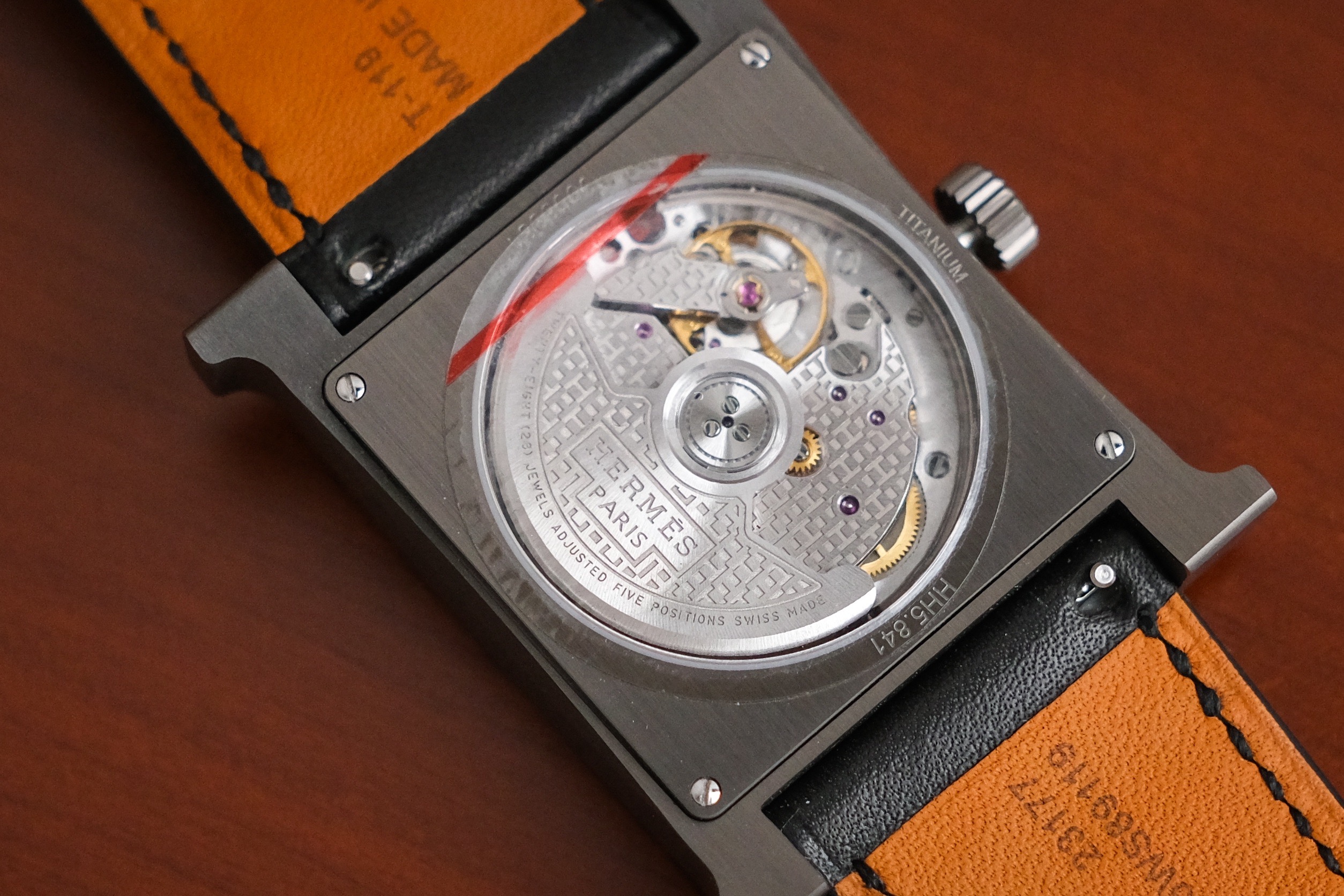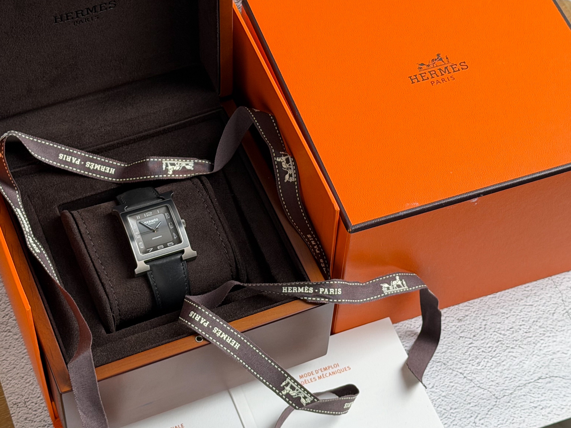 🐎 ขนาด 41 x 34 mm ตัวเรือน Titanium ดีไซน์ตัว “H” ไอคอนของแบรนด์ Hermes โดดเด่นด้วยงานปัดซาตินทั้งเรือนตัดกับขอบสีดำ หน้าปัดดำเล่นมิติด้วยการไล่พื้นผิวทั้งเงาและด้าน ให้ลุคเรียบ เท่ แต่มีรายละเอียด หลังเปลือยเห็นเครื่องอัตโนมัติ Cal. H1912 สำรองพลังงานประมาณ 45 ชั่วโมง ฟังก์ชัน 3 เข็ม ใช้งานง่าย ใส่ได้ทุกวัน