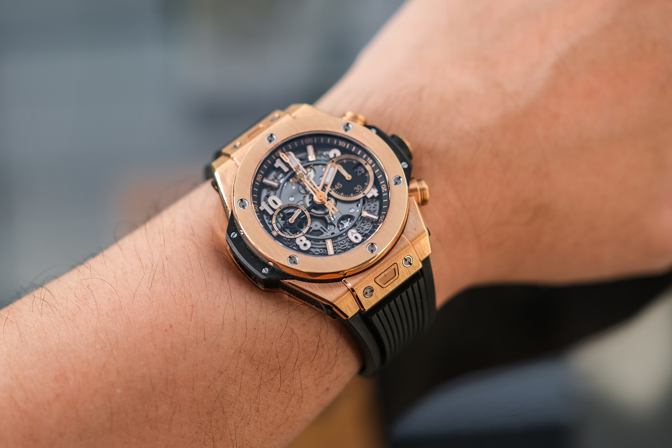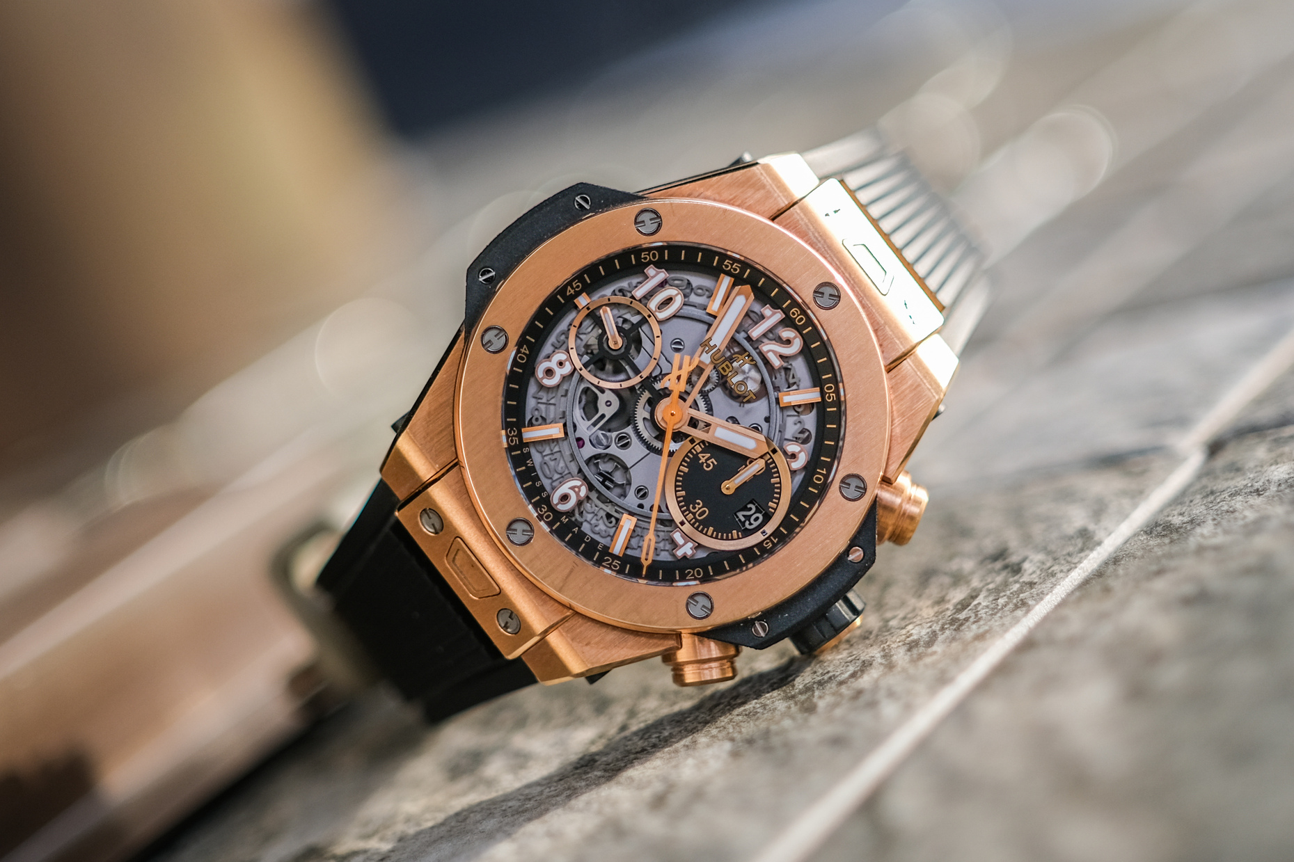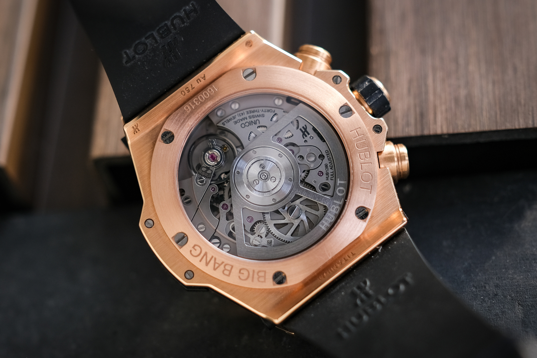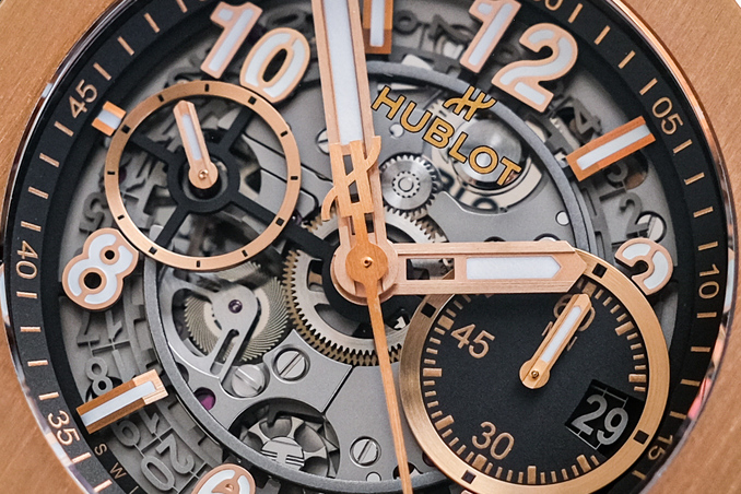 ✨ ขนาด 42mm. หน้าปัด Skeleton เห็นกลไกการทำงานชัดเจน มาพร้อมช่องวันที่และฟังก์ชันจับเวลา Chronograph FLYBACK พระเอกคือวัสดุเป็นทองคำ 18K Rose Gold ทั้งเรือนที่ให้น้ำหนักเบา ขอบทองคำ ด้านหลังเปลือยเห็นกลไก Automatic HUB1280 (72 ชม.)