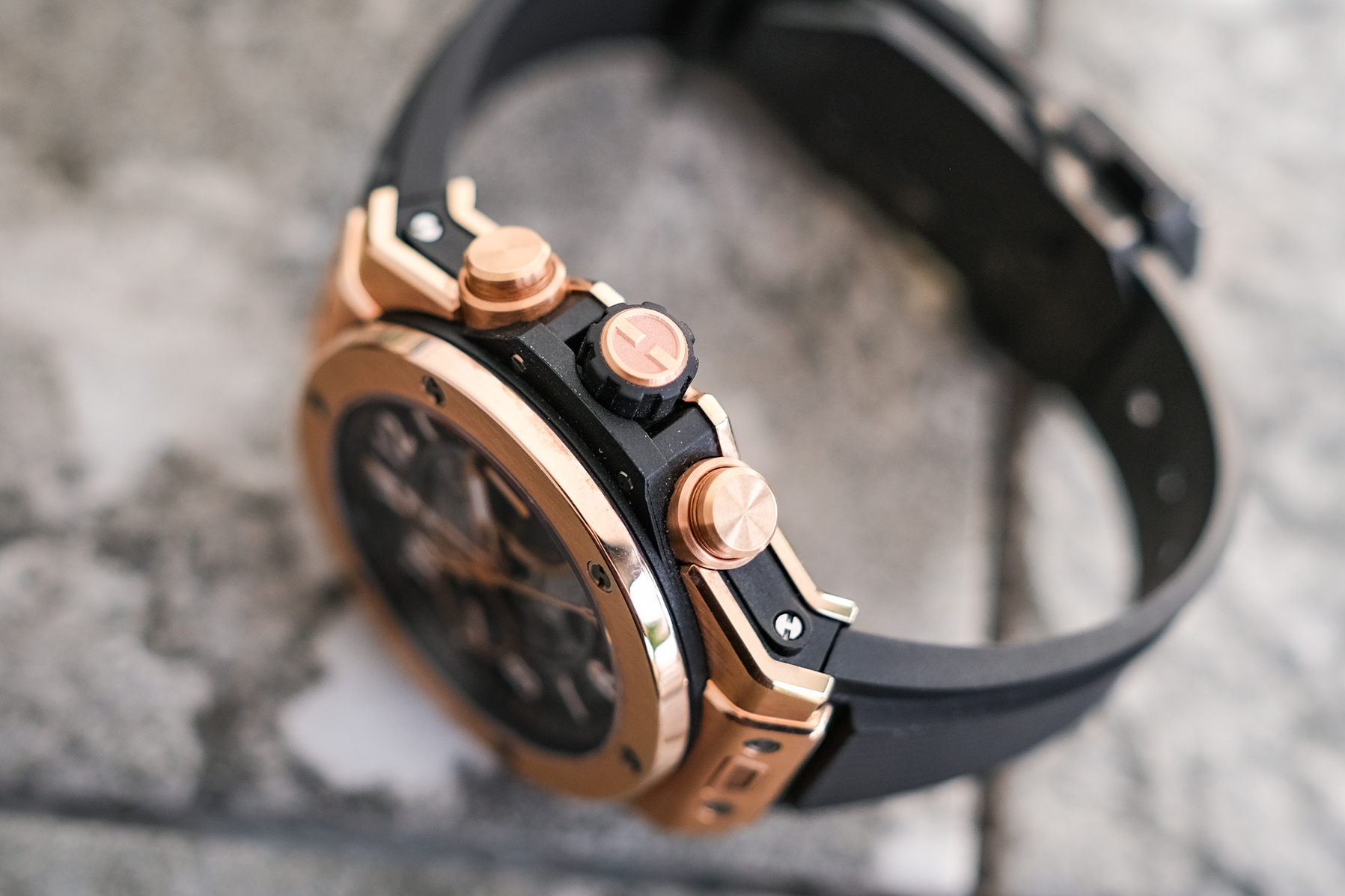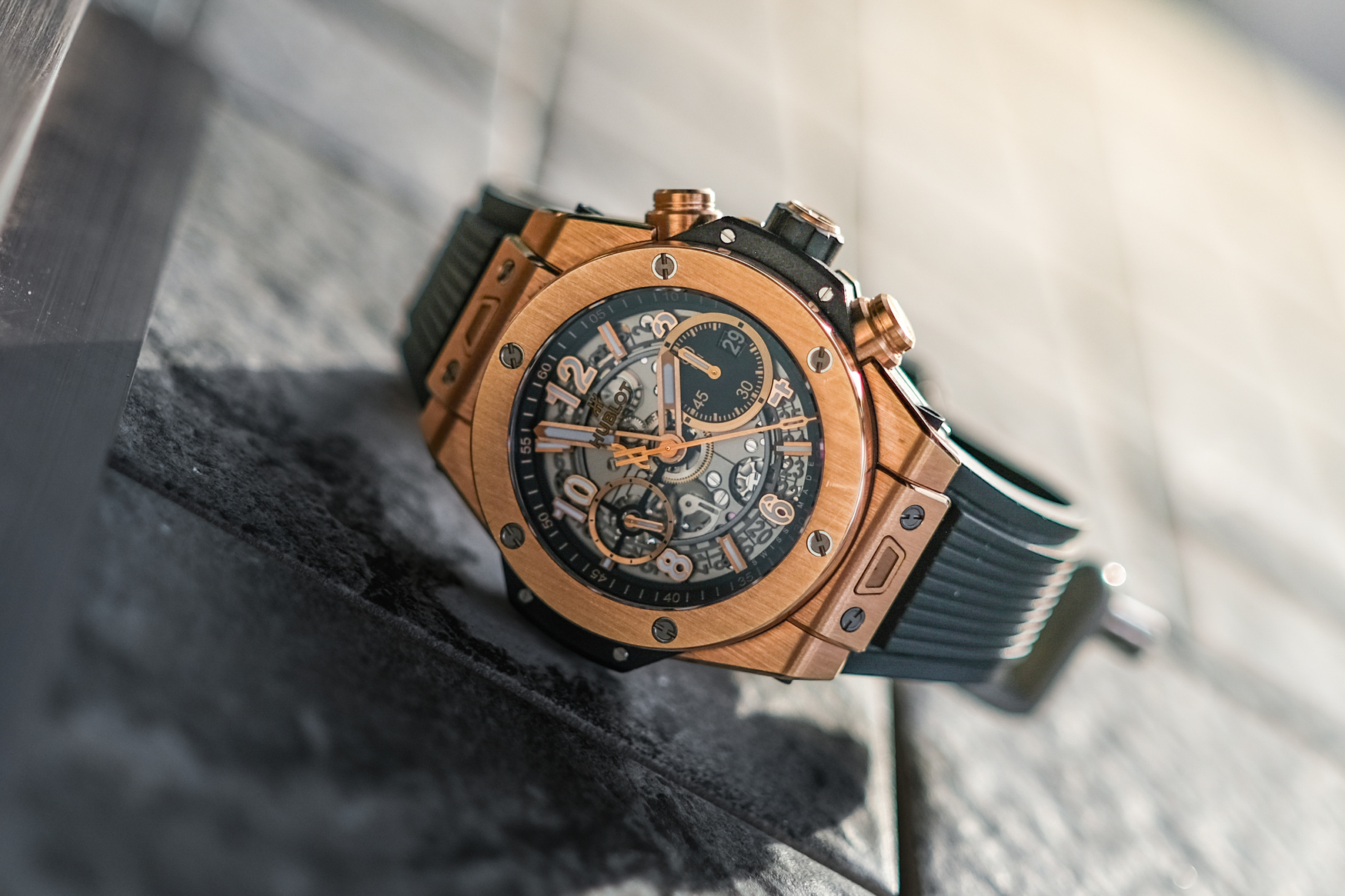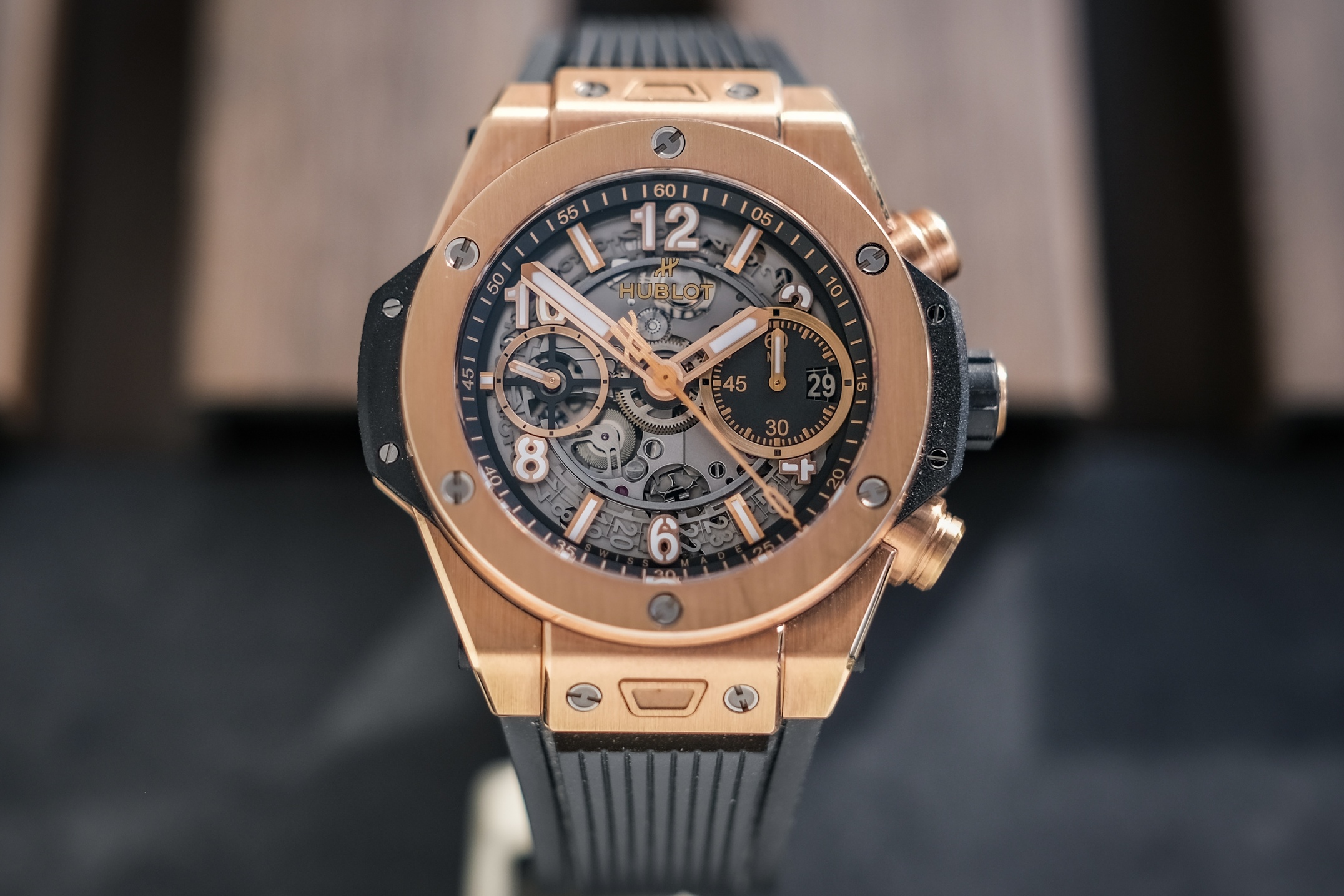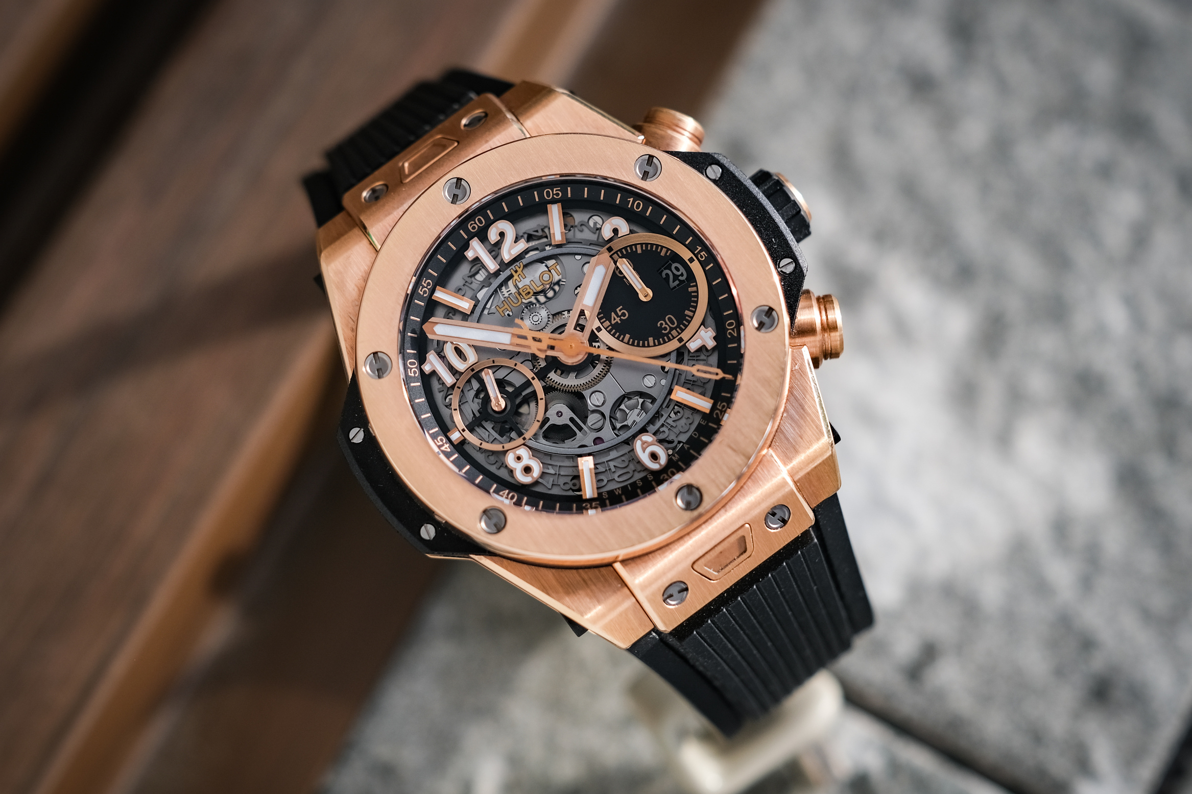 ✨ ขนาด 42mm. หน้าปัด Skeleton เห็นกลไกการทำงานชัดเจน มาพร้อมช่องวันที่และฟังก์ชันจับเวลา Chronograph FLYBACK พระเอกคือวัสดุเป็นทองคำ 18K Rose Gold ทั้งเรือนที่ให้น้ำหนักเบา ขอบทองคำ ด้านหลังเปลือยเห็นกลไก Automatic HUB1280 (72 ชม.)