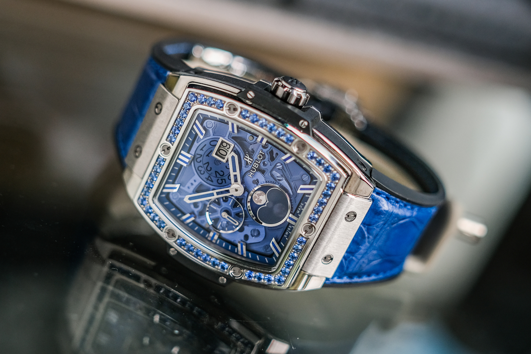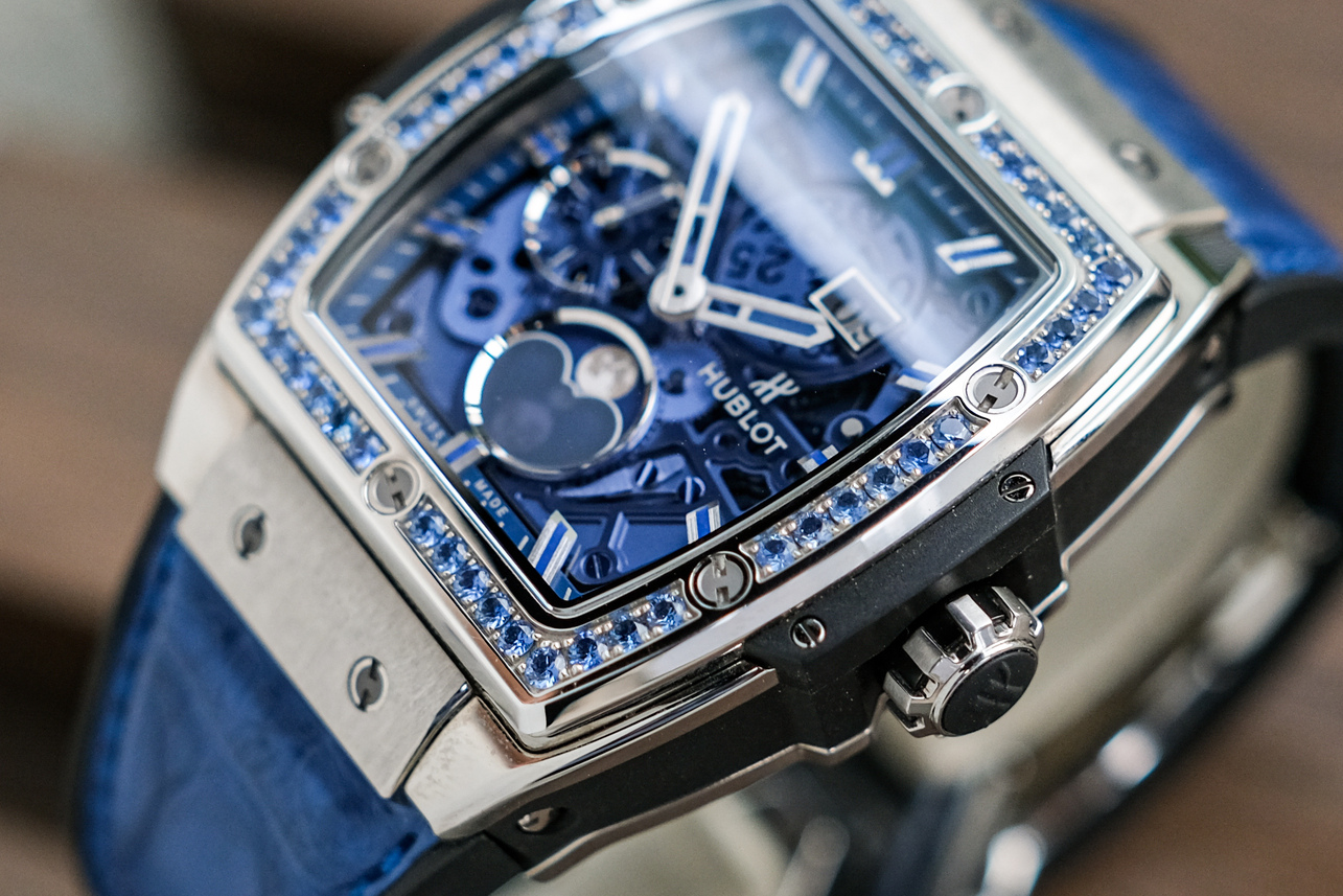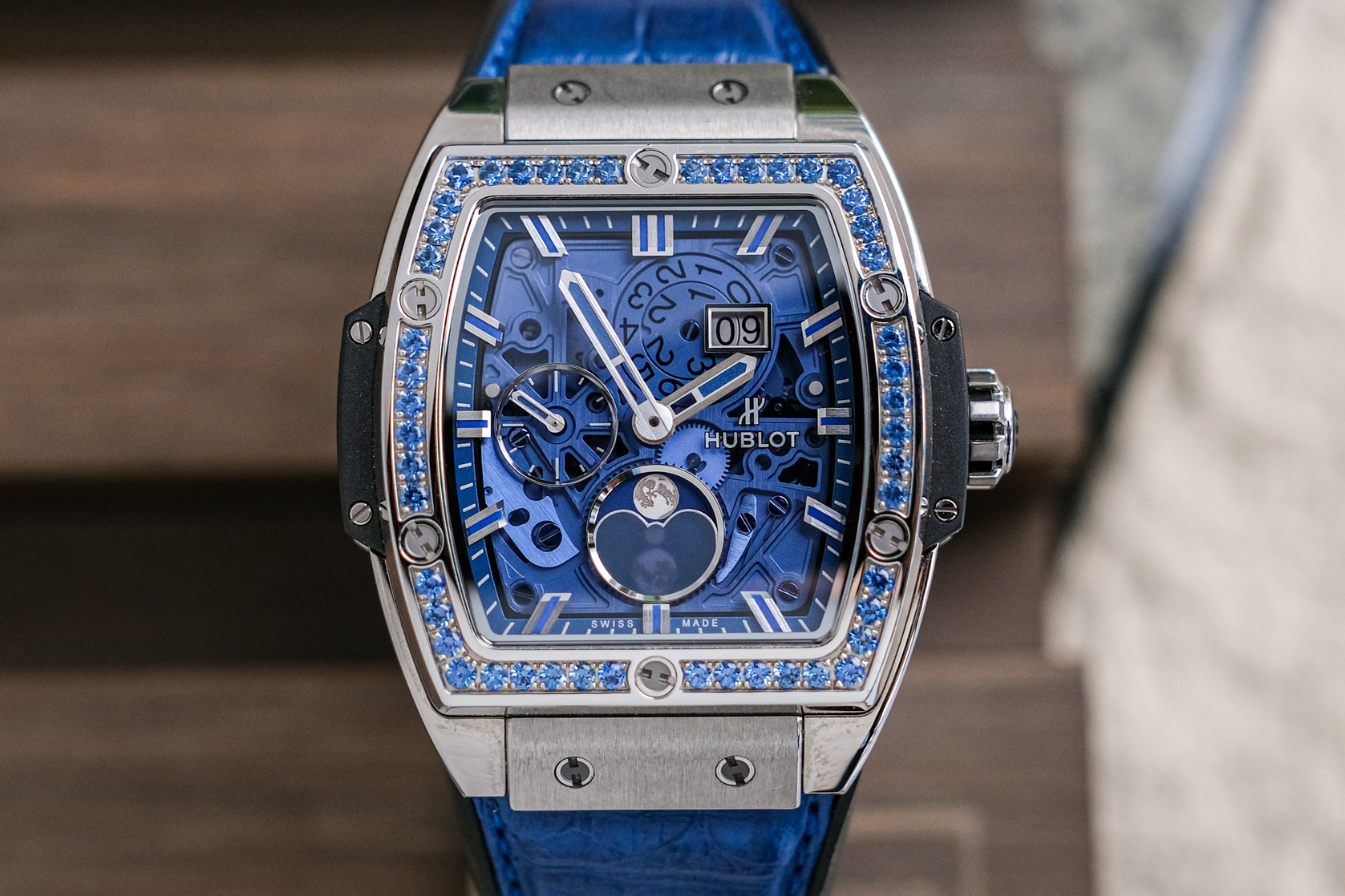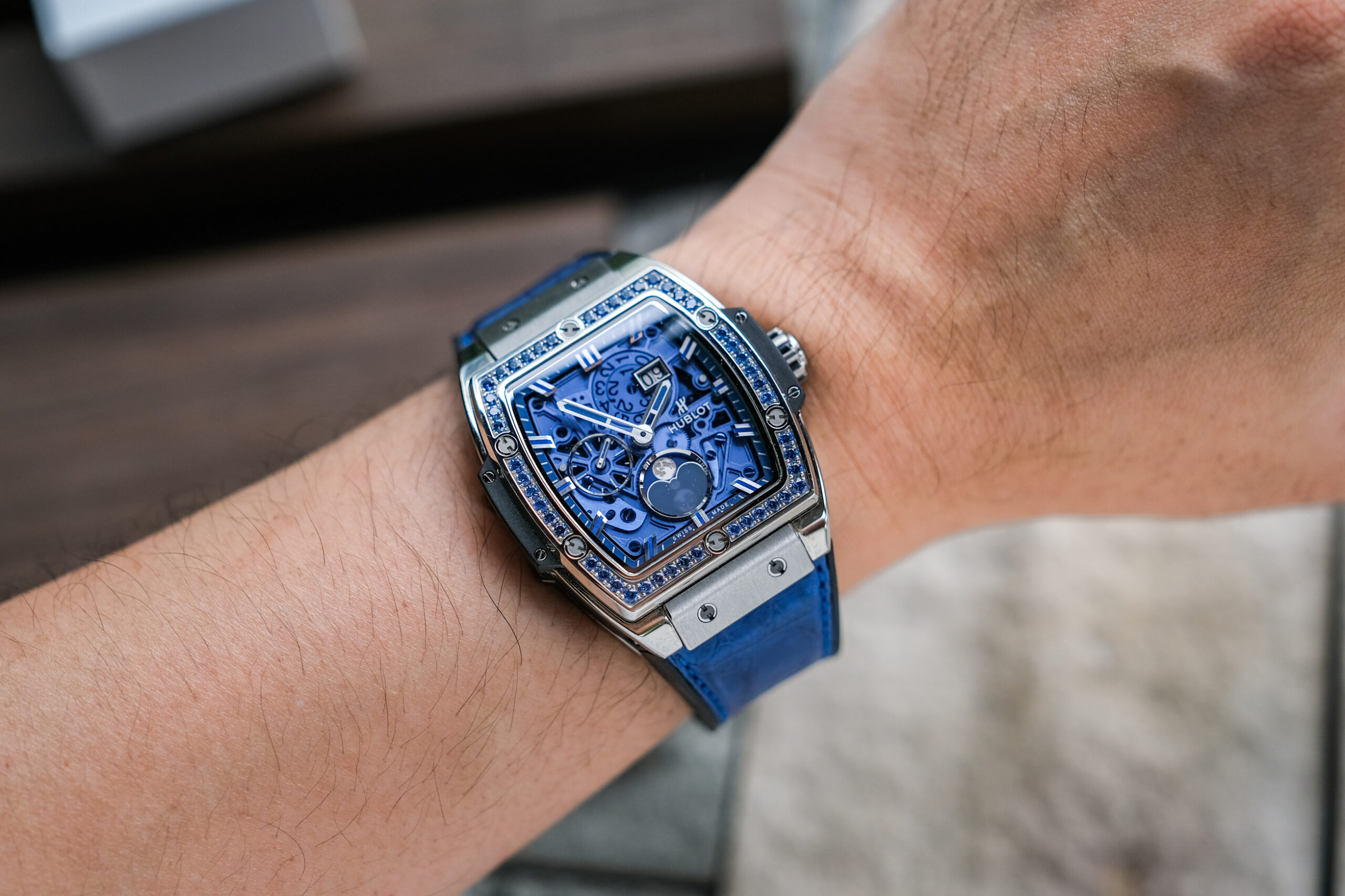 ✨ เรือนนี้ทั้งหล่อ สวย ไม่เหมือน Hublot รุ่นไหนๆในตลาด ขอบตัวเรือนประดับ Blue Sapphire 48 เม็ดคัดเกรดอย่างพิถีพิถัน จัดเรียงให้ได้โทนสีและประกายที่สม่ำเสมอรอบวง ซึ่งเป็นงานที่ซับซ้อนและใช้ช่างฝีมือขั้นสูง หน้าปัดโปร่งใสยิ่งเพิ่มมิติ ทำให้ได้ลุคที่หรูหราและทันสมัย ผลิตน้อย เห็นแต่ไกลก็รู้ว่า Rare