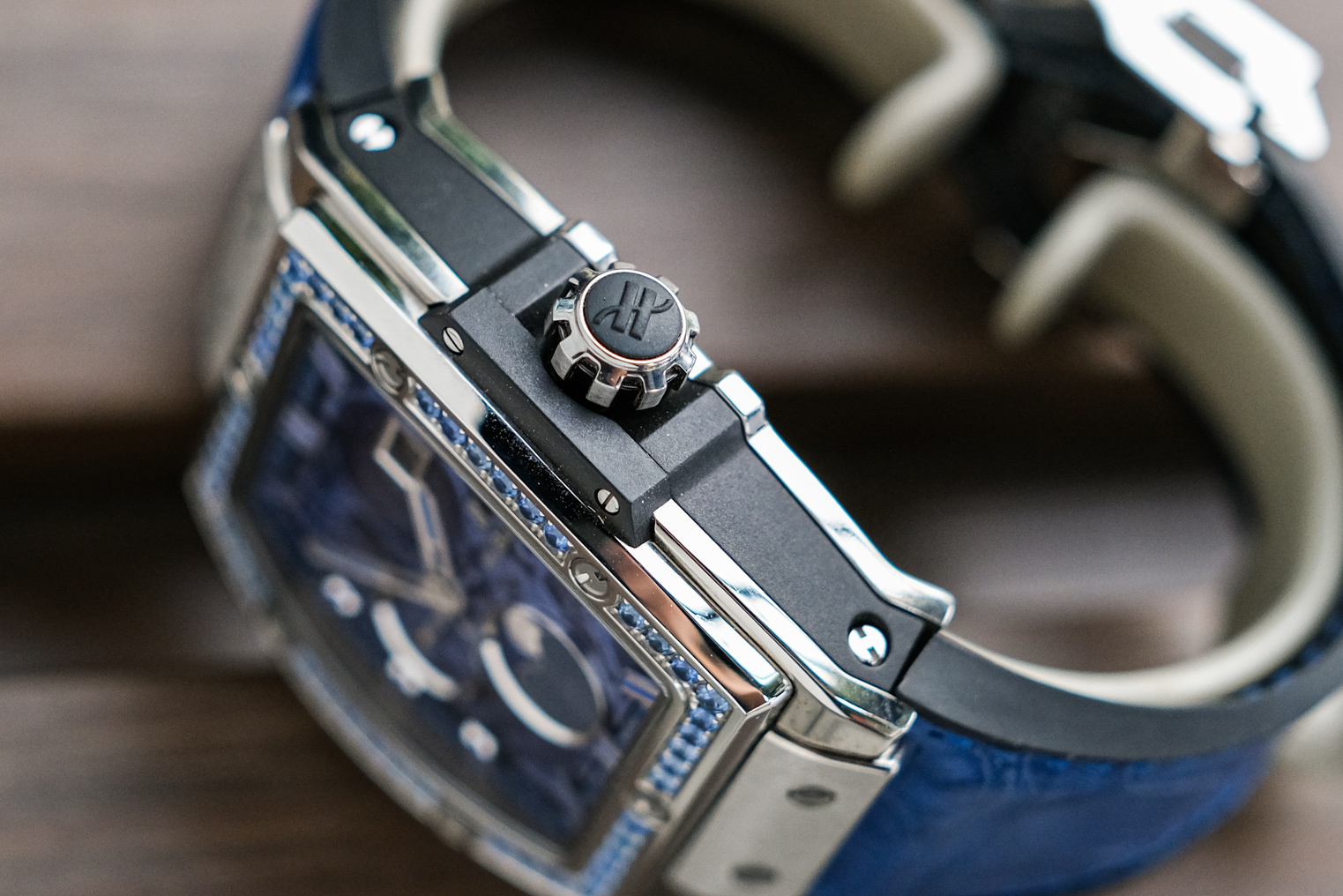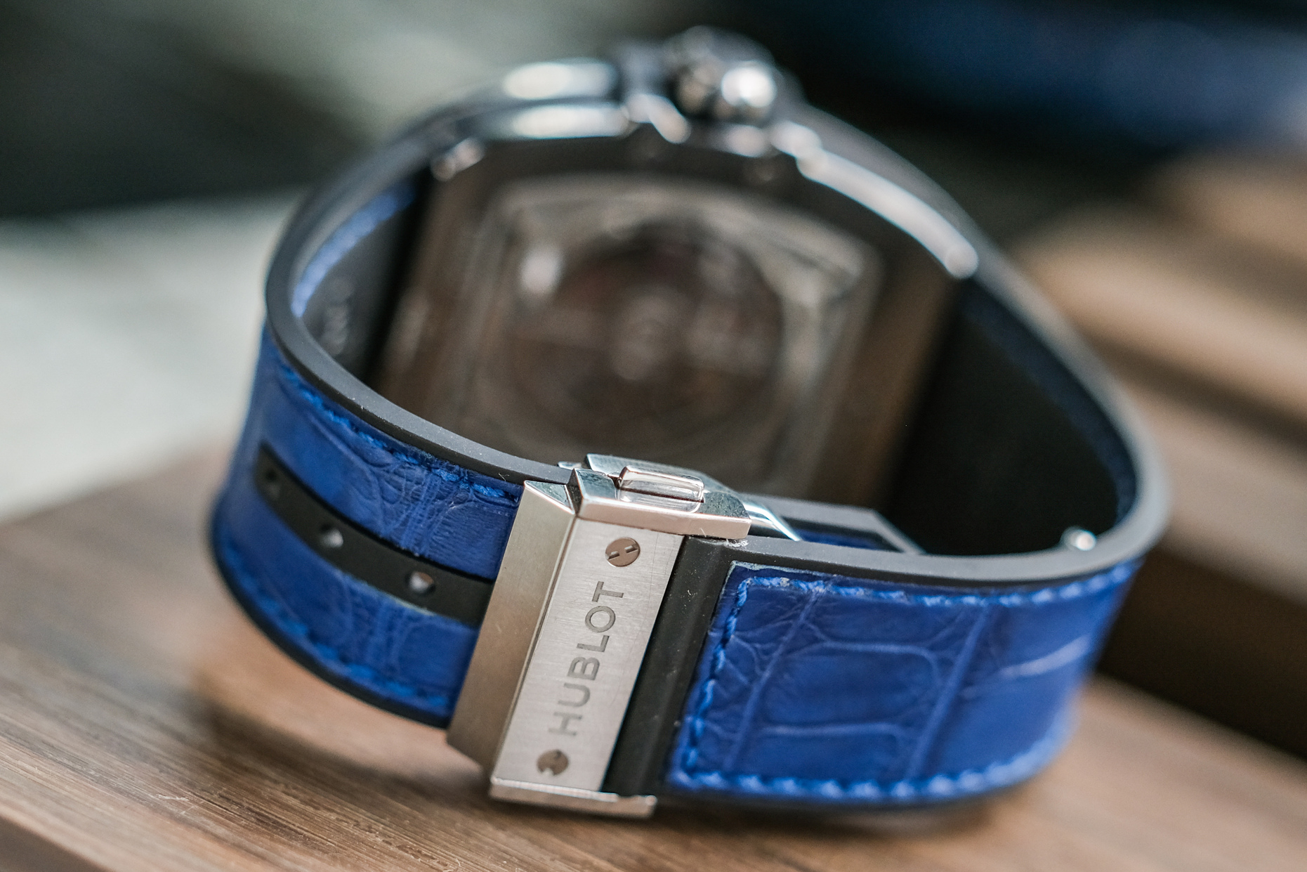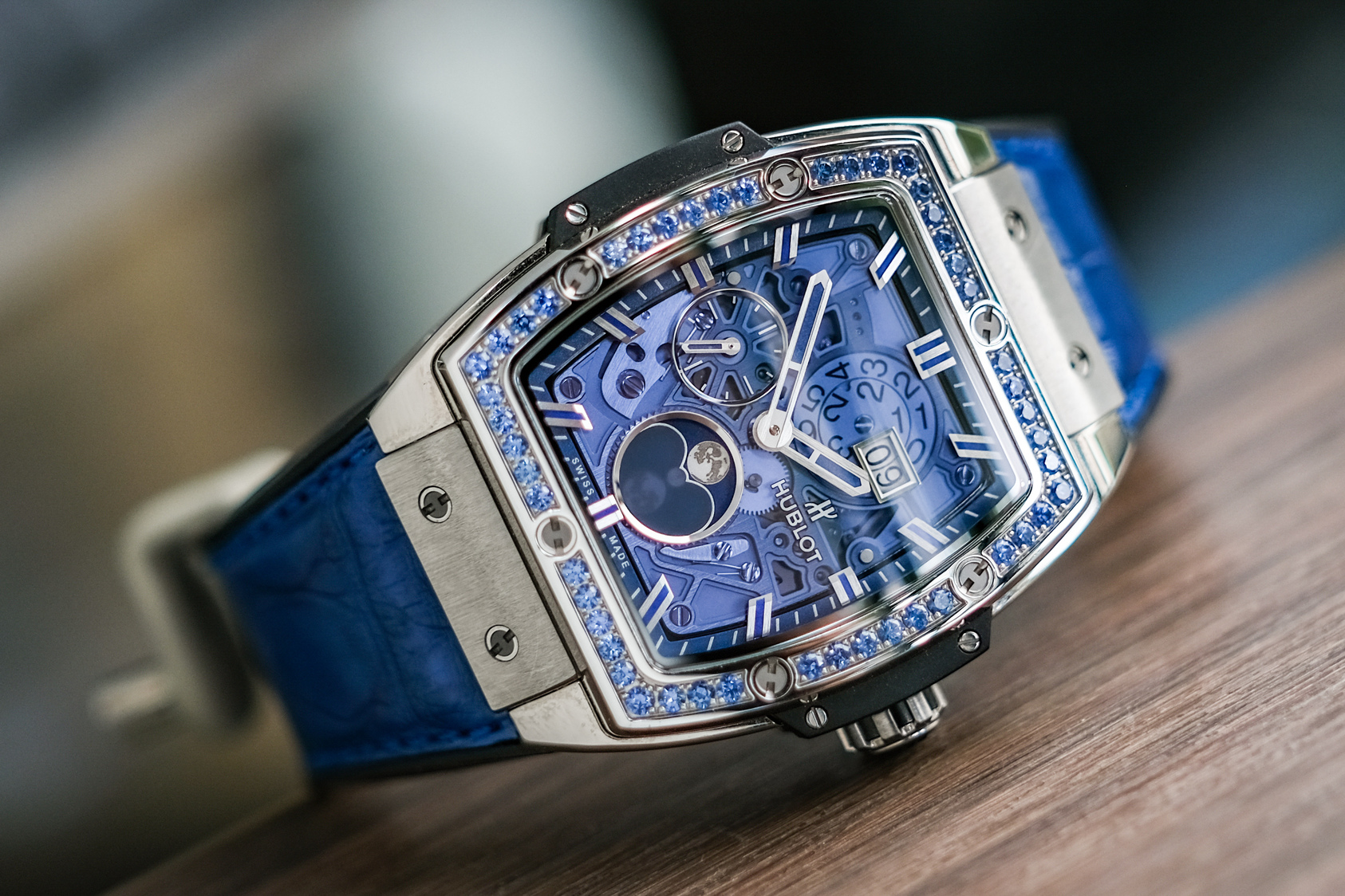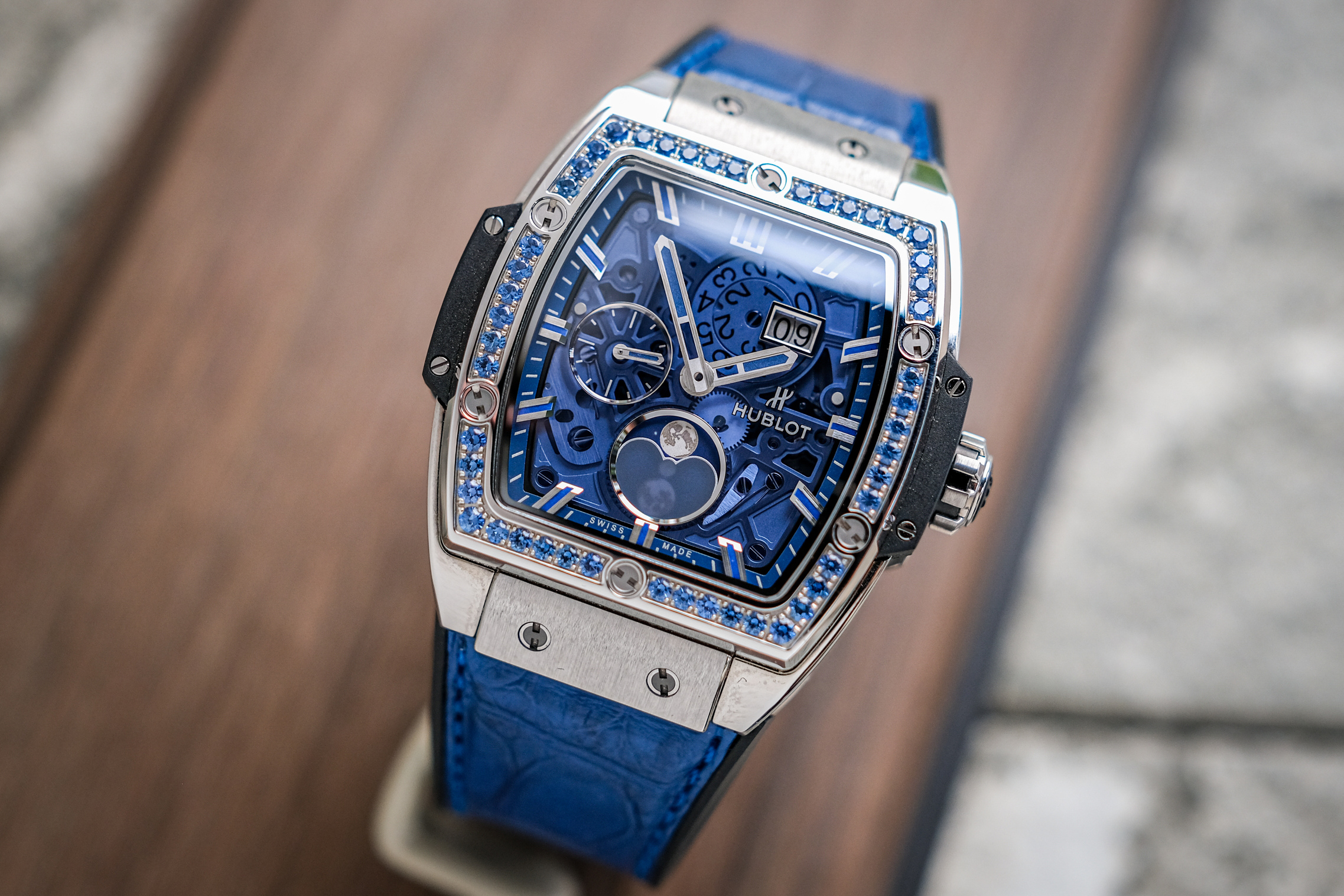 ✨ เรือนนี้ทั้งหล่อ สวย ไม่เหมือน Hublot รุ่นไหนๆในตลาด ขอบตัวเรือนประดับ Blue Sapphire 48 เม็ดคัดเกรดอย่างพิถีพิถัน จัดเรียงให้ได้โทนสีและประกายที่สม่ำเสมอรอบวง ซึ่งเป็นงานที่ซับซ้อนและใช้ช่างฝีมือขั้นสูง หน้าปัดโปร่งใสยิ่งเพิ่มมิติ ทำให้ได้ลุคที่หรูหราและทันสมัย ผลิตน้อย เห็นแต่ไกลก็รู้ว่า Rare