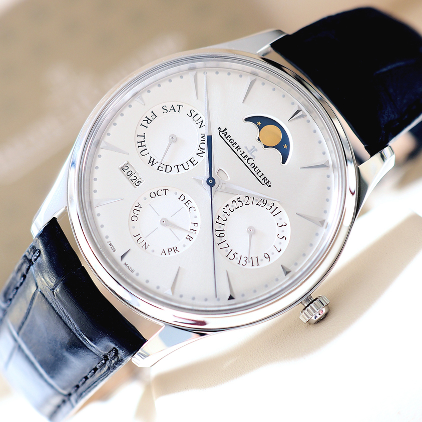นาฬิกาเจ้าของมือเดียวซื้อป้ายแดงจาก Boutique ใช้งานน้อย ไร้รอยหนัก กระจกสวยใสไร้ริ้วรอยทั้งหน้าหลัง สภาพสวย ไม่เคยผ่านการปัดขัดใดๆทั้งสิ้น สาย Alligator สภาพสมบูรณ์แบบ เครื่องในตำนาน JLC In-House Perpetual Calendar Caliber 868/1 ระบบ Automatic ทำงานได้อย่างสมบูรณ์แบบ