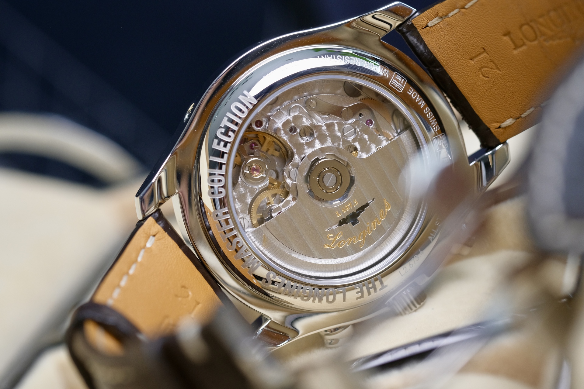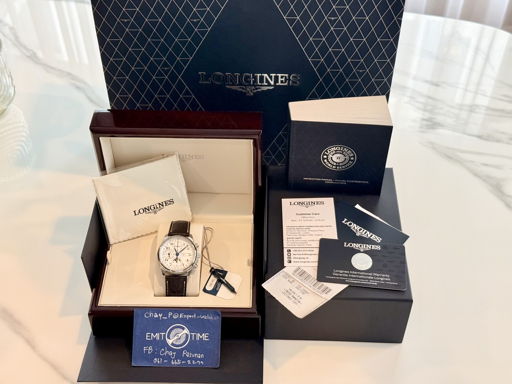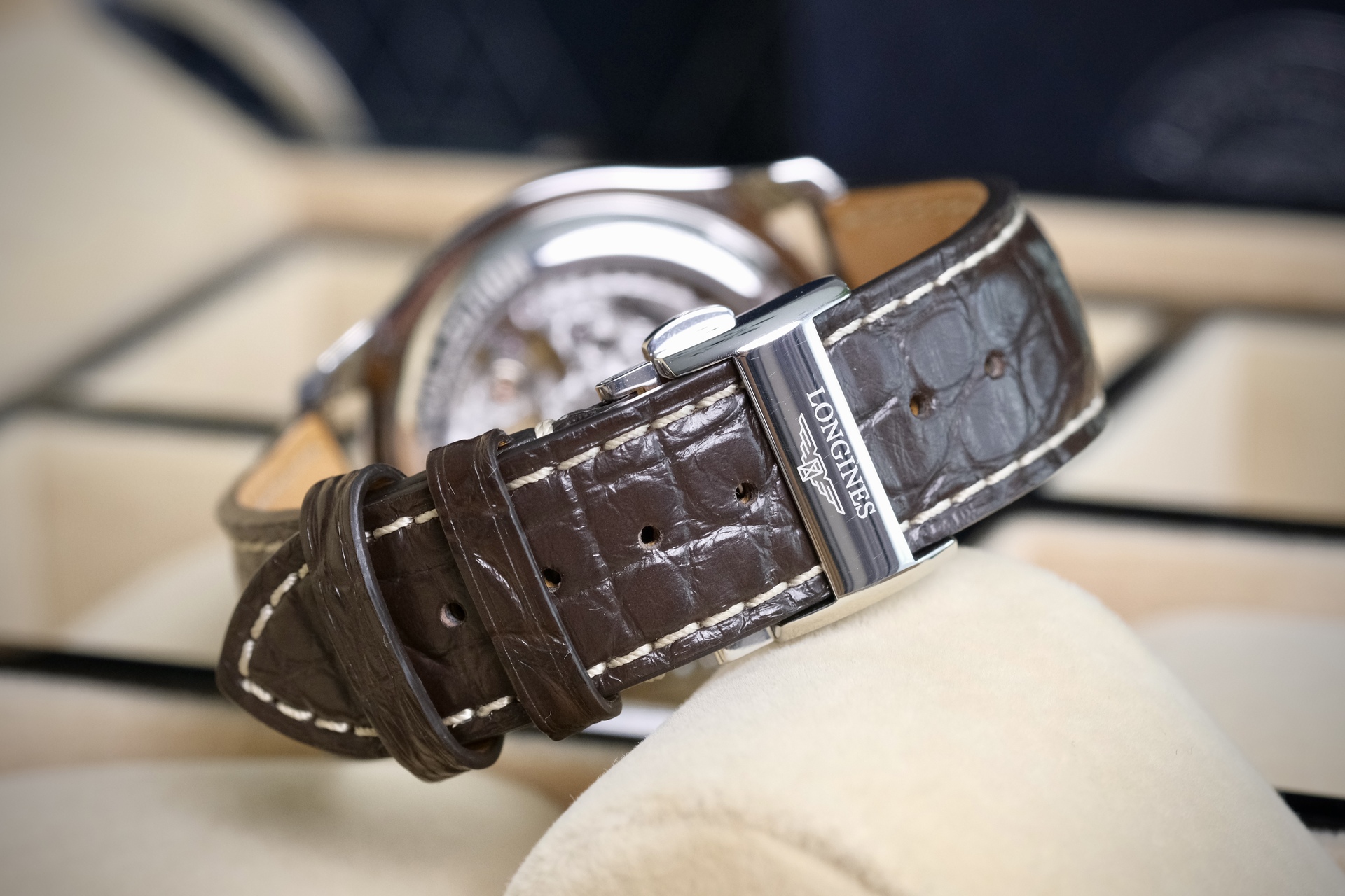 Dress Watch ขนาด 40mm ให้ลุคผู้ดี เรียบหรู ฉลาดเลือก มากับกลไกครบเครื่อง คือ Triple Date, Moon Phase,Chronograph ซึ่งเป็นกลไกที่ทำได้ยากจะซับซ้อน Longines อาจพูดได้ว่าเป็นหนึ่งในเรือนที่คุ้มค่าที่สุดในโลกของนาฬิกาสวิส Complication ที่ราคาจับต้องได้ เรือนนี้มาในหน้าปัดขาว Barleycorn Guilloché ตัดกับเข็ม Blue เลขอารบิก Breguet style ให้อารมณ์ Vintage กระจก Sapphire ทั้งหน้าหลังโชว์กลไกระบบ Automatic สำรองพลังงาน 66 ชม. ”สวย ลงตัว คุ้มค่า“