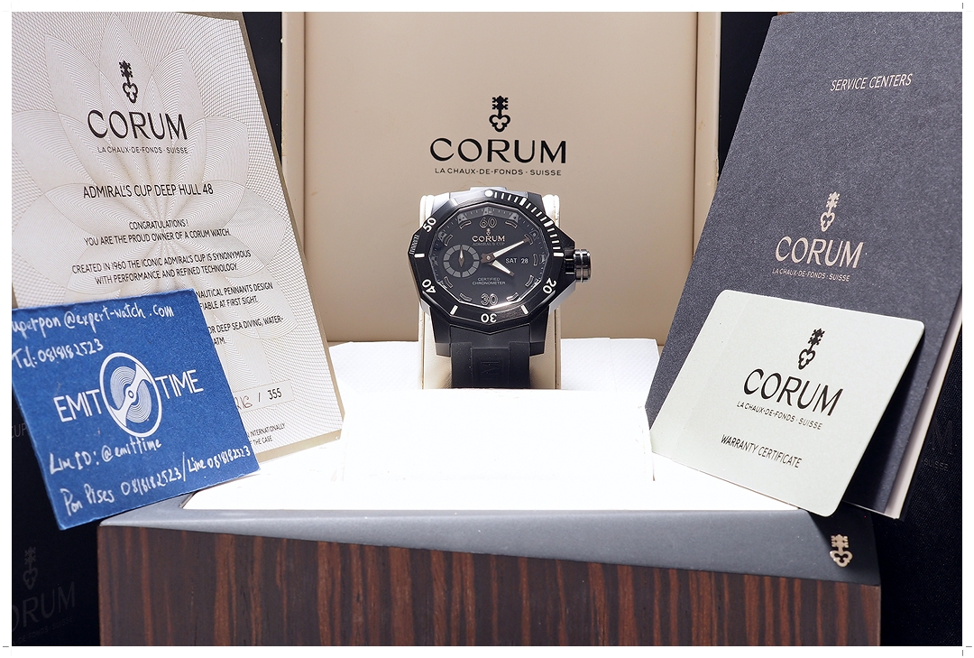 Corum Admiral’s Cup Seafender “DEEP HULL” โมเดลนี้เป็นรุ่นพี่ใหญ่สุด และเป็นตัวย่อยรุ่นท๊อปสุดของ Collection ครับ เป็น Limited Edition ผลิตเพียง 355 เรือนทั่วโลก ตัวเรือน ขอบเบเซล และฝาหลัง “All Black” วัสดุ Titanium เคลือบผิวด้วย Black PVD ขนาด 48mm ใส่เต็มข้อสวยดุดันมาก น้ำหนักเบาและทนทานต่อรอยขีดข่วน ขอบเบเซลหมุนได้แบบ Uni-Directional ขึ้นข้อแล้วดู Sporty สุดขีด พร้อมหน้าต่าง Day-Date ที่ตำแหน่ง 3 นาฬิกา กันน้ำลึกถึง 1,000 เมตร ฝาหลังสลัก Corum DEEP HULL 1000 METERS Limited Edition Number (216/355) ราคา Price List สูงถึง 496,000 บาท EMITTIME เสนอราคาต่ำป้ายถึง 82% ครับ