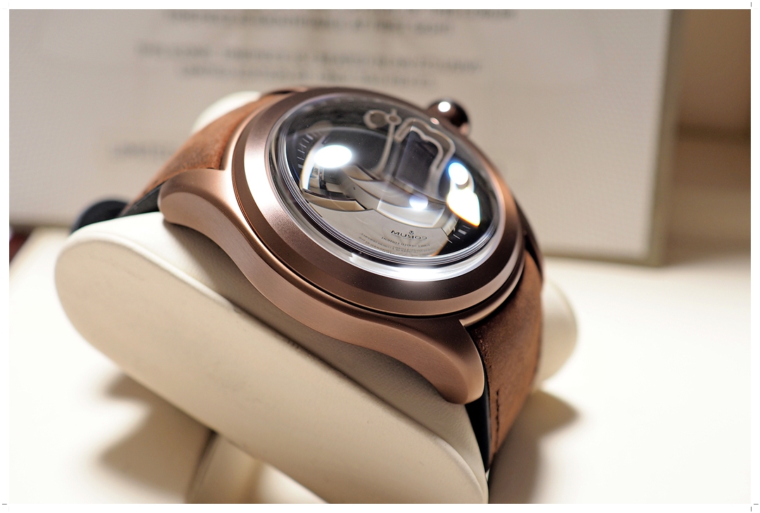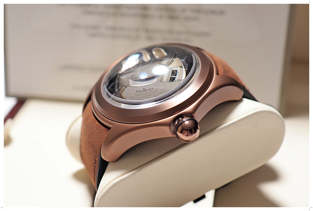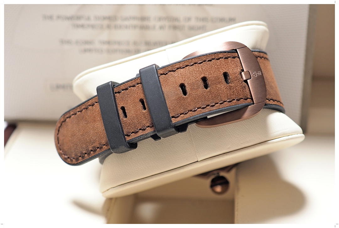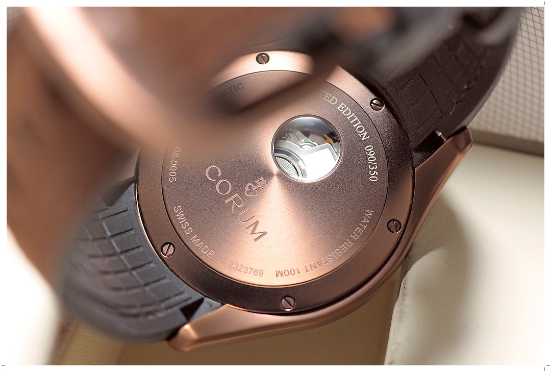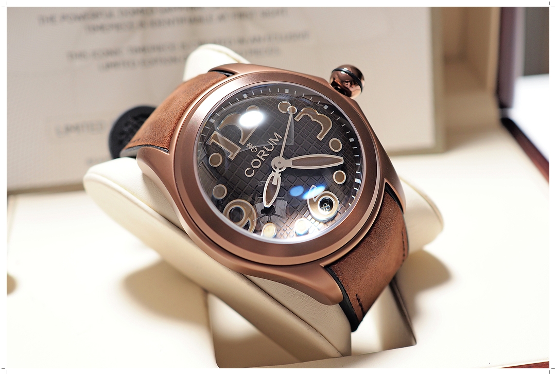 Corum Bubble 47mm โมเดลนี้ผลิตเพียง 350 เรือนทั่วโลก และถือเป็นหนึ่งในโมเดลที่ขึ้นข้อแล้วหล่อที่สุดใน Bubble Collection ครับ ตัวเรือนทำจาก Stainless Steel PVD Bronze Coating สวยหยุดหายใจ หน้าปัดฉลุลาย Guilloche สี Chocolate Brown พร้อมหน้าต่างวันที่ที่ตำแหน่ง 6 นาฬิกา เข้ากับตัวเรือนอย่างลงตัว สายหนังวัวสีน้ำตาล หลักพรายน้ำสีน้ำตาลทอง Heritage เข้ากับหน้าปัดอย่างโดดเด่น สวยอย่างเป็นเอกลักษณ์ แต่งตัวเข้าได้กับทุกรูปแบบ ฝาหลังผ่าเปลือยเป็นวงกลมโชว์กลไก พร้อมระบุเลข Limited Number (090/350) แฟน Corum Bubble ไม่ควรพลาดด้วยประการทั้งปวงครับ