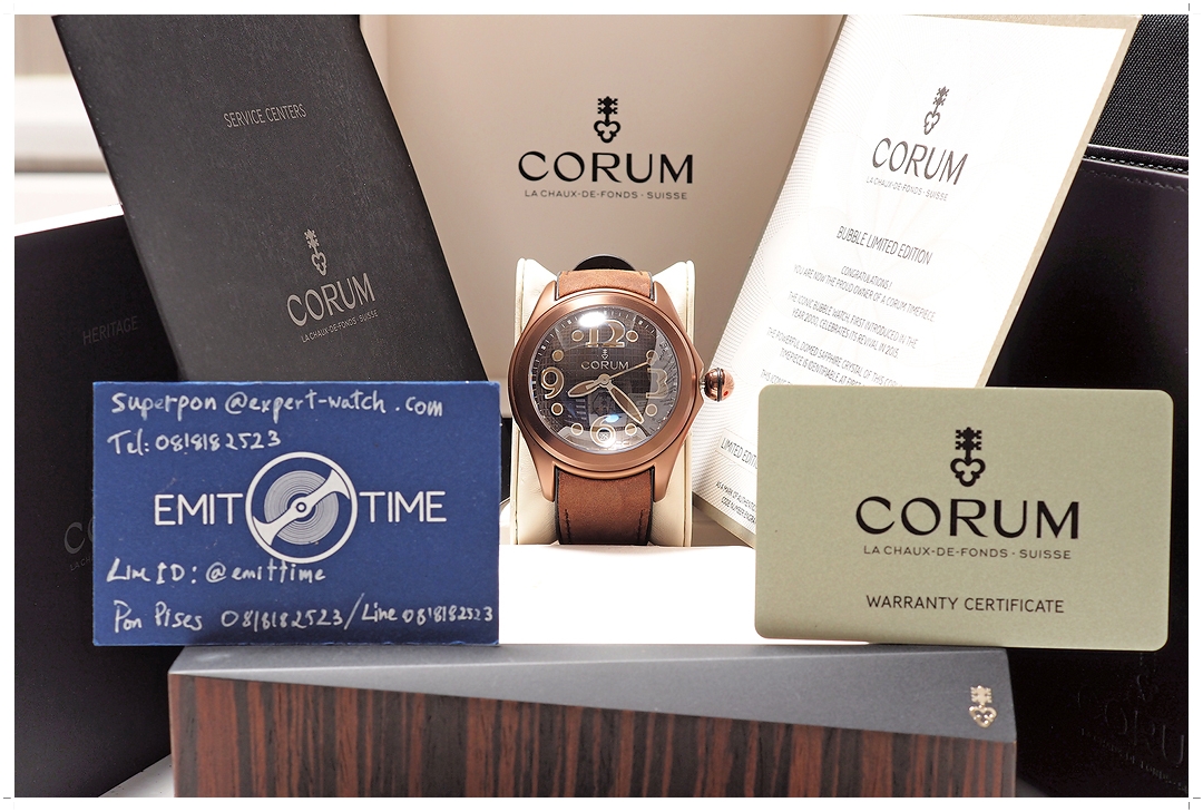 New Old Stock (NOS)!! Corum Bubble 47mm Heritage Bronze Limited 350 เรือนทั่วโลก ผลิตปีเดียว ref.08230198/0062 ของใหม่ ไม่เคยผ่านการใช้งาน ไร้ตำหนิ! กระจกไร้ริ้วรอย รัดหมอนนอนเซฟตลอดชีวิต ขึ้นข้อหล่อสุดใน Collection! ตัวเรือน PVD Bronze Coating หน้าปัด Guilloche Chocolate Brown Dial พร้อมหน้าต่างวันที่ กลไก Corum Caliber CO082 ระบบ Automatic หลังผ่าวงเปลือย สายหนัง Brown Calf Skin สภาพสมบูรณ์ Y-2015 Full-Set -88,000 บาท-