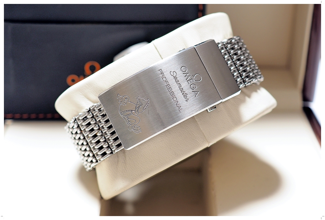 ตำนานดำน้ำลึกรุ่นใหญ่สุดของ Omega “Ploprof” 1200m เรือนนี้มาด้วยตัวเรือนขนาด 55mm x 48mm (Lug-to-Lug) ใส่แล้วไม่ล้นข้อ ขึ้นข้อกำลังสวย ขอบเบเซลทำจากวัสดุ Black Sapphire ทนทานต่อรอยขีดข่วน หมุนได้แบบ Bi-Directional มาพร้อม Safety-Lock ด้วยการกดแกน Pusher สีส้มเพื่อปรับหมุน หน้าต่างวันที่วางได้อย่างสวยงามที่ตำแหน่ง 4.5 นาฬิกา เม็ดมะยมขันเกลียวพร้อม Crown-Guard ที่จดลิขสิทธิ์ของ Ploprof โดยเฉพาะ วางตำแหน่งมะยมแบบขับซ้ายเพื่อความสะดวกในการสวมใส่ หน้าปัดและขอบ Bezel สีดำดุดันสุดขีด เข้ากับสาย Mesh Sharkproof ได้อย่างลงตัว บัคเคิ่ลมีระบบ Extension ซ่อนใต้บานพับใช้งานง่ายดายมาก ราคา Price List สุดท้ายสูงถึง 389,000 บาท EMITTIME เสนอราคา Rare Item เรือนนี้ในราคาต่ำป้ายเกือบ 60% ครับ