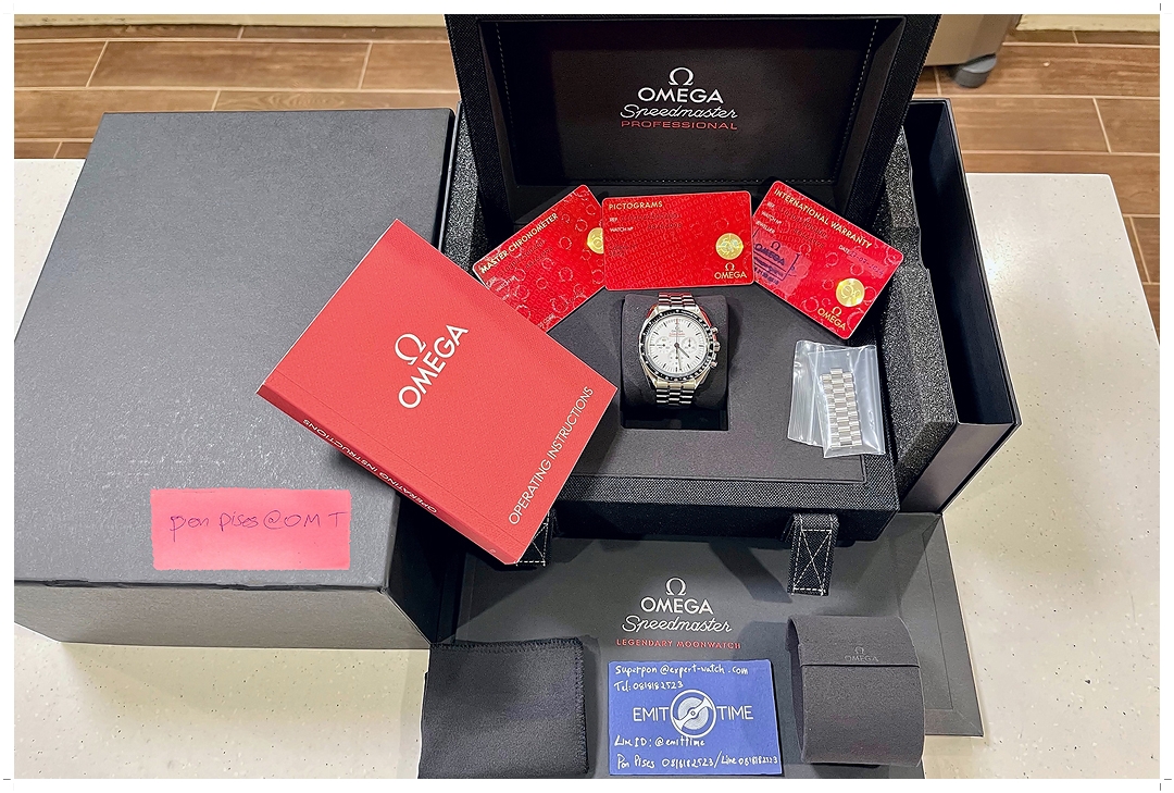 อุปกรณ์ Full-Set กล่องชั้นนอก, กล่องชั้นใน, ข้อครบถ้วน, เล่มคู่มือ, ผ้าเช็ดนาฬิกา, เล่ม Moonwatch, Warranty Card Boutique ไทย x 3 ใบครบถ้วน ลง Jul-2024