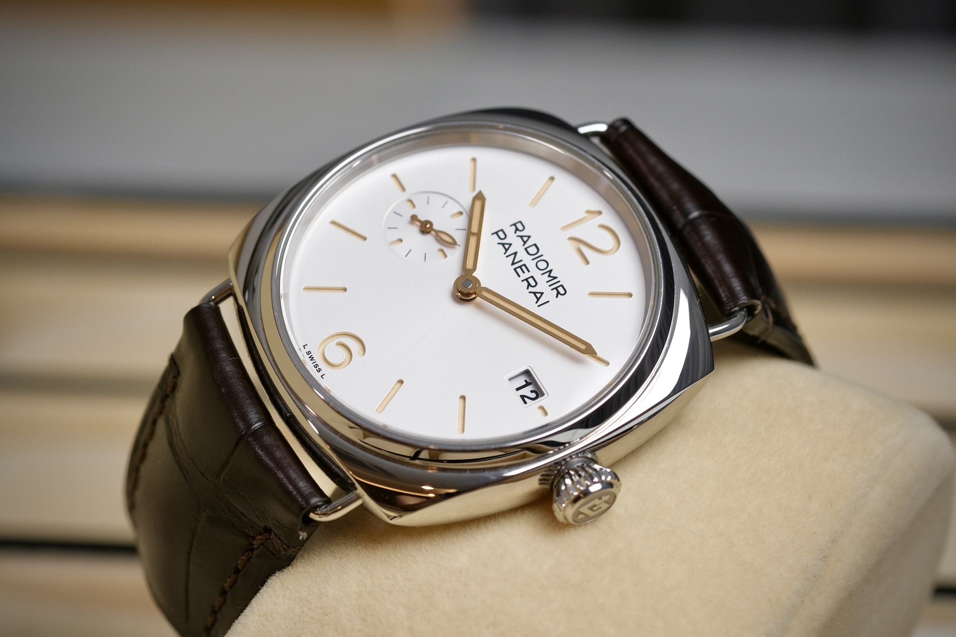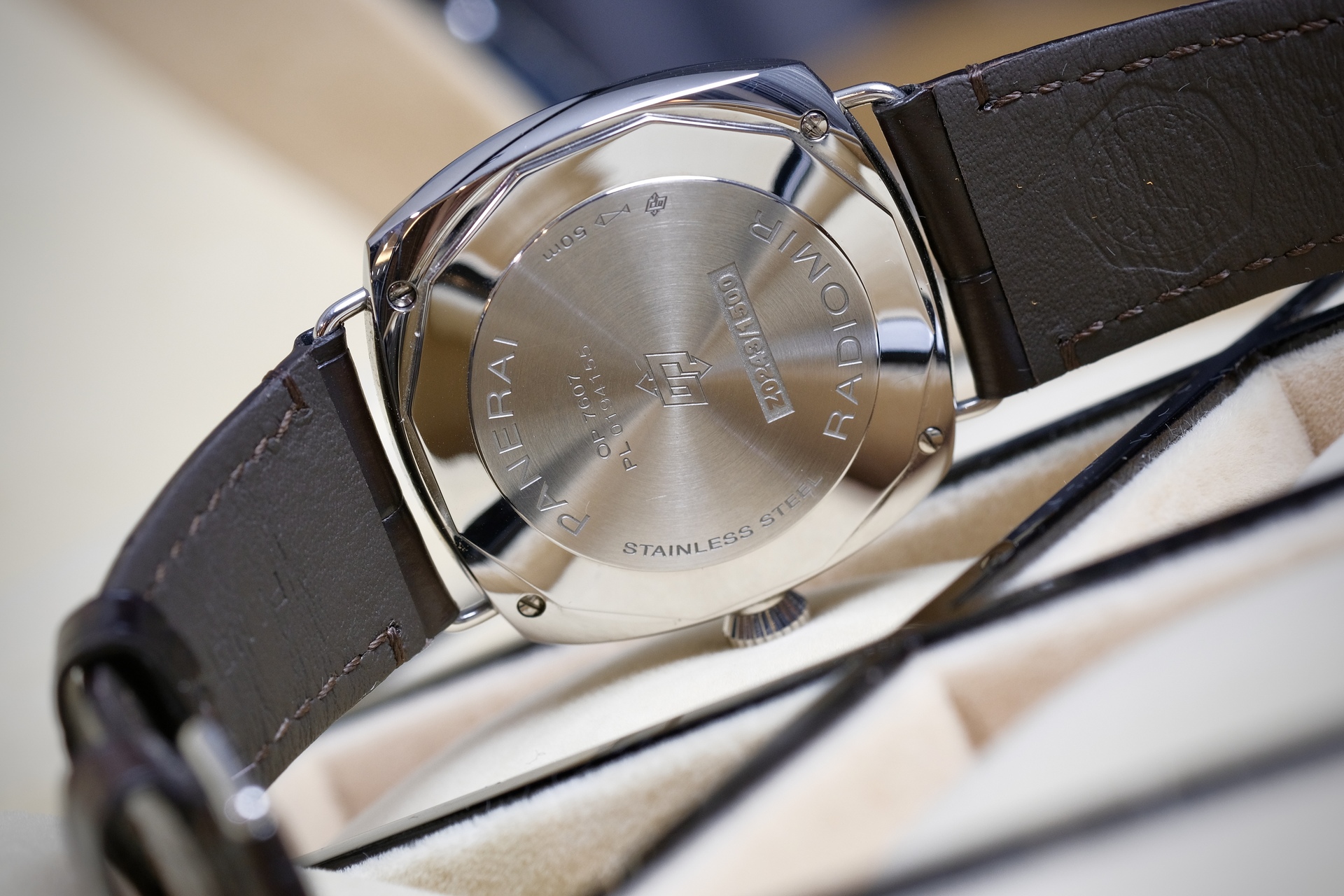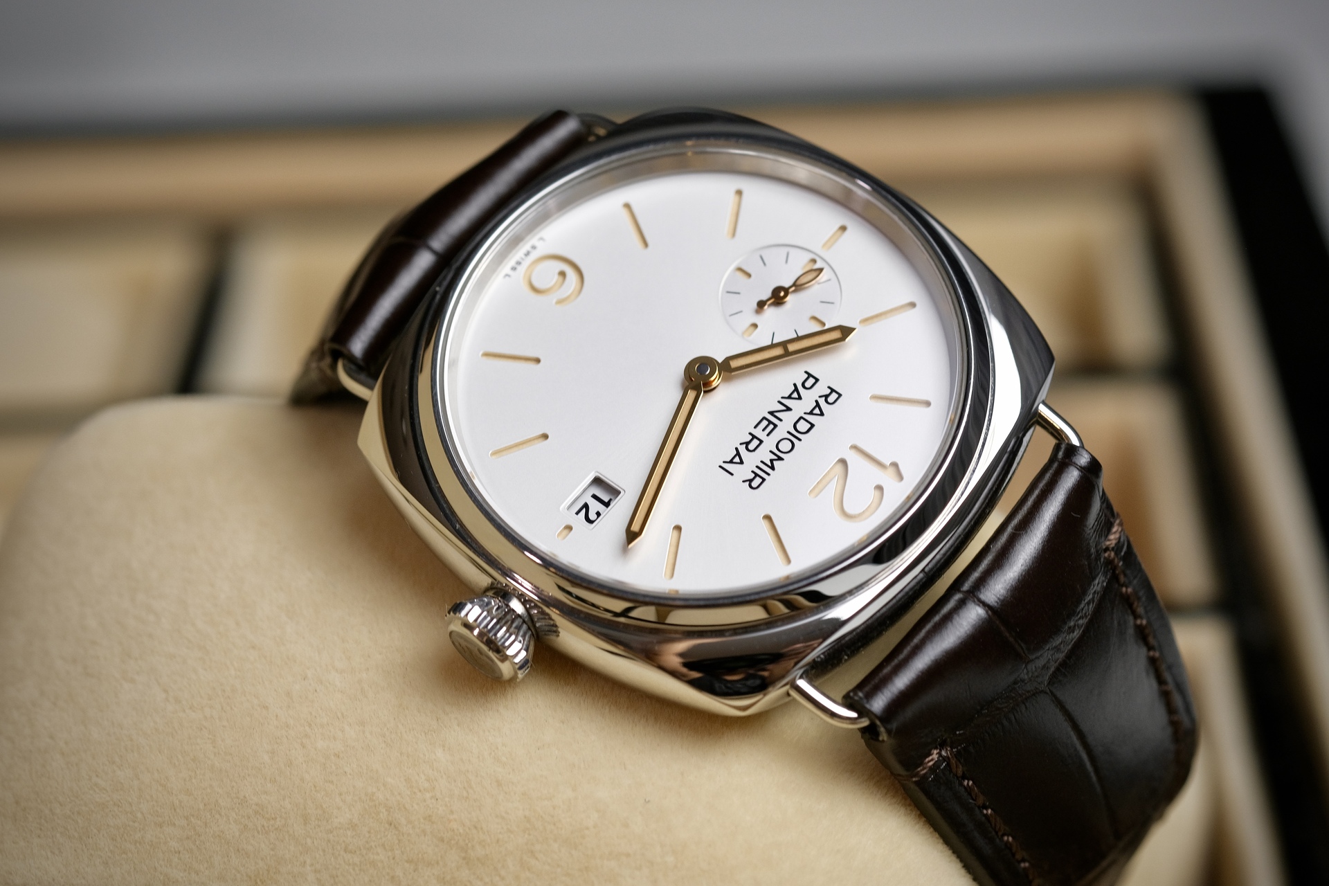 Quaranta มีความหมายในภาษาอิตาลี แปลว่า ”40“ Pam1292 ตัวนี้มีขนาด 40mm เพื่อให้ปรับโฉมนาฬิกาPanerai ให้มีความเป็น Dress Watch ที่ผสานความสง่างามแบบคลาสสิก จะใส่เสื้อแขนยาวกับสูทก็ลงตัว หน้าปัดsandwich off white นวลๆตา กับหลักเวลาสีไข่ไก่ ลงตัวอย่างยิ่งเพื่อเข้าคู่กับสายสี Dark chocolate กลไกมากับระบบ Automatic P.900 สำรองพลังงาน 3 Days กระจก Sapphire กันรอยขีดข่วน เป็นPam ที่ครบเครื่อง ใส่ได้ทั้งผู้ชายผู้หญิงเลยครับ