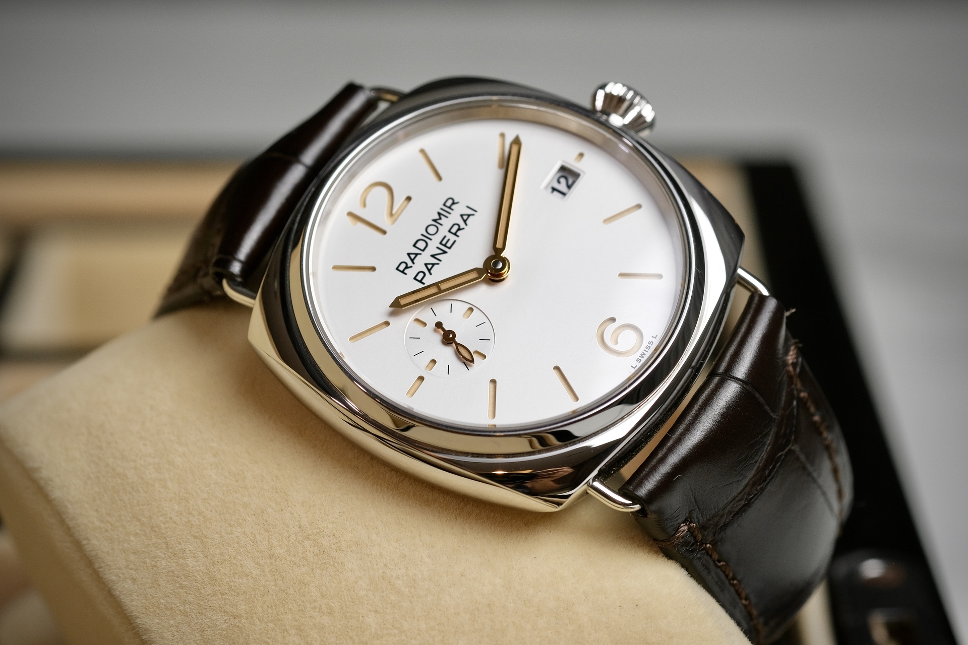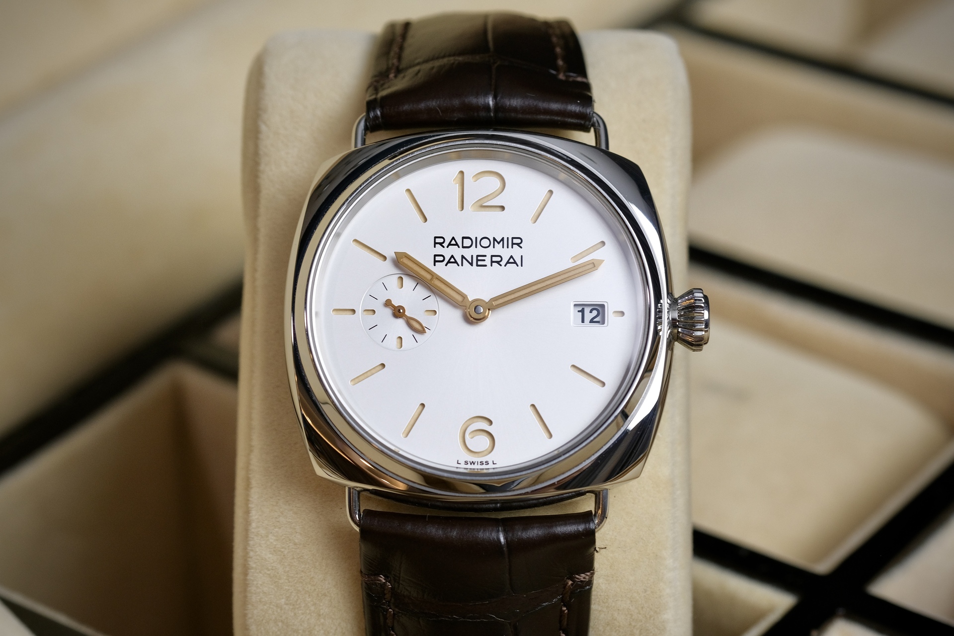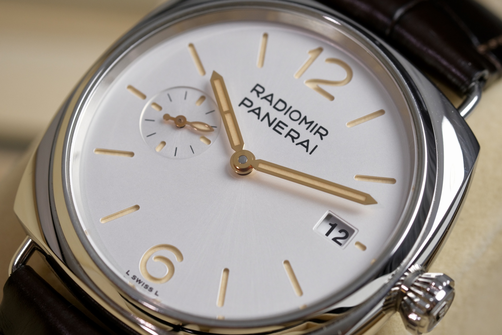 Quaranta มีความหมายในภาษาอิตาลี แปลว่า ”40“ Pam1292 ตัวนี้มีขนาด 40mm เพื่อให้ปรับโฉมนาฬิกาPanerai ให้มีความเป็น Dress Watch ที่ผสานความสง่างามแบบคลาสสิก จะใส่เสื้อแขนยาวกับสูทก็ลงตัว หน้าปัดsandwich off white นวลๆตา กับหลักเวลาสีไข่ไก่ ลงตัวอย่างยิ่งเพื่อเข้าคู่กับสายสี Dark chocolate กลไกมากับระบบ Automatic P.900 สำรองพลังงาน 3 Days กระจก Sapphire กันรอยขีดข่วน เป็นPam ที่ครบเครื่อง ใส่ได้ทั้งผู้ชายผู้หญิงเลยครับ