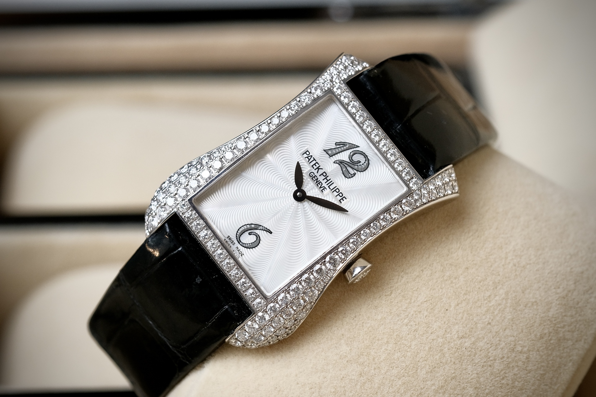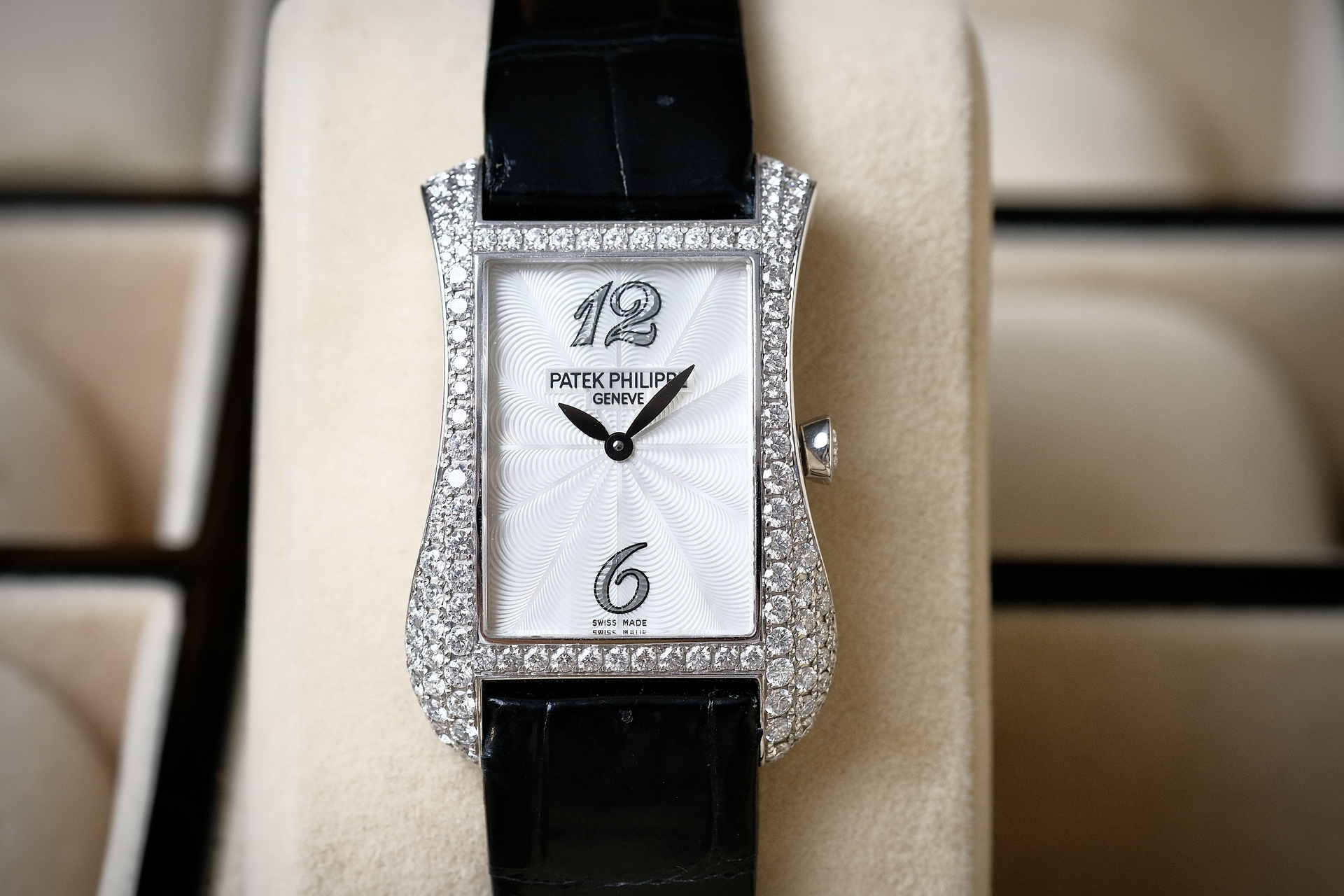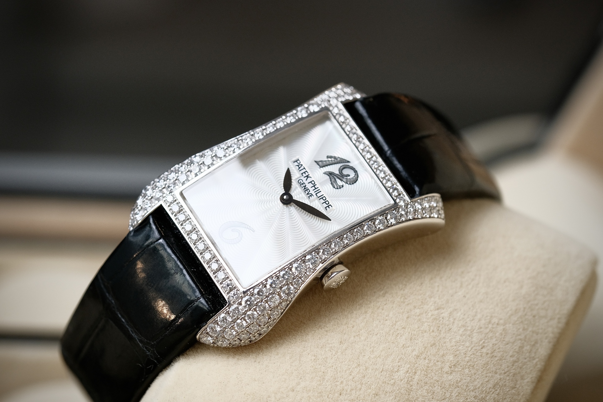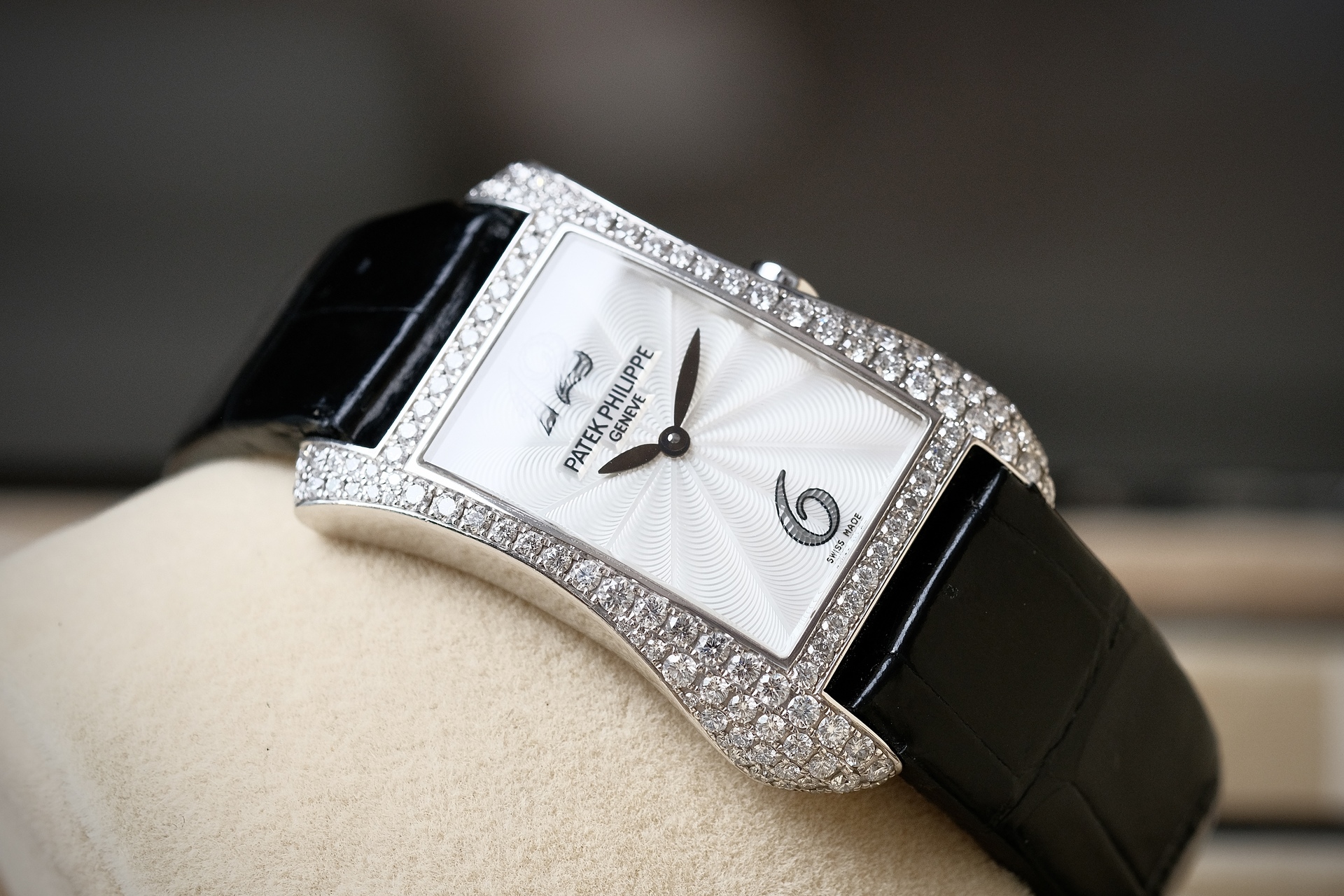 ต้อนรับ Valentine ด้วยสิ่งที่มากกว่านาฬิกา แต่เป็น High Jewelry จากPatek ฝังเพชร Original 130 เม็ด ระดับ Top Wesselton ขนาดตัวเรือน 28*40mm วัสดุ White gold งานออกแบบสไตล์ Art Deco มีเส้นสายที่นุ่มนวลแต่ทรงพลัง หน้าปัด MOP แกะลาย Guilloché ด้วยมือ มากับกลไก Quartz E15 ที่แม่นยำ ออกแบบสำหรับสุภาพสตรีโดยเฉพาะ ไม่ต้องกังวลเรื่องตั้งเวลาให้เล็บเสีย 4972g เรือนนี้ คือ”งานศิลปะที่สวมใส่ได้” ซึ่งให้ลุคดูเลอค่าและมีรสนิยมในทุกโอกาสสำคัญ