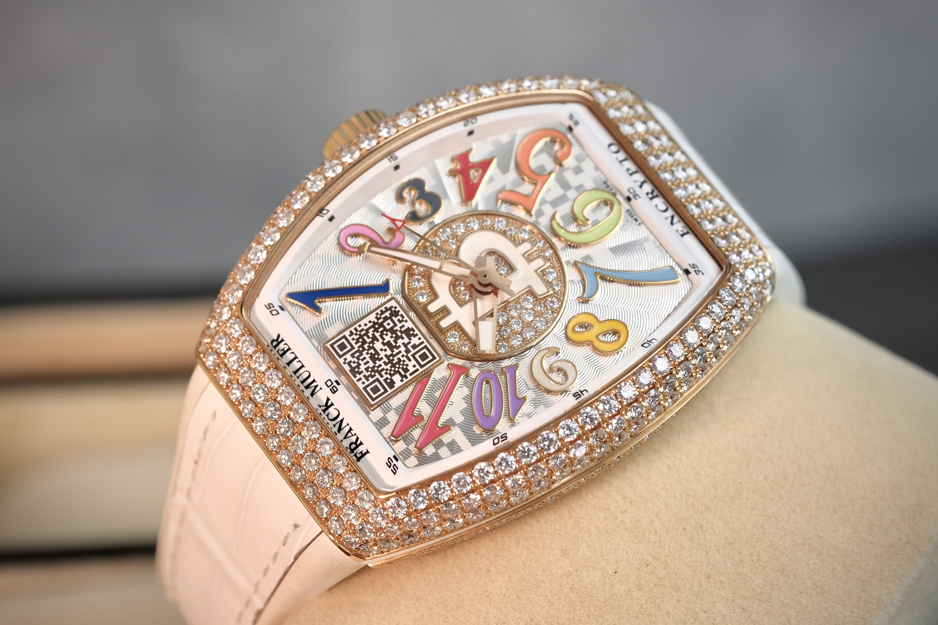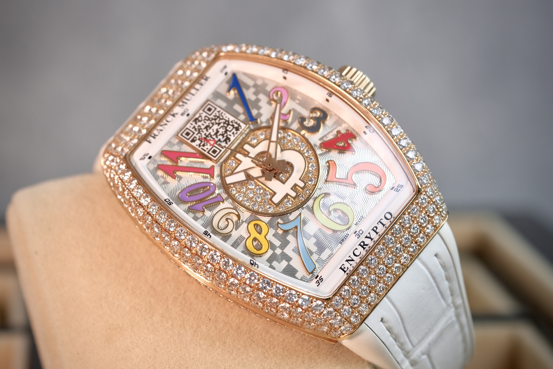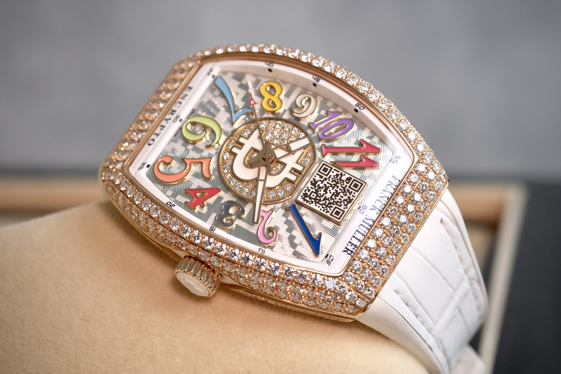 นาฬิกา Unisex ขนาด 33*42mm เหมาะกับข้อมือผู้ชายเอเชีย(ข้อมือไม่เกิน 6.5นิ้ว) และพี่ๆผู้หญิง เป็นรุ่นพิเศษที่ผลิตออกมาน้อยมากเพียง 50 เรือนเท่านั้น ความพิเศษคือจะมี Private Key (ยังไม่ได้แกะใช้งาน) สำหรับพี่ๆที่ครอบครองสกุลเงิน Digital เช่น BTC ที่หน้าปัดมีเลเซอร์ QR Code สามารถเช็คยอดเงิน real time ได้ ในส่วนของเพชร จัดเต็มด้วยงานฝังOriginal setting แบบPAVE 340เม็ด น้ำหนักรวม 6.21CT ตัวเรือนทรงถังเบียร์iconicของFM มาในหน้าปัดสีสันสดใส Color Dreams มากับกลไกระบบ Automatic ถือว่าเป็นเรือนที่คุ้มมากๆ ประหยัดจากป้ายไป 2 ล้าน ช่วงนี้ BTC ทำ ATH รัวๆ พี่ๆนักล่าวาฬไม่ควรพลาดครับ