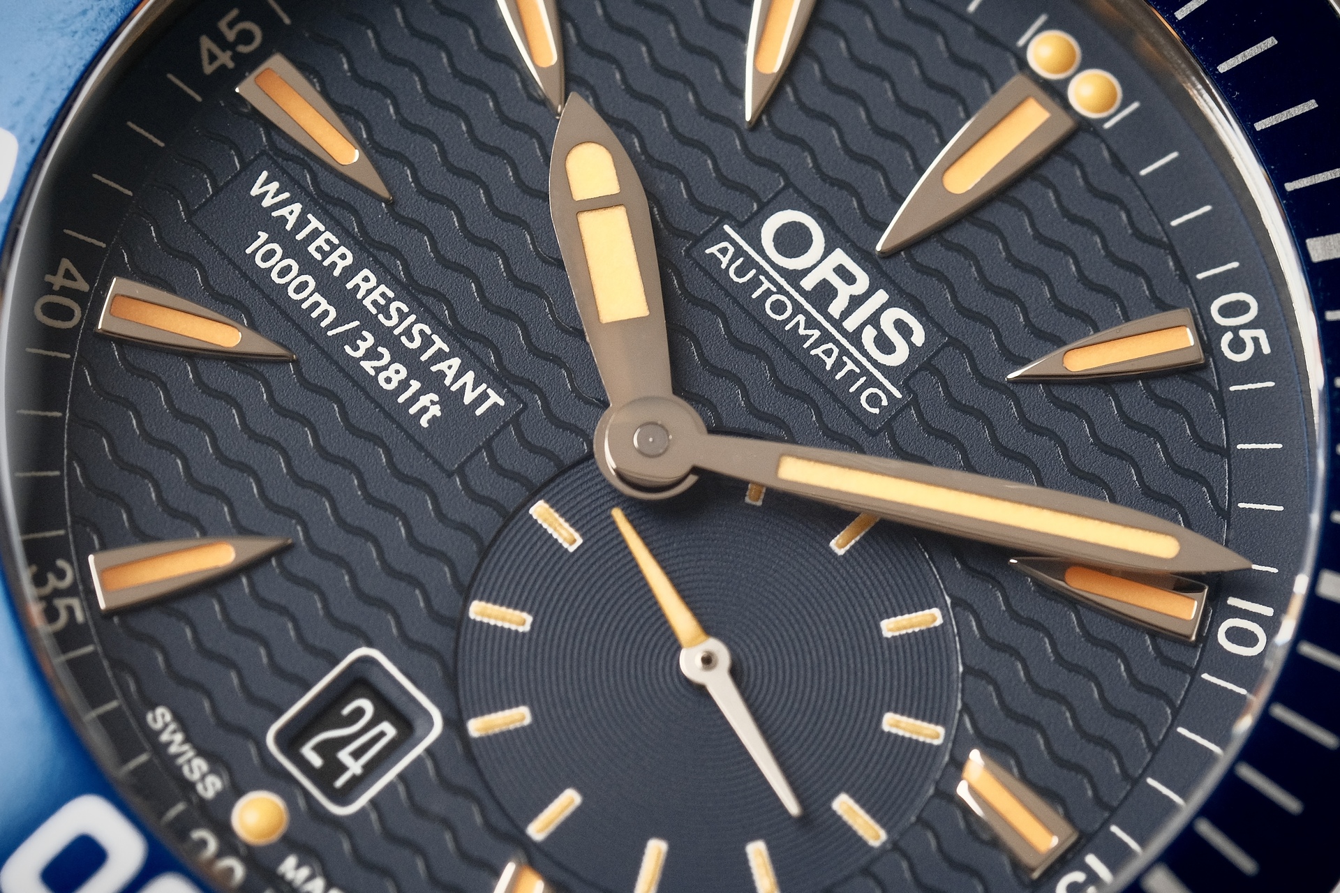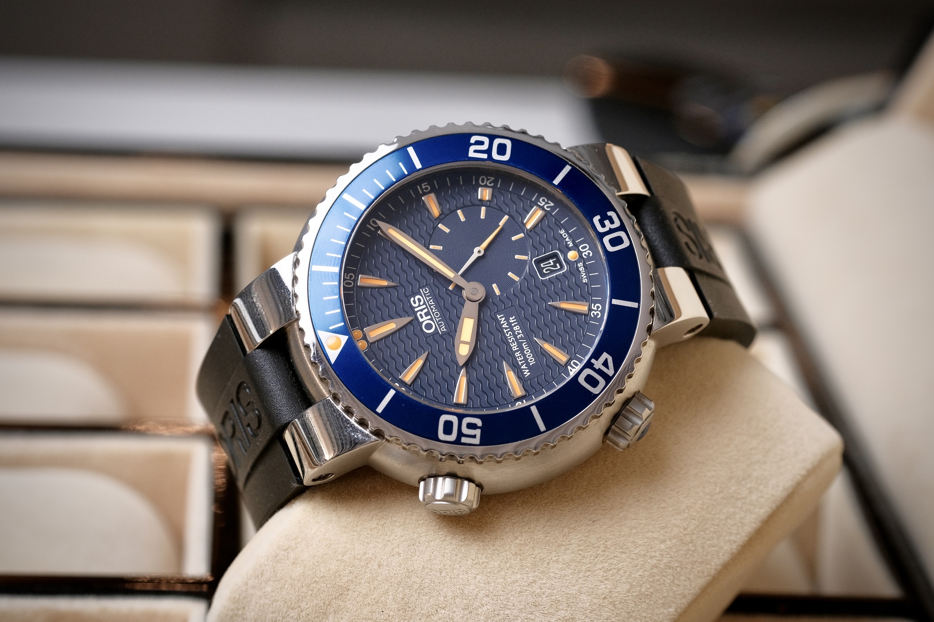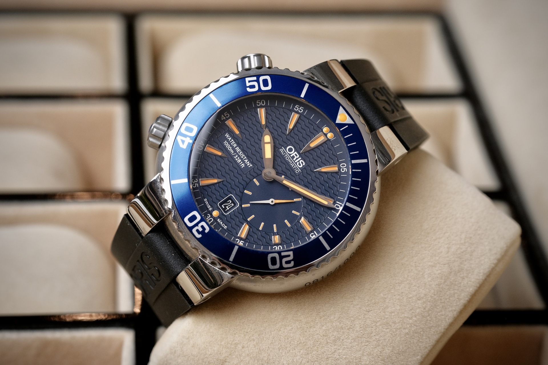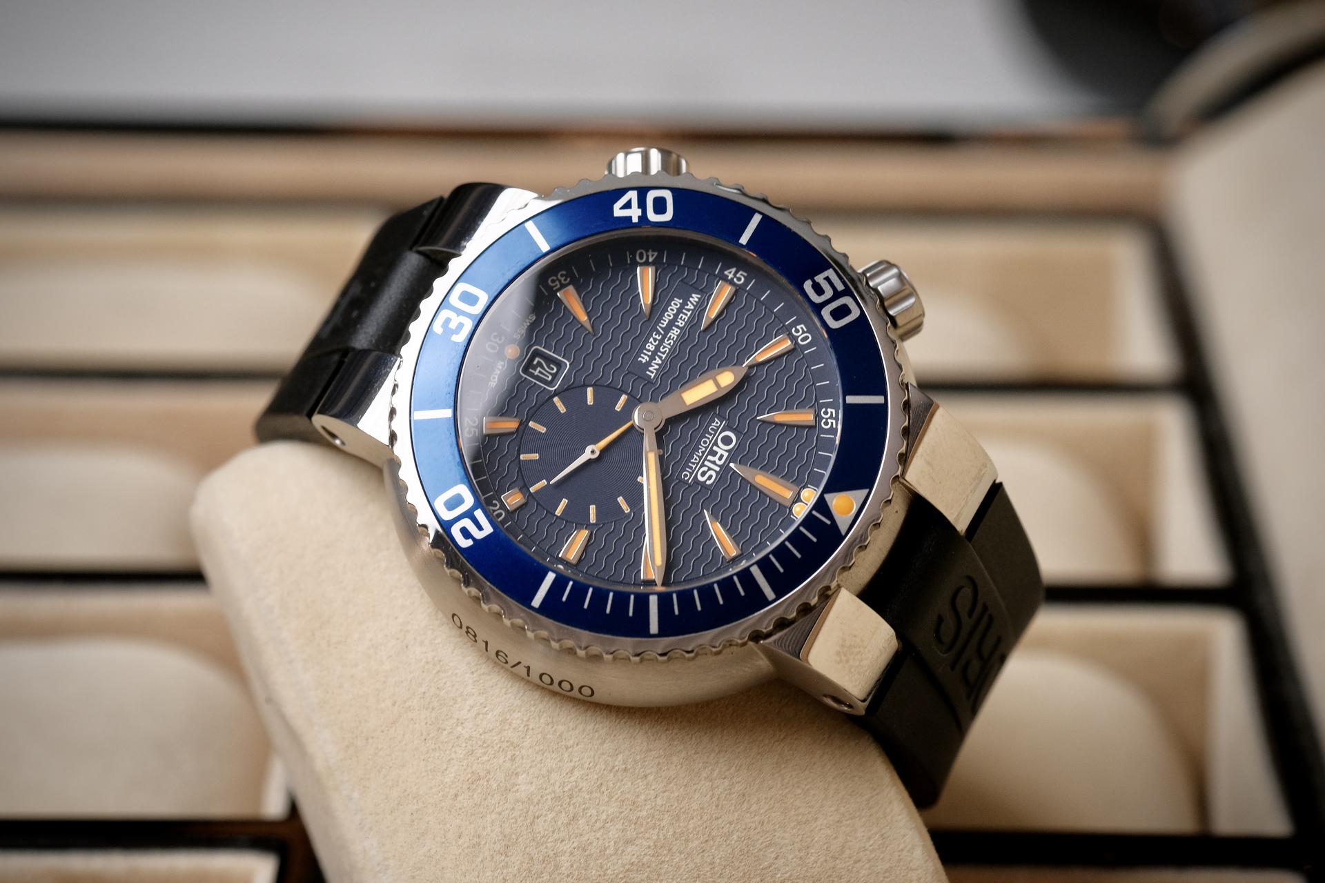 นี่คือ หนึ่งในตำนาน Divers ที่นักสะสมต้องมี กับGBR1 ที่ผลิตเพียง 1000 เรือทั่วโลก ขนาด47mm Lug-to-lug สั้นตามสไตล์ Oris ทำให้คนข้อมือ 6.5-7 นิ้วขึ้นไปใส่ได้สวย ไม่กาง มากับระบบขับซ้าย หน้าปัดWave Pattern สวยงามมีเอกลักษณ์เข้ากับขอบฟิล์มน้ำเงินได้อย่างลงตัว พร้อมความสามารถกันน้ำลึกถึง 1000 เมตร ถือเป็น “เสน่ห์” ของความ Vintage-Modern กลไกระบบ Automatic