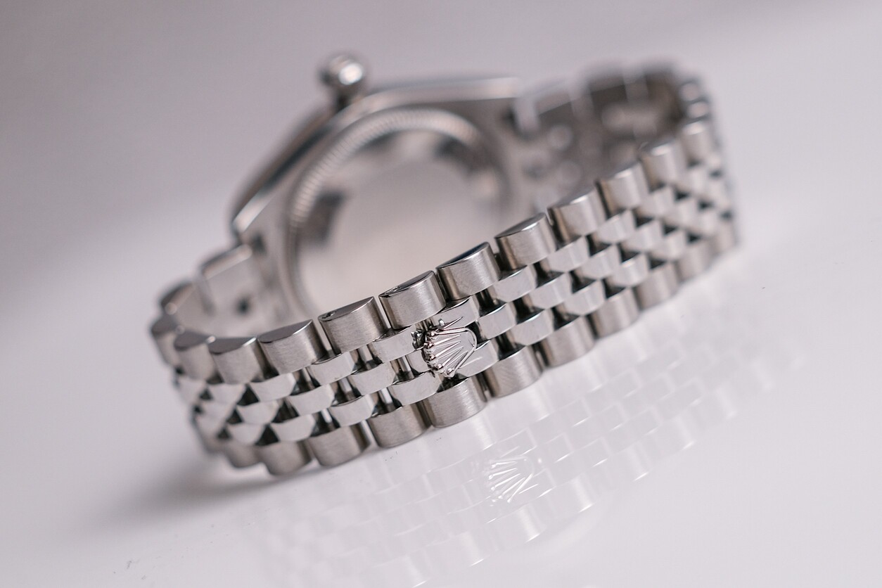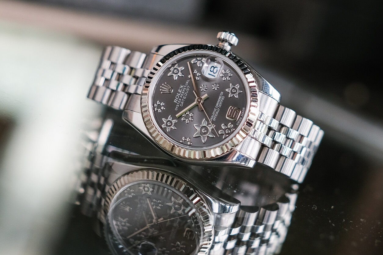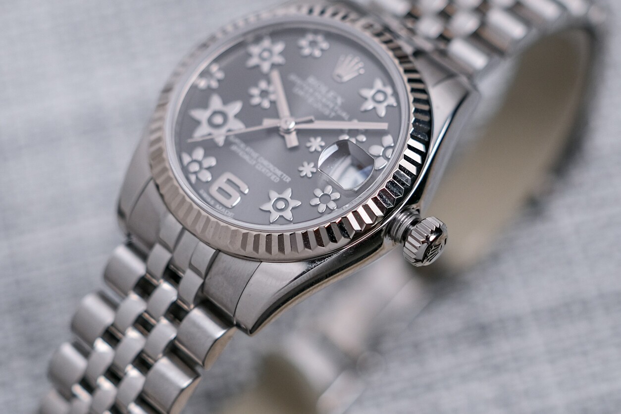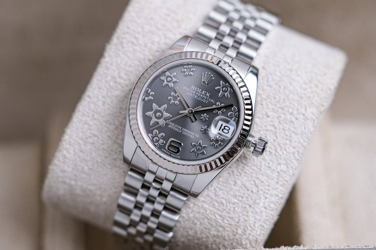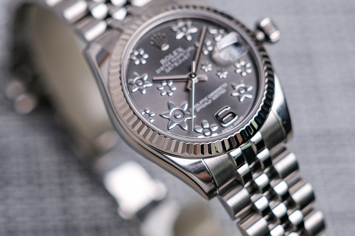 🌸 ขนาด 31mm. หน้าปัด Dark Rhodium Sakura สีเทาเข้มลายดอกไม้สวยงามไม่เหมือนใคร ขอบหยักทองคำขาว 18K สะท้อนแสง สาย Jubilee ให้ลุคหรูหราครับ