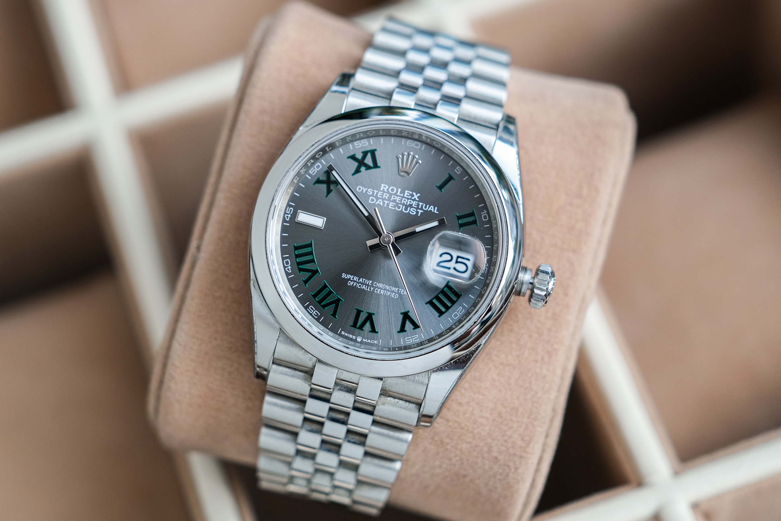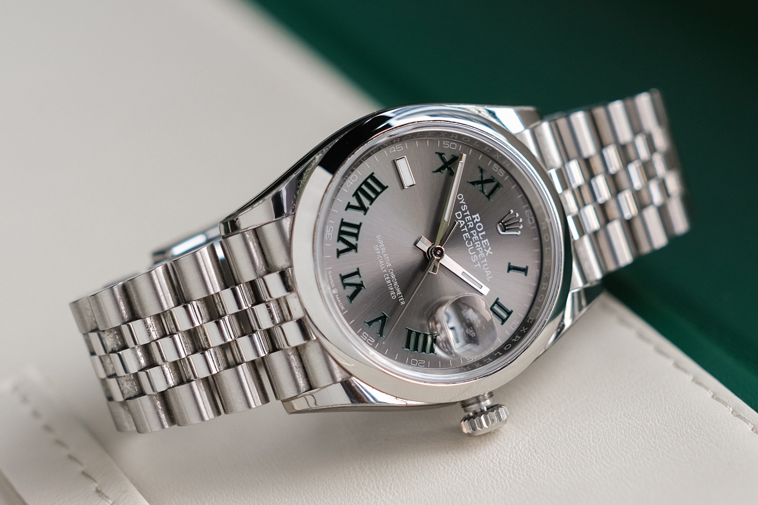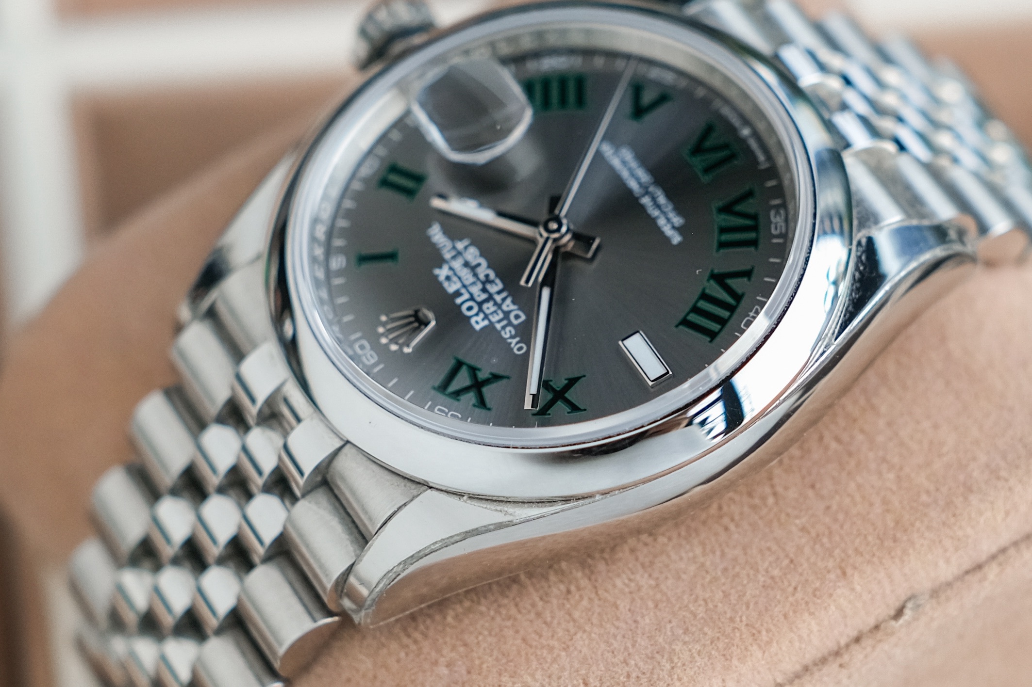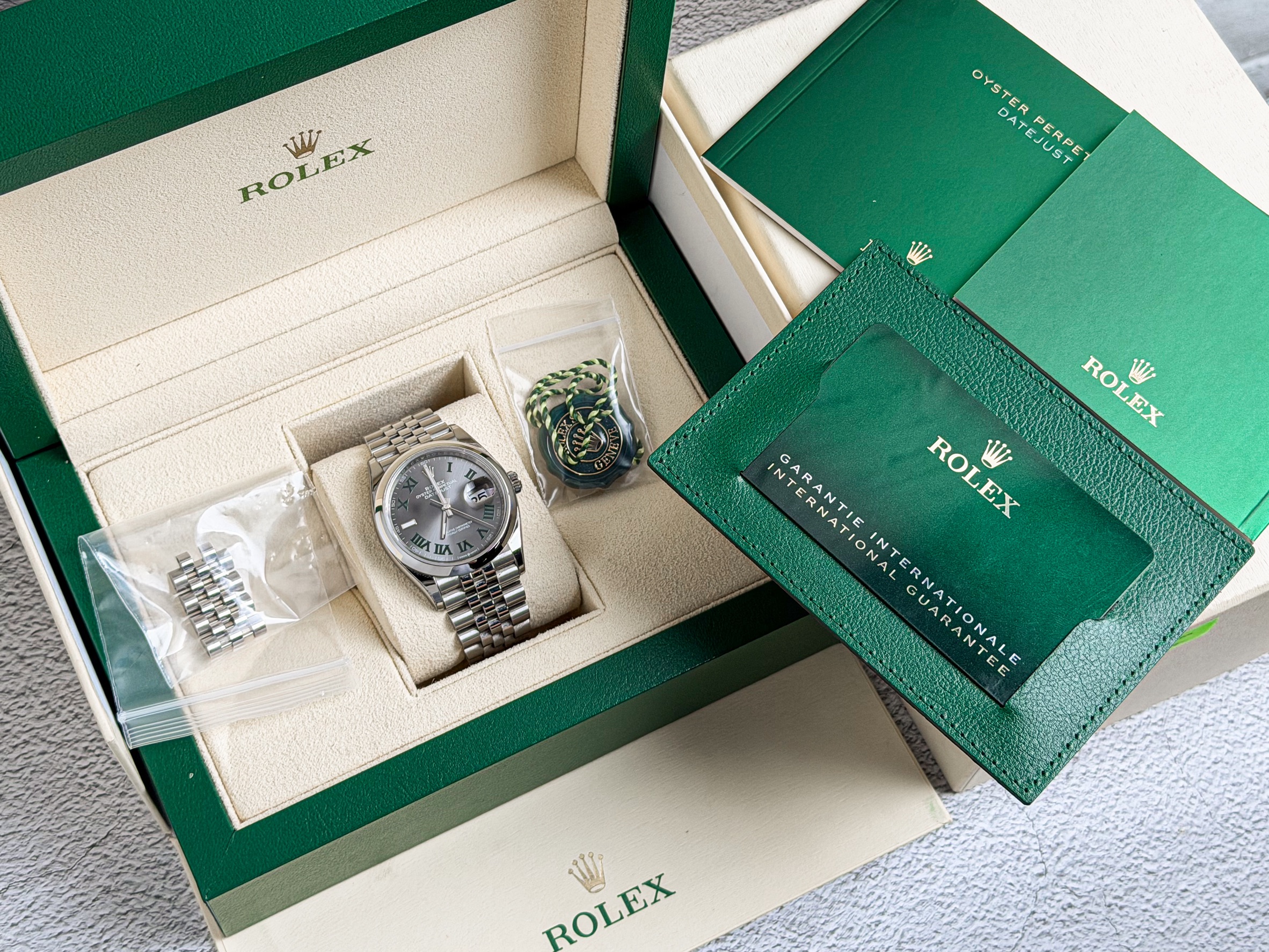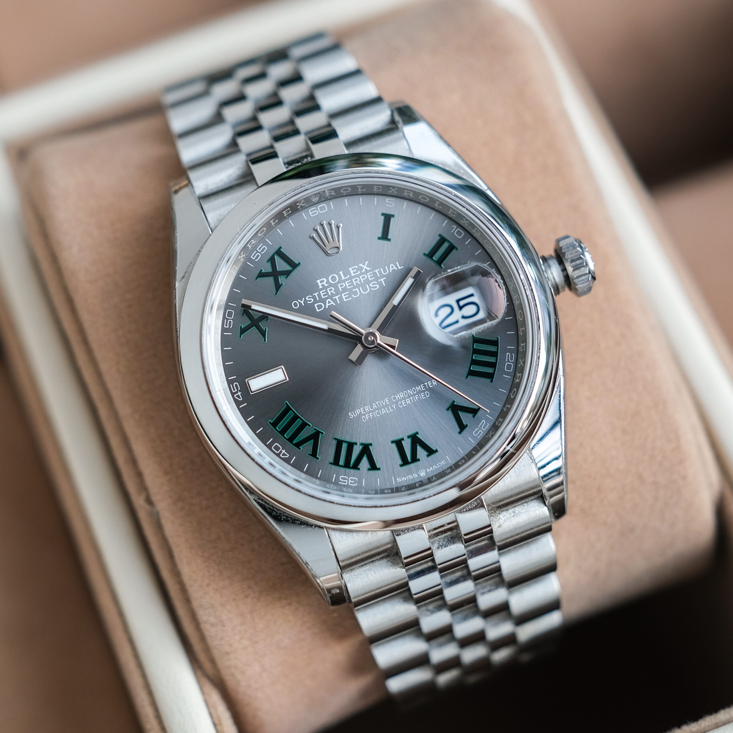 ✨ ขนาด 36mm พิเศษ Wimbledon Dial สีเทา เล่นแสงสวยๆ หลักโรมันดำเขียวทนงสปอร์ต ตัวเรือน Steel ขอบเรียบ สาย Jubilee หรูมากๆ มีช่องวันที่ เครื่อง Automatic โฉมปัจจุบัน บัคเคิลใหม่ครับ