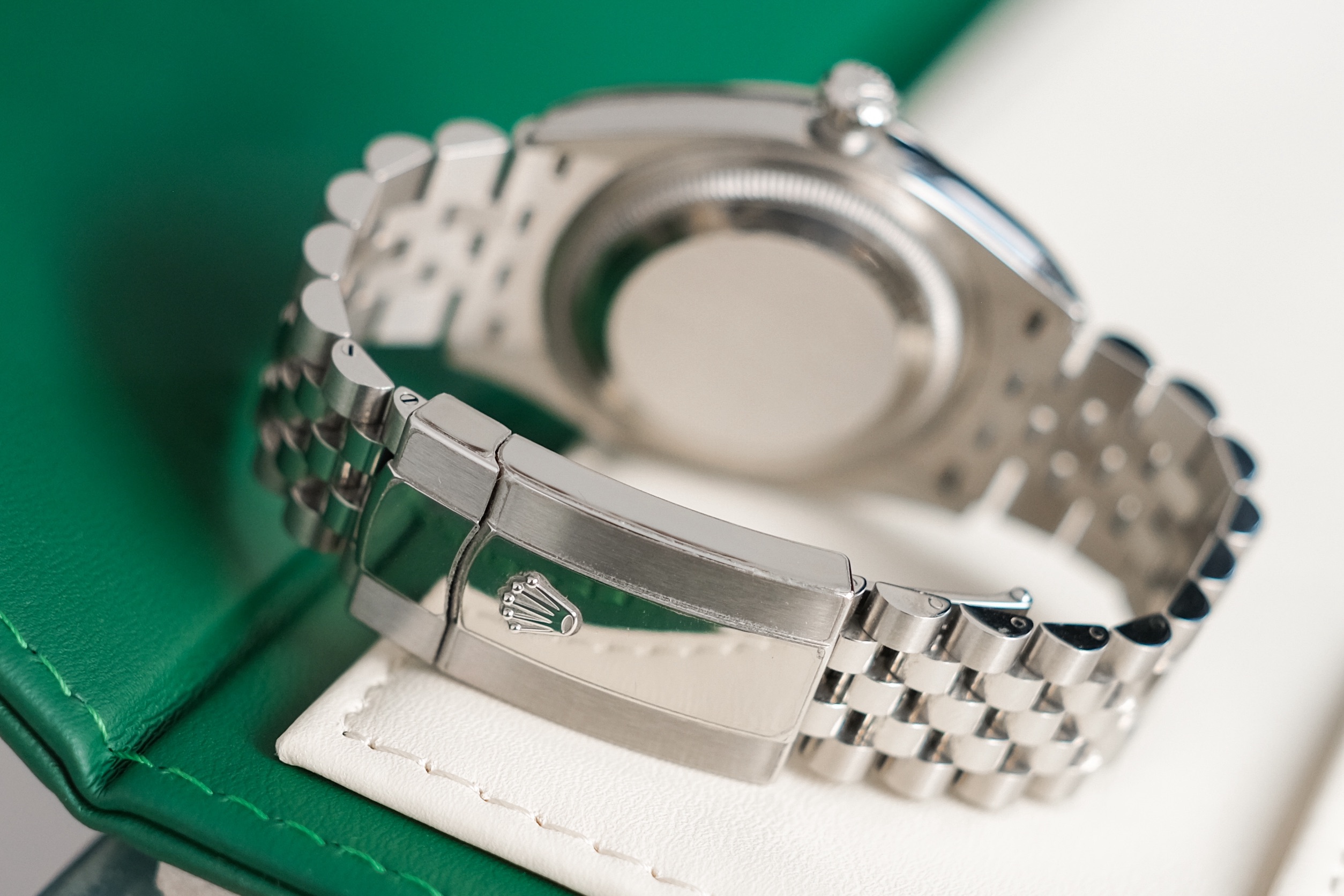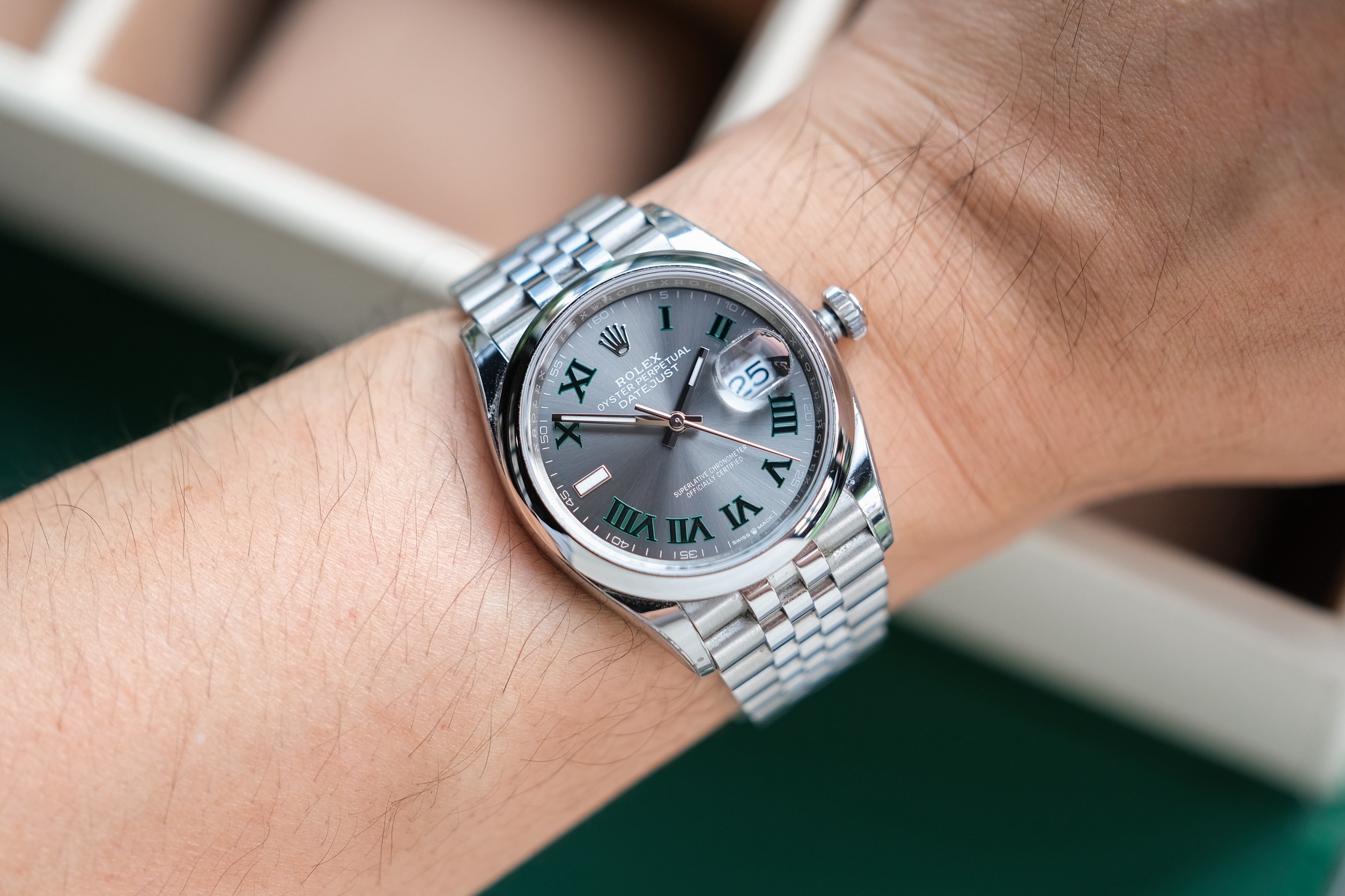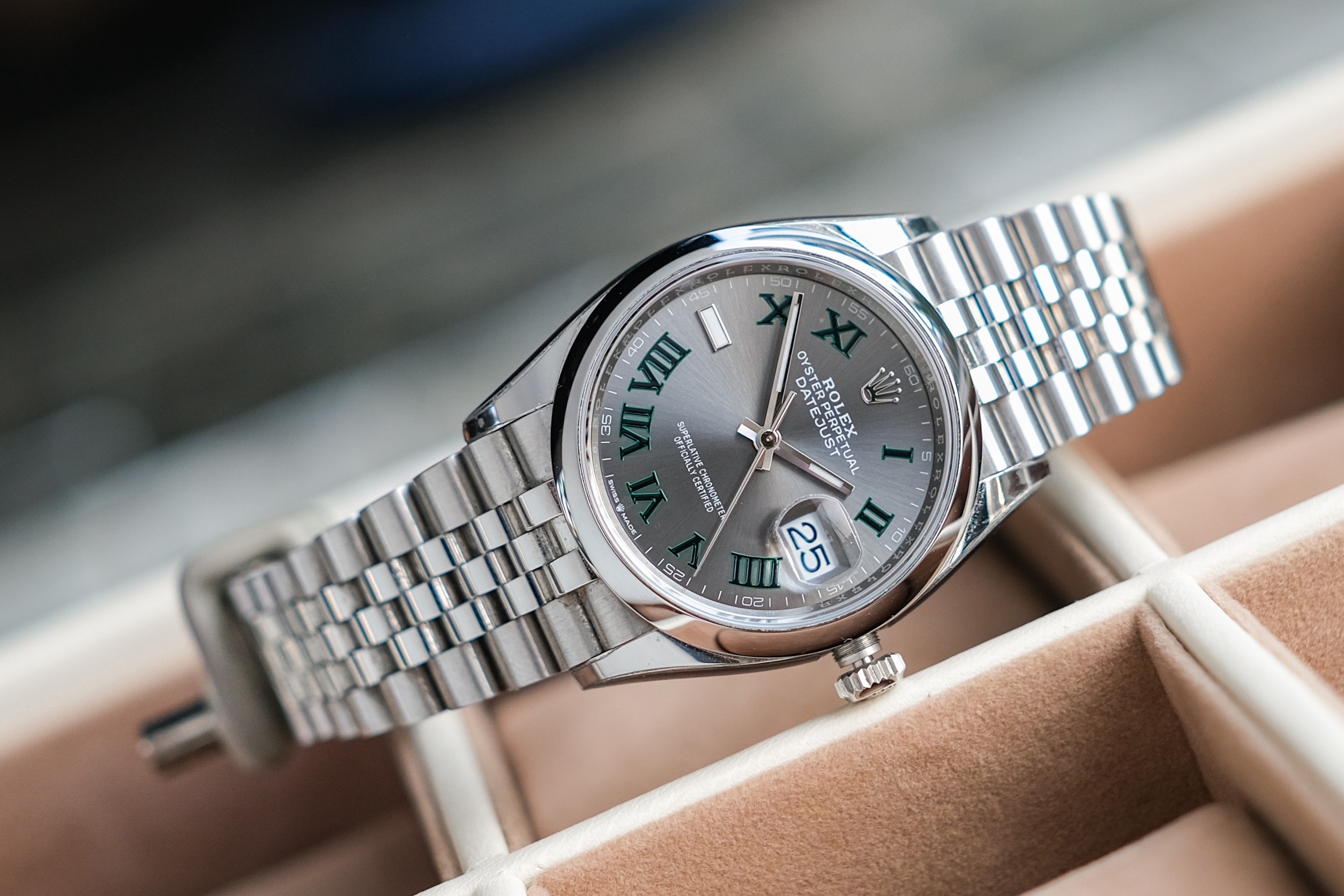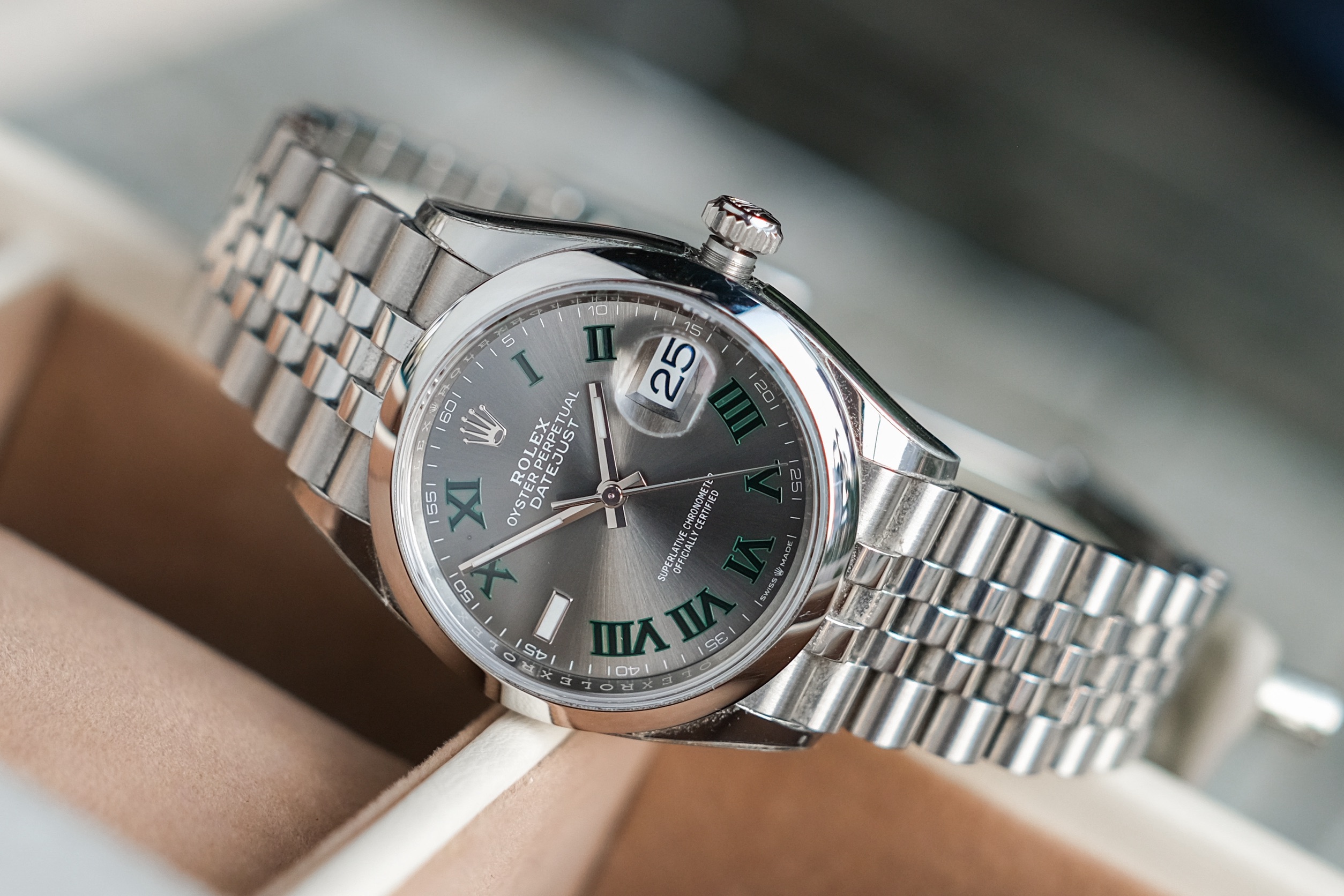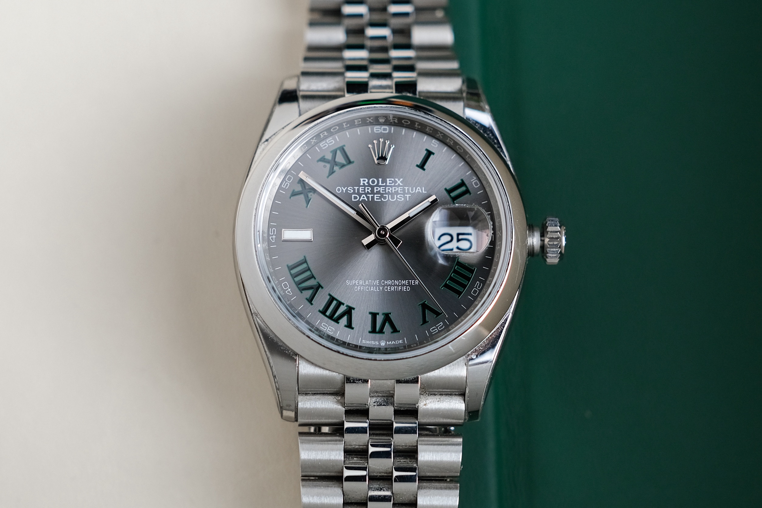 ✨ ขนาด 36mm พิเศษ Wimbledon Dial สีเทา เล่นแสงสวยๆ หลักโรมันดำเขียวทนงสปอร์ต ตัวเรือน Steel ขอบเรียบ สาย Jubilee หรูมากๆ มีช่องวันที่ เครื่อง Automatic โฉมปัจจุบัน บัคเคิลใหม่ครับ