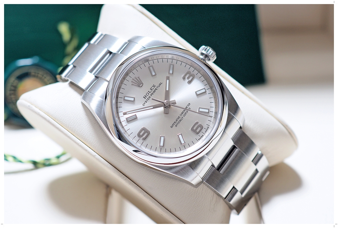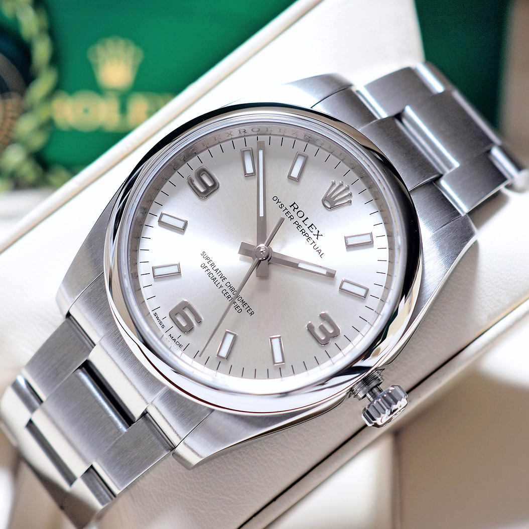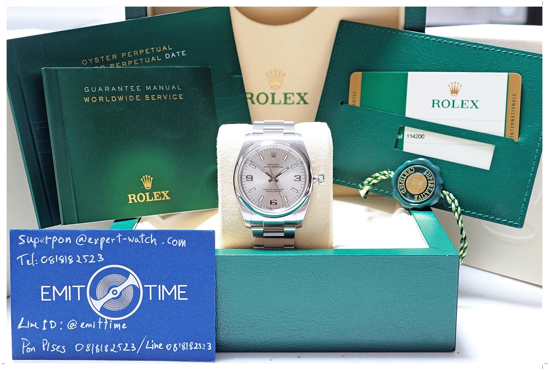 Very Like New!! Rolex Oyster Perpetual OP34 Silver 34mm ref.114200 ตัดสายนอนเซฟ เจ้าของมือเดียว แทบไม่ได้ใส่ใช้งาน สวยเดิมไม่เคยขัด! รอยขนแมวแทบหาไม่เจอ ไร้รอยหนัก แทบไม่ต่างกับของใหม่ กระจกไร้ริ้วรอย ขนาดตัวเรือน 34mm เป็น Sweet Spot สำหรับ Unisex ใส่สวยทั้งผู้หญิงและผู้ชายข้อมือเล็ก (Price List ล่าสุดสูงถึง 231,100 บาท) ใบไทย Siam Swiss Y-2016 Full-Set ครบยันฝาครอบเบเซล -159,000 บาท-