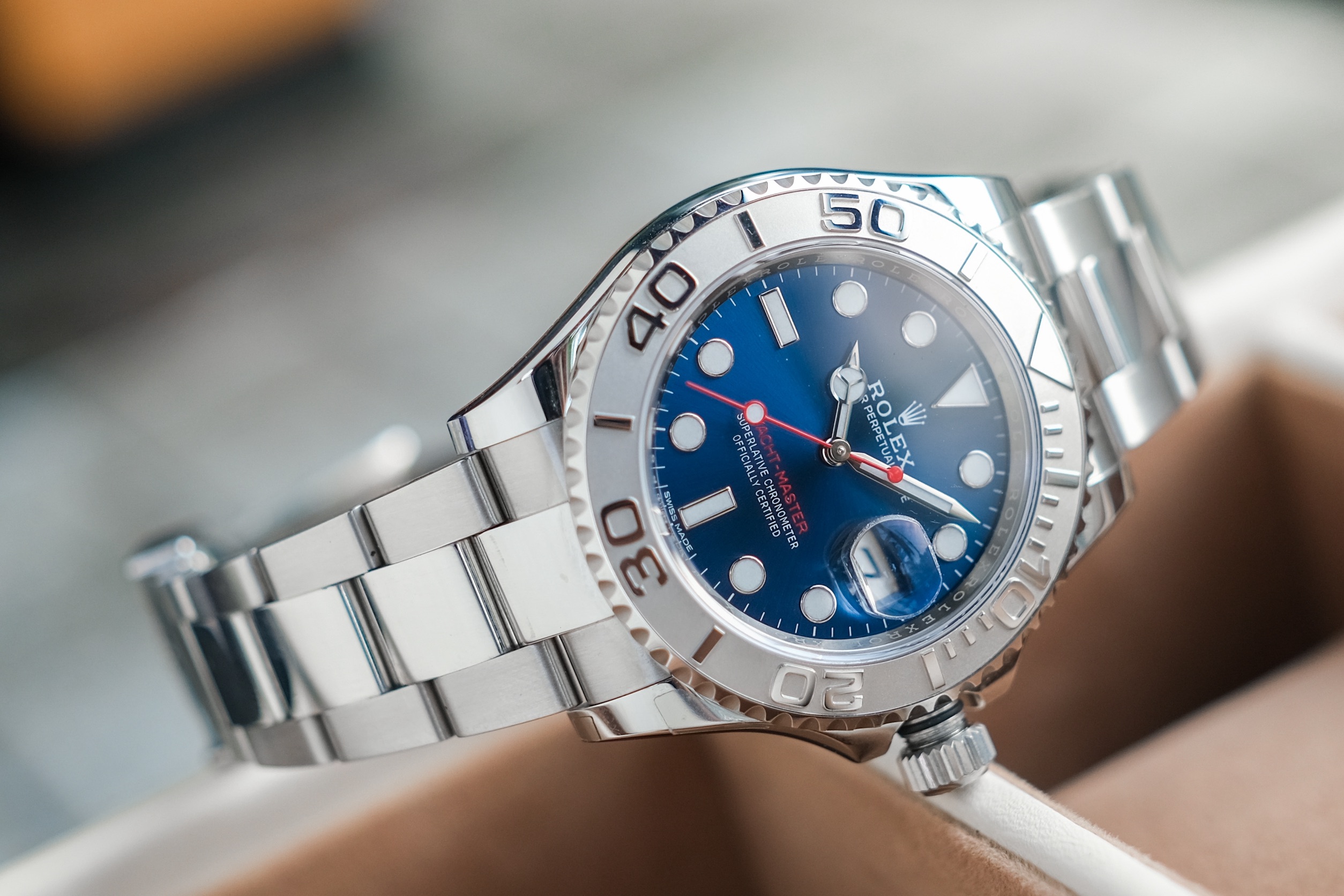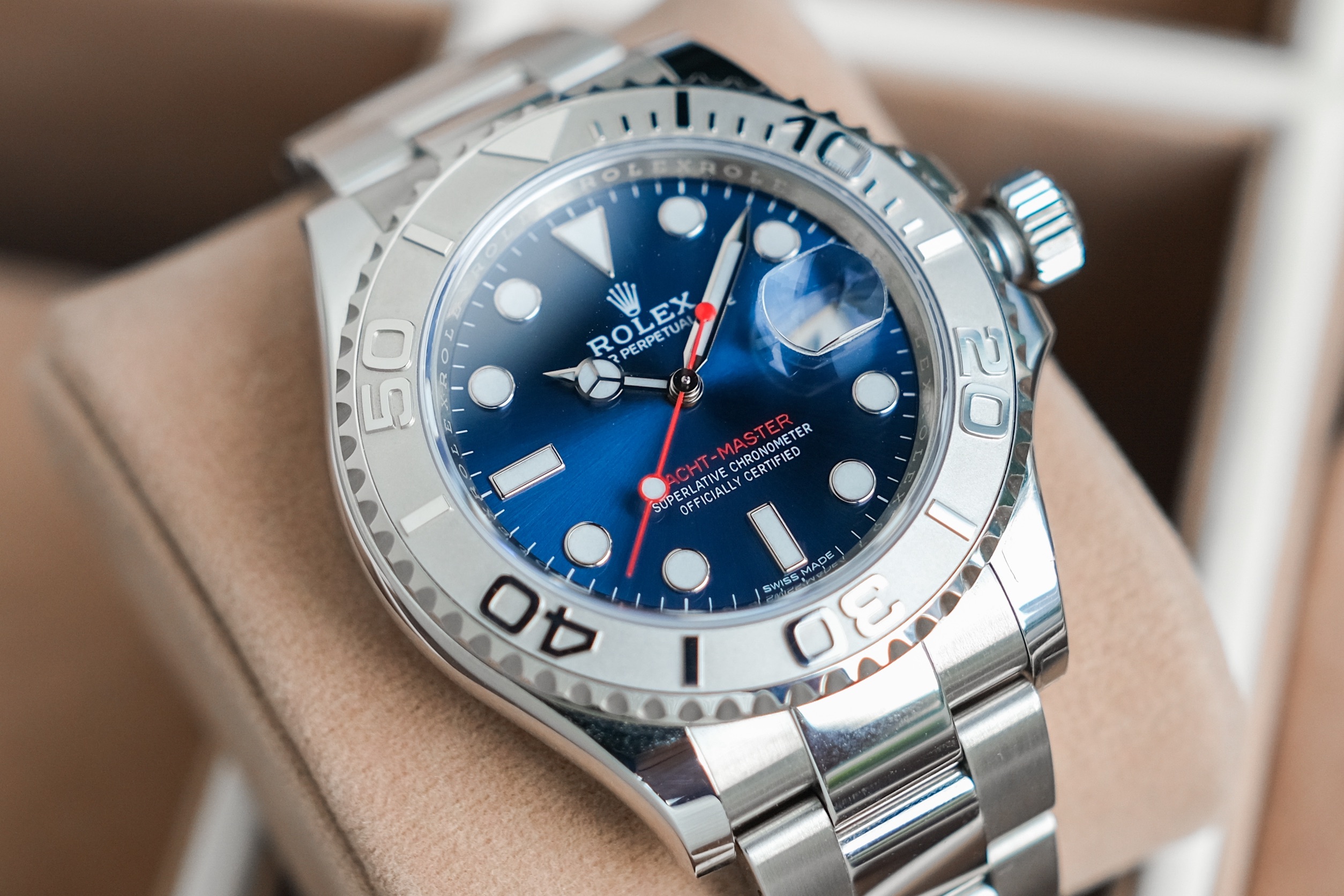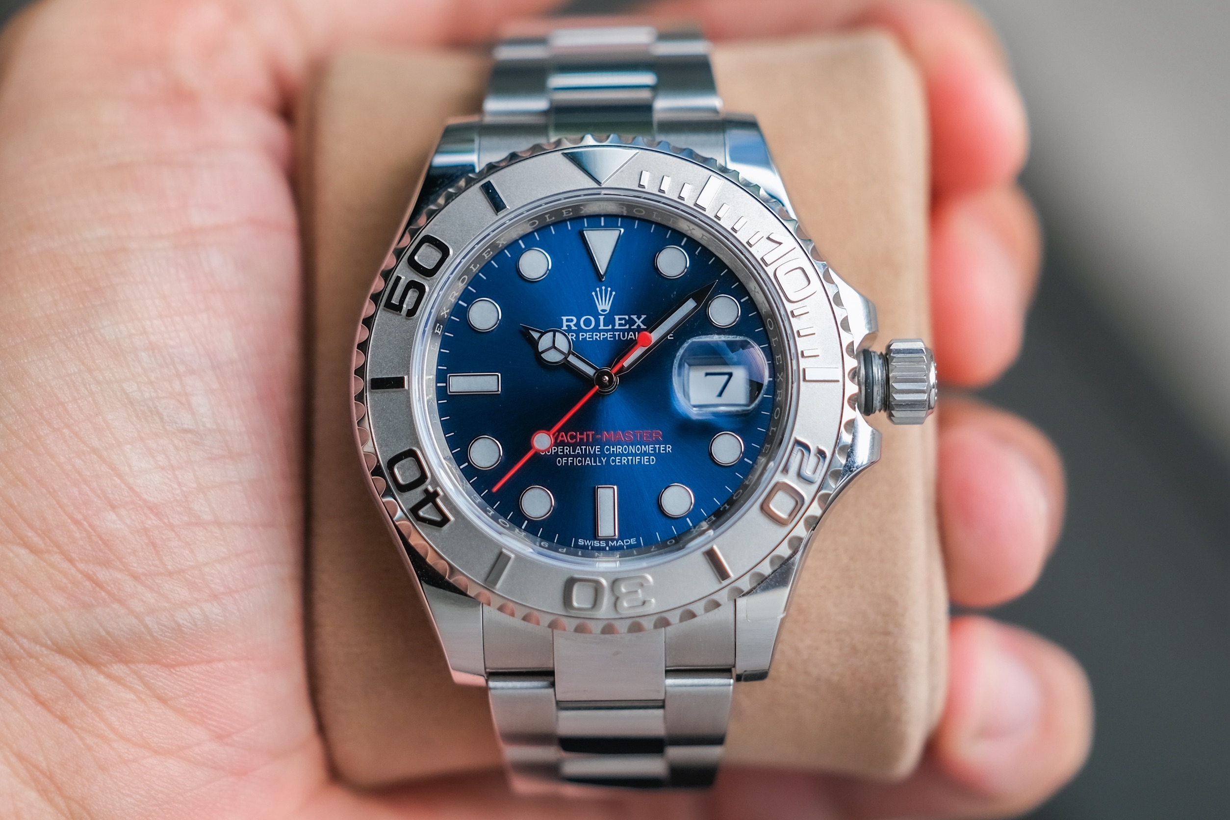 ✨ ขนาด 40mm หน้าปัด Bright Blue Sunburst Dial ตัดเข็มแดงทรง Sport มาพร้อมช่องวันที่ และไฮไลท์คือขอบเบเซิลเป็น Platinum ผิวทรายสวยงาม สายเต้าหู้ข้อเงาสลับด้าน เครื่อง Automatic Cal. 3135