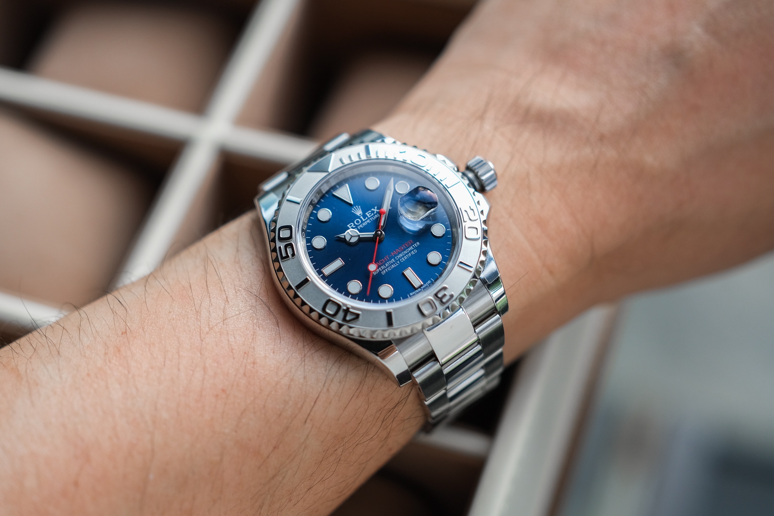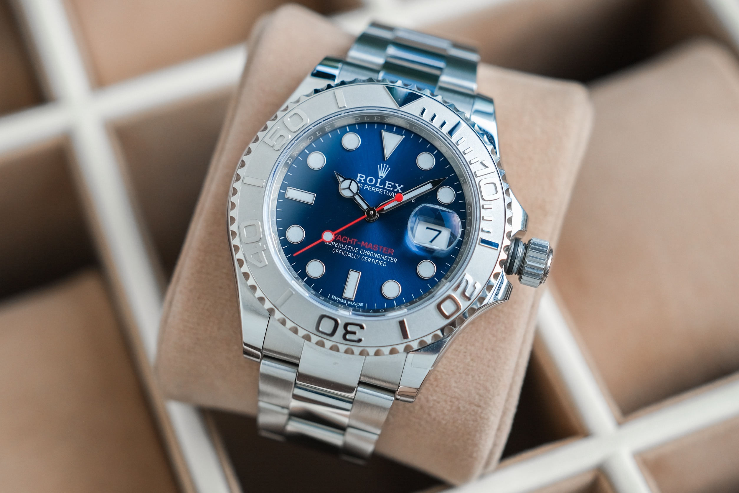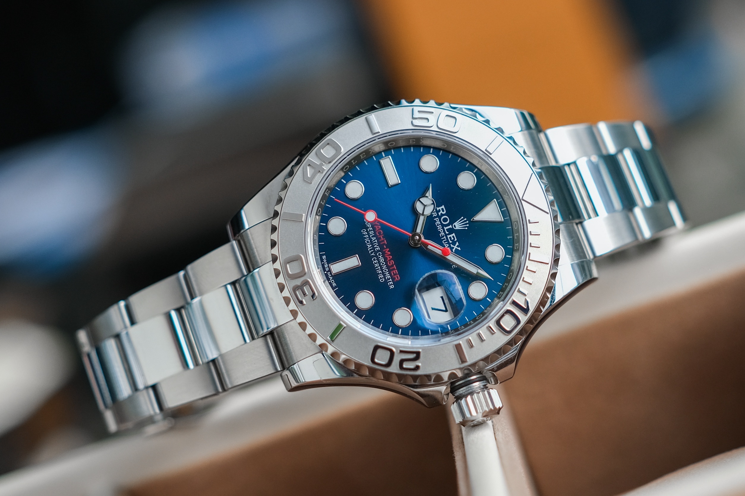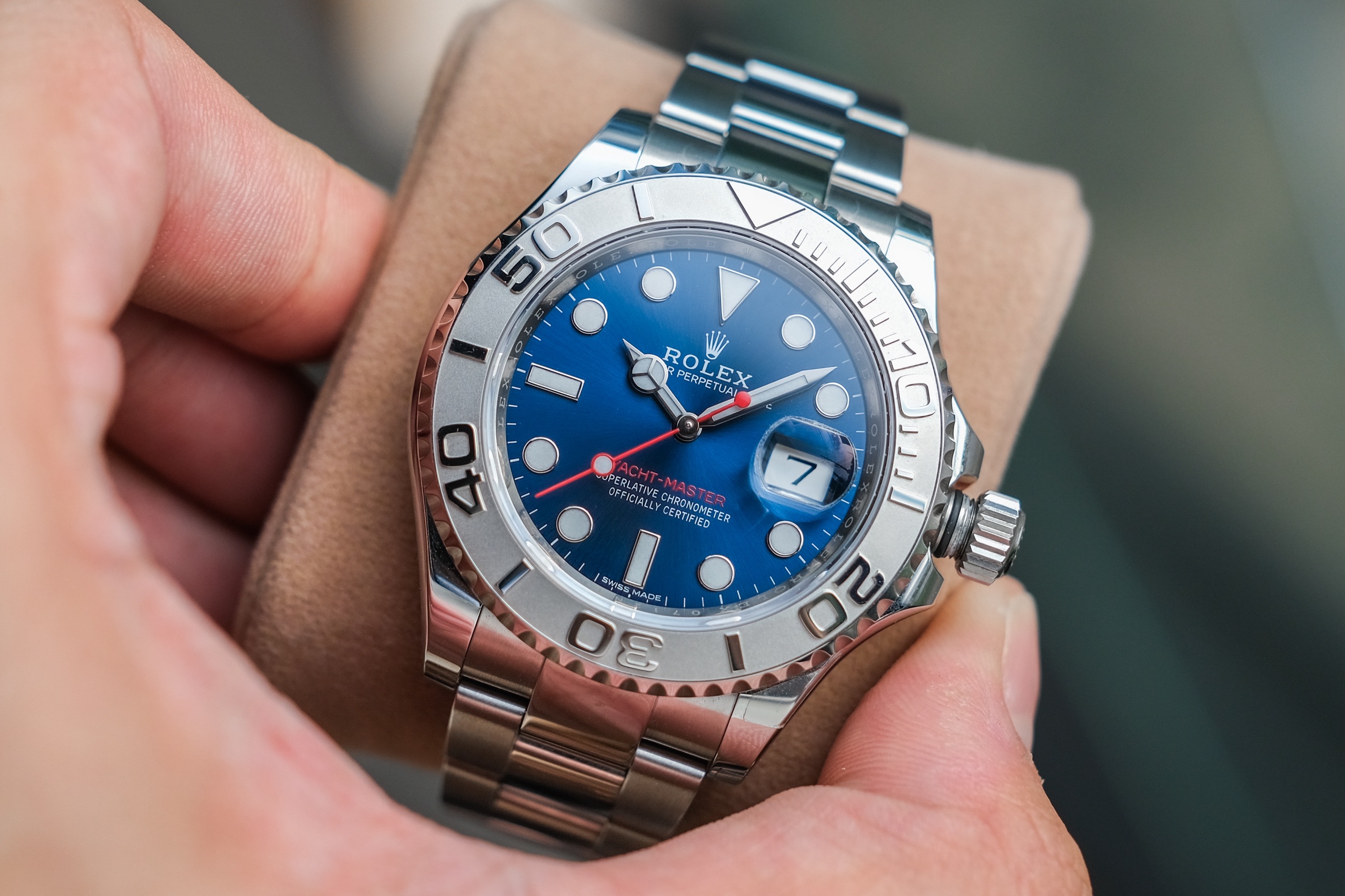 ✨ ขนาด 40mm หน้าปัด Bright Blue Sunburst Dial ตัดเข็มแดงทรง Sport มาพร้อมช่องวันที่ และไฮไลท์คือขอบเบเซิลเป็น Platinum ผิวทรายสวยงาม สายเต้าหู้ข้อเงาสลับด้าน เครื่อง Automatic Cal. 3135