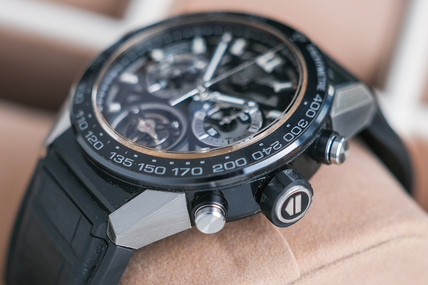 ✨ ขนาด 45mm. หน้าปัด Skeleton Dial มาพร้อมฟังก์ชันจับเวลา Chronograph และ พระเอกของเรือนอย่างกลไก Flying Tourbillon ที่โดดเด่นเป็นสง่ากลางหน้าปัด ขอบเบเซิล Ceramic รมดำ ตัวเรือนคมกริบด้วยวัสดุ Titanium เบาสบาย ด้านหลังเปลือยโชว์กลไก Calibre Heuer02T COSC สายหนังจระเข้ดำด้านมาดเข้มเลยครับ