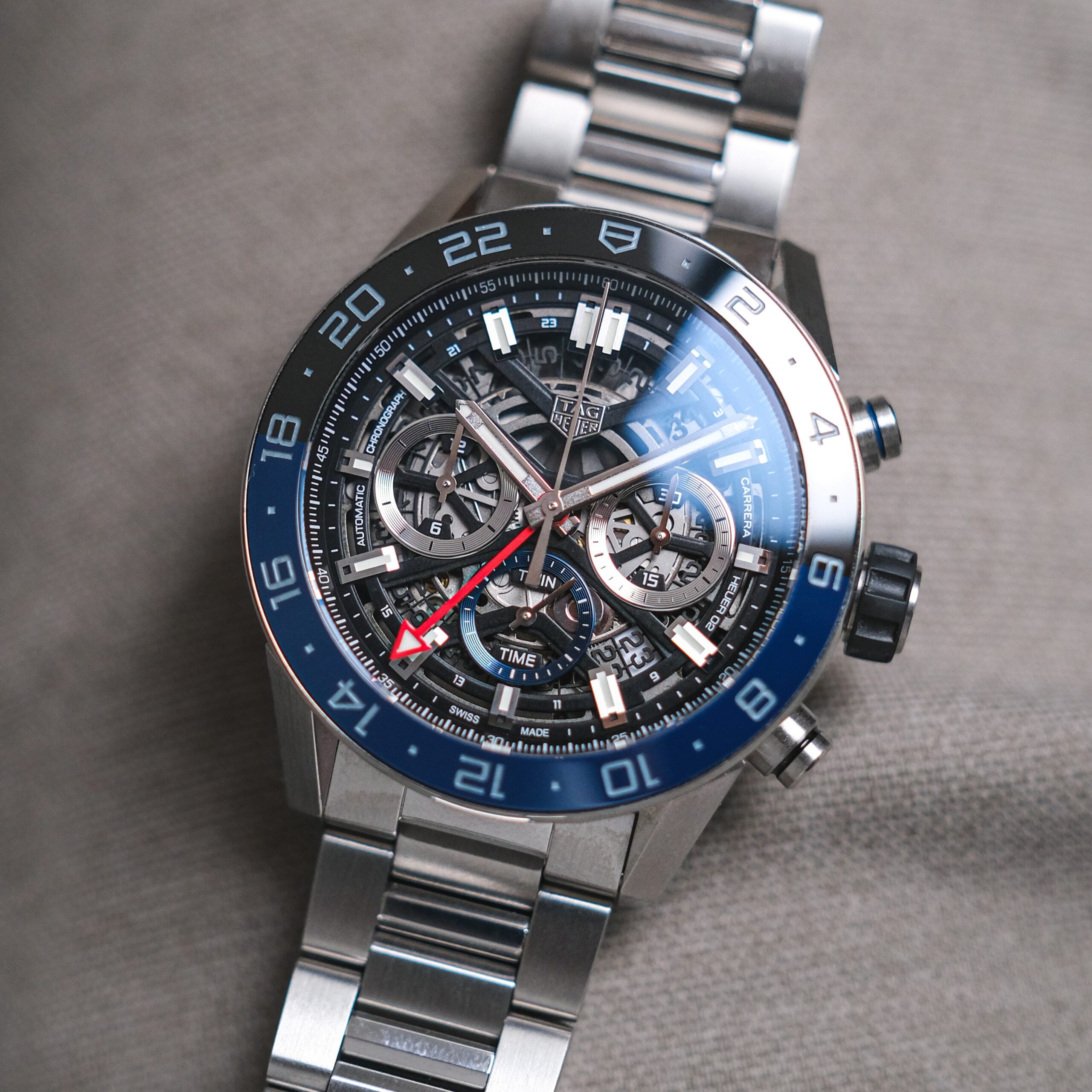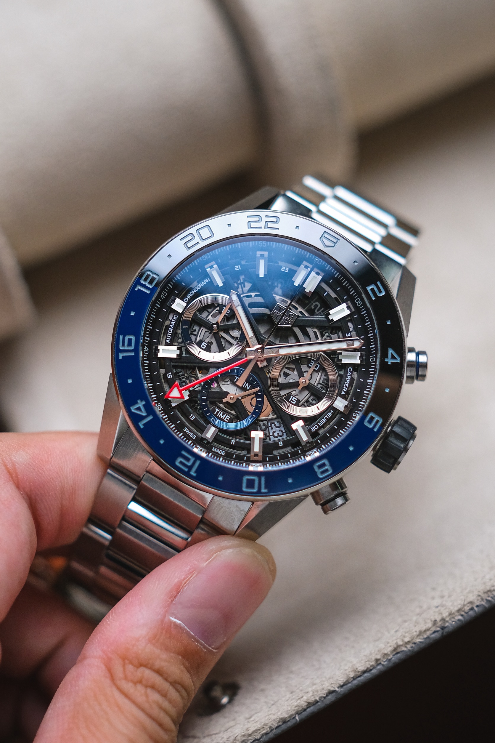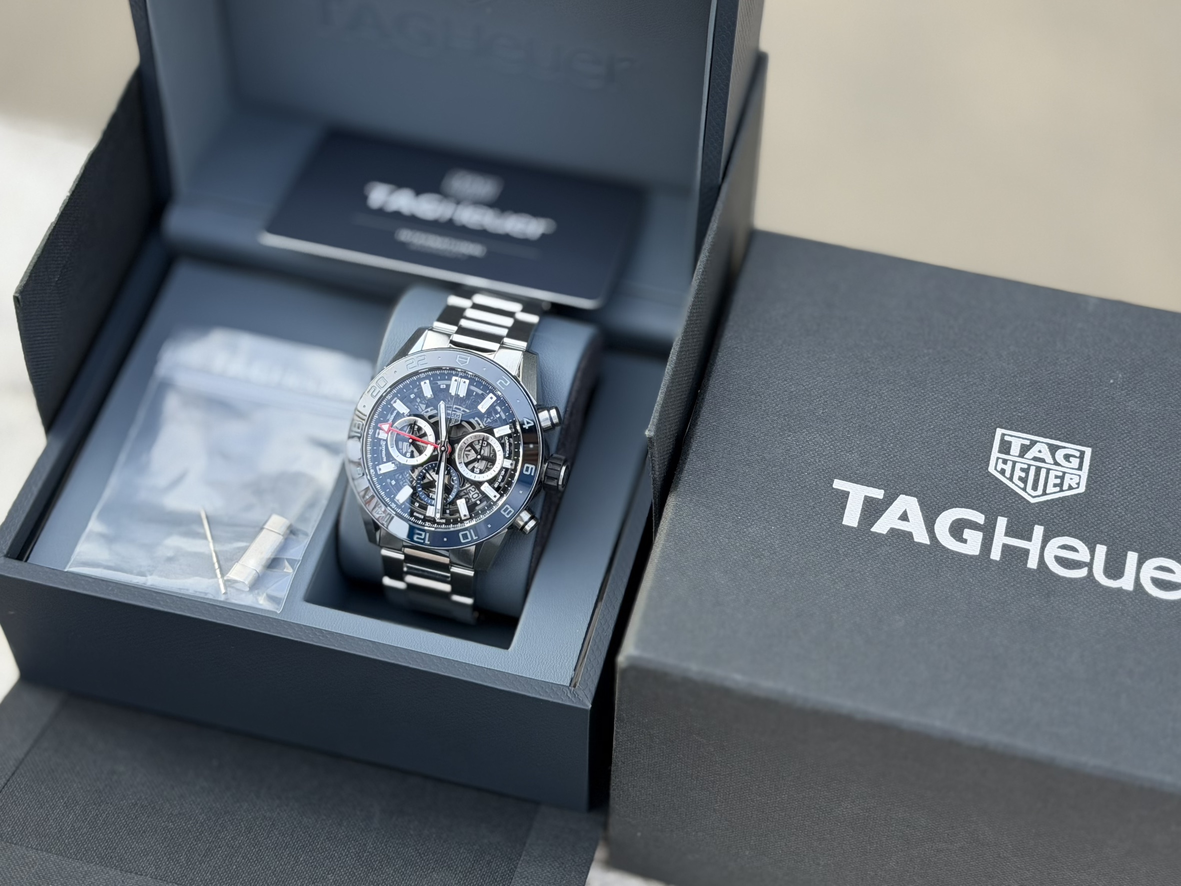 💙 ขนาด 45 mm ตัวเรือน Steel ขอบ Ceramic 2 โทน น้ำเงิน/ดำ สไตล์ “Batman” หน้าปัด Skeleton Open-worked เผยกลไกชัดเต็มตา ขับเคลื่อนด้วย Calibre Heuer 02 In-house Chronograph สำรองพลังงาน 80 ชั่วโมง ฟังก์ชันครบ Chronograph + GMT เข็มแดง + Date กันน้ำ 100 เมตร มาพร้อมสาย Steel ลุคสปอร์ตเต็มตัว