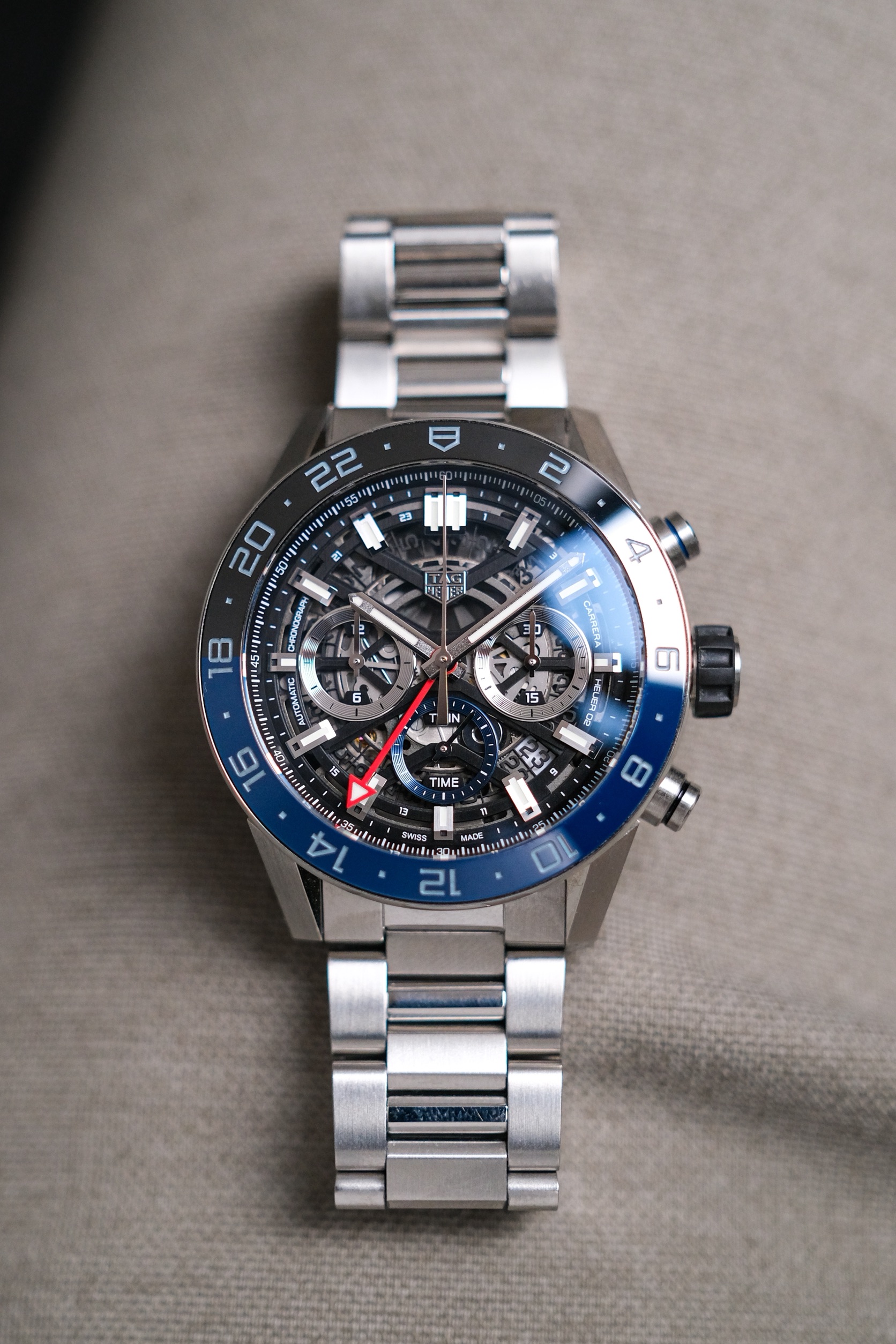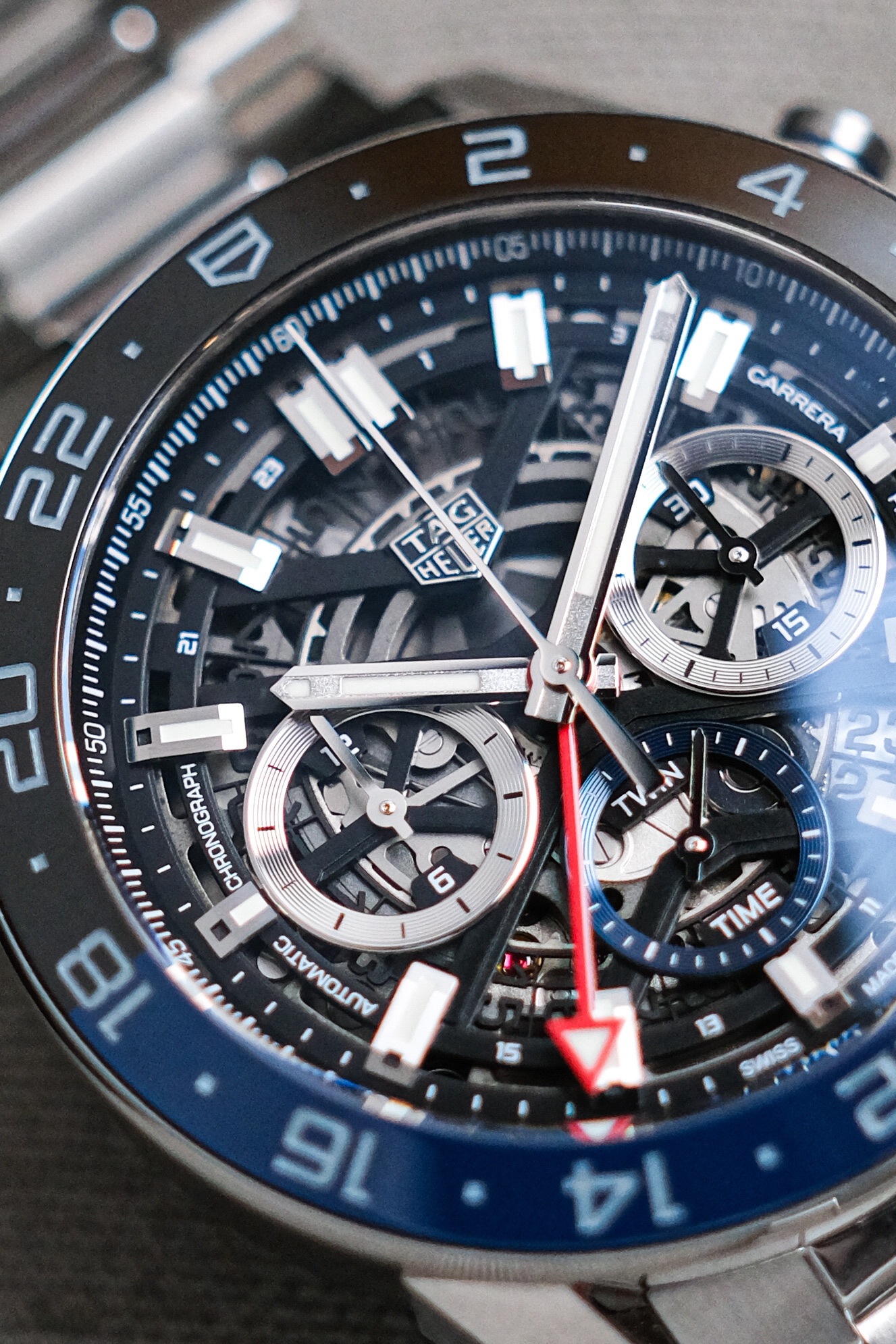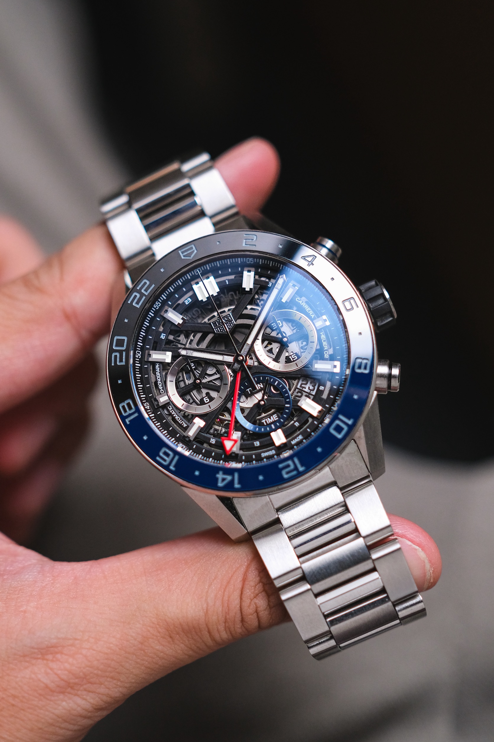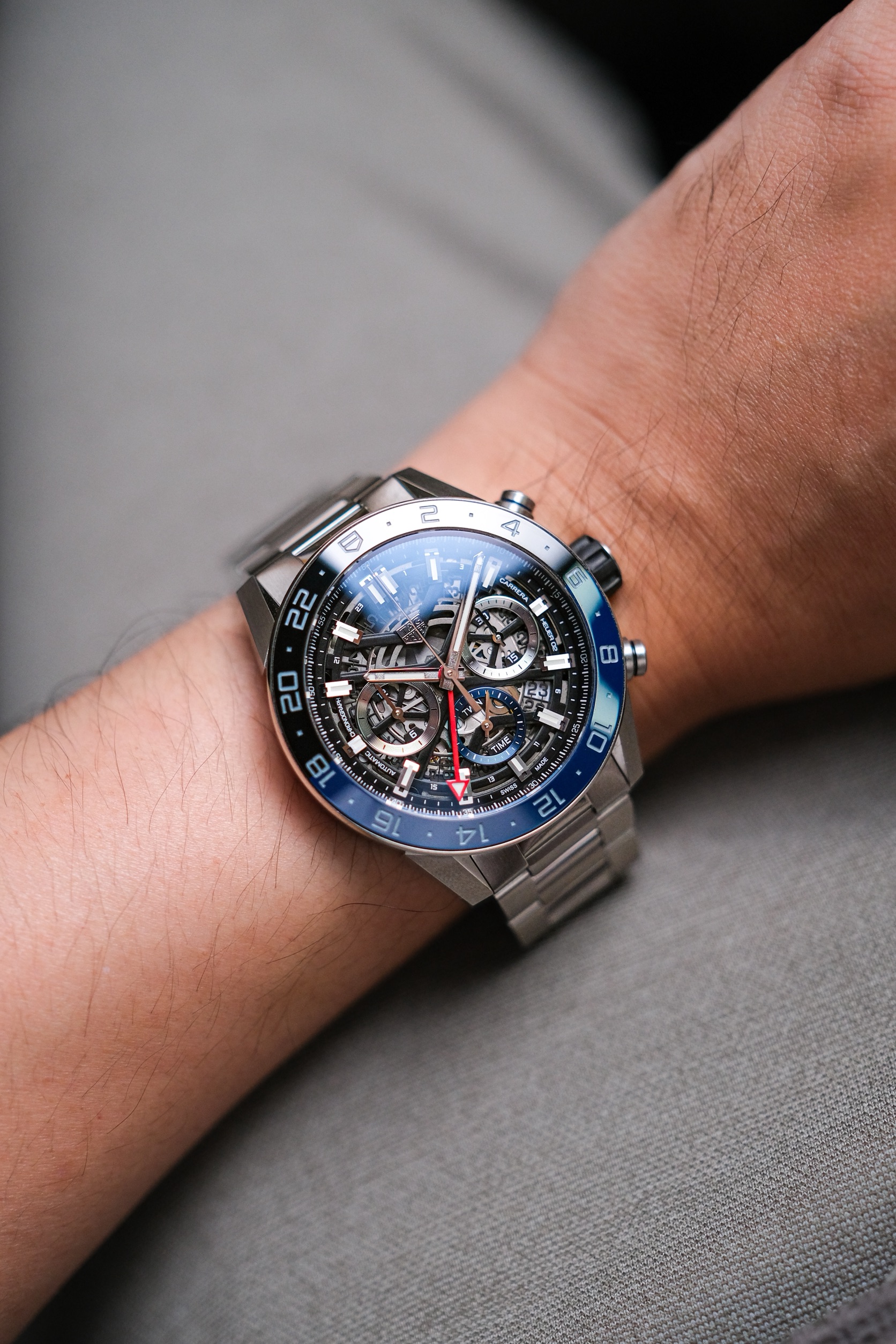 💙 ขนาด 45 mm ตัวเรือน Steel ขอบ Ceramic 2 โทน น้ำเงิน/ดำ สไตล์ “Batman” หน้าปัด Skeleton Open-worked เผยกลไกชัดเต็มตา ขับเคลื่อนด้วย Calibre Heuer 02 In-house Chronograph สำรองพลังงาน 80 ชั่วโมง ฟังก์ชันครบ Chronograph + GMT เข็มแดง + Date กันน้ำ 100 เมตร มาพร้อมสาย Steel ลุคสปอร์ตเต็มตัว
